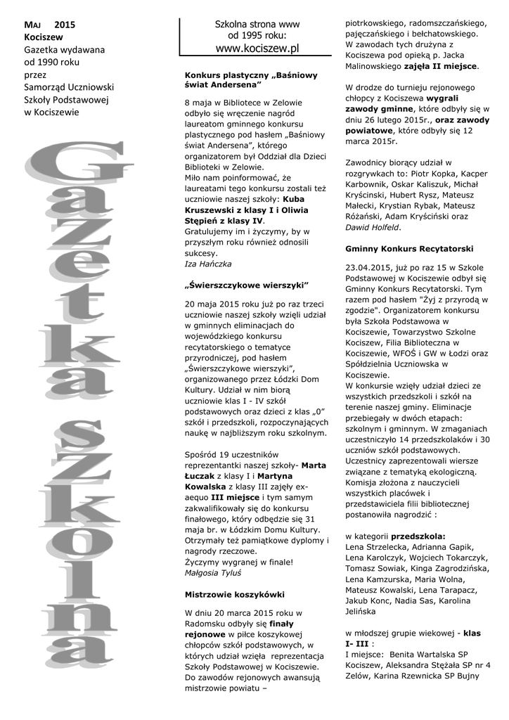 MAJ 2015 Kociszew Gazetka wydawana od 1990 roku przez Samorząd Uczniowski Szkoły Podstawowej w Kociszewie Szkolna strona www od 1995 roku: www.kociszew.pl Konkurs plastyczny „Baśniowy świat Andersena” 8 maja w Bibliotece w Zelowie odbyło się wręczenie nagród laureatom gminnego konkursu plastycznego pod hasłem „Baśniowy świat Andersena”, którego organizatorem był Oddział dla Dzieci Biblioteki w Zelowie. Miło nam poinformować, że laureatami tego konkursu zostali też uczniowie naszej szkoły: Kuba Kruszewski z klasy I i Oliwia Stępień z klasy IV. Gratulujemy im i życzymy, by w przyszłym roku również odnosili sukcesy. Iza Hańczka „Świerszczykowe wierszyki” 20 maja 2015 roku już po raz trzeci uczniowie naszej szkoły wzięli udział w gminnych eliminacjach do wojewódzkiego konkursu recytatorskiego o tematyce przyrodniczej, pod hasłem „Świerszczykowe wierszyki”, organizowanego przez Łódzki Dom Kultury. Udział w nim biorą uczniowie klas I - IV szkół podstawowych oraz dzieci z klas „0” szkół i przedszkoli, rozpoczynających naukę w najbliższym roku szkolnym. Spośród 19 uczestników reprezentantki naszej szkoły- Marta Łuczak z klasy I i Martyna Kowalska z klasy III zajęły exaequo III miejsce i tym samym zakwalifikowały się do konkursu finałowego, który odbędzie się 31 maja br. w Łódzkim Domu Kultury. Otrzymały też pamiątkowe dyplomy i nagrody rzeczowe. Życzymy wygranej w finale! Małgosia Tyluś Mistrzowie koszykówki W dniu 20 marca 2015 roku w Radomsku odbyły się finały rejonowe w piłce koszykowej chłopców szkół podstawowych, w których udział wzięła reprezentacja Szkoły Podstawowej w Kociszewie. Do zawodów rejonowych awansują mistrzowie powiatu – piotrkowskiego, radomszczańskiego, pajęczańskiego i bełchatowskiego. W zawodach tych drużyna z Kociszewa pod opieką p. Jacka Malinowskiego zajęła II miejsce. W drodze do turnieju rejonowego chłopcy z Kociszewa wygrali zawody gminne, które odbyły się w dniu 26 lutego 2015r., oraz zawody powiatowe, które odbyły się 12 marca 2015r. Zawodnicy biorący udział w rozgrywkach to: Piotr Kopka, Kacper Karbownik, Oskar Kaliszuk, Michał Kryścinski, Hubert Rysz, Mateusz Małecki, Krystian Rybak, Mateusz Różański, Adam Kryściński oraz Dawid Holfeld. Gminny Konkurs Recytatorski 23.04.2015, już po raz 15 w Szkole Podstawowej w Kociszewie odbył się Gminny Konkurs Recytatorski. Tym razem pod hasłem "Żyj z przyrodą w zgodzie". Organizatorem konkursu była Szkoła Podstawowa w Kociszewie, Towarzystwo Szkolne Kociszew, Filia Biblioteczna w Kociszewie, WFOŚ i GW w Łodzi oraz Spółdzielnia Uczniowska w Kociszewie. W konkursie wzięły udział dzieci ze wszystkich przedszkoli i szkół na terenie naszej gminy. Eliminacje przebiegały w dwóch etapach: szkolnym i gminnym. W zmaganiach uczestniczyło 14 przedszkolaków i 30 uczniów szkół podstawowych. Uczestnicy zaprezentowali wiersze związane z tematyką ekologiczną. Komisja złożona z nauczycieli wszystkich placówek i przedstawiciela filii bibliotecznej postanowiła nagrodzić : w kategorii przedszkola: Lena Strzelecka, Adrianna Gapik, Lena Karolczyk, Wojciech Tokarczyk, Tomasz Sowiak, Kinga Zagrodzińska, Lena Kamzurska, Maria Wolna, Mateusz Kowalski, Lena Tarapacz, Jakub Konc, Nadia Sas, Karolina Jelińska w młodszej grupie wiekowej - klas I- III : I miejsce: Benita Wartalska SP Kociszew, Aleksandra Stężała SP nr 4 Zelów, Karina Rzewnicka SP Bujny Szlacheckie, Julia Rogozińska SP nr 2 Zelów II miejsce: Martyna Kowalska SP Kociszew, Dominika Tosik SP Bujny Szlacheckie, Marta Łuczak SP Kociszew, III miejsce: Emilia Błoch SP nr 4 Zelów w grupie klas IV – VI I miejsce : Paulina Ornafel SP Wygiełzów, Paulina Grzegórska SP nr 4 Zelów II miejsce: Małgorzata Tyluś SP Kociszew, Zofia Berbelska SP nr 2 Zelów III miejsce: Maja Frątczak SP Bujny Szlacheckie, Rozalia Małecka SP nr 4 Zelów Wszyscy uczniowie otrzymali dyplomy i nagrody książkowe, zaś laureaci nagrody rzeczowe. I miejsce: Patrycja Grzesiak, Nikola Zielińska, Kamila Chełmik II miejsce: Angelika Chełmik, Adam Trębacz III miejsce: Natalia Uzarczyk, Daria Chelmik, Kacper Mielczarek. W konkursie multimedialnym brali udział uczniowie naszej placówki. Uczniowie klas młodszych wykonali przepiękne fotografie, natomiast klasy starsze miały za zadanie wykonać prezentacje multimedialne ukazujące piękno naszego regionu. Spośród zgłoszonych prac wyłoniono zwycięzców. W kategorii I – II nagrody dostali: Igor Kryściński i Nikodem Rybak. W kategorii III – IV: Magdalena Witowska, Oliwia Stepień , Hanna Kołodziejska, Maryna Kowalska z uczestników konkursu nagrodę rzeczową. Gratulujemy. Wiktoria Filipczak „English Grammar Practice” 9 kwietnia 2015 roku uczniowie naszej szkoły – Nikodem Bochman i Oskar Kaliszuk wzięli udział w Międzyszkolnym Konkursie Gramatyki Angielskiej pn. „English Grammar Practice”, organizowanym przez Szkołę Podstawowę nr 2 w Zelowie. Uczestnicy konkursu rozwiązywali test gramatyczny składający się z 10 zadań konkursowych, za które można było uzyskać łącznie 115 punktów. Po zaciętej rywalizacji okazało się, że Nikodem Bochman zajął IV miejsce. W nagrodę otrzymał książkę, słownik i płytę. Gratulujemy! Nikodem Bochman „Kwiecień Miesiącem Ziemi” 22 kwietnia w Szkole Podstawowej w Kociszewie odbyło się uroczyste podsumowanie projektu Kwiecień Miesiącem Ziemi. Na uroczystej akademii w kilku słowach omówiono jak kiedyś i jak dzisiaj wyglądają obchody Międzynarodowego Dnia Ziemi. Po krótkiej prelekcji podsumowano wyniki dwóch konkursów ogłoszonych przez nasza placówkę tj; Gminnego Konkursu Plastycznego –„Las domem roślin i zwierząt” oraz Szkolnego Konkursu Twórczości Multimedialnej „Znam swój region jak swój dom”. W organizacji tych konkursów bardzo pomogło nam Starostwo Powiatowe w Bełchatowie umożliwiając z