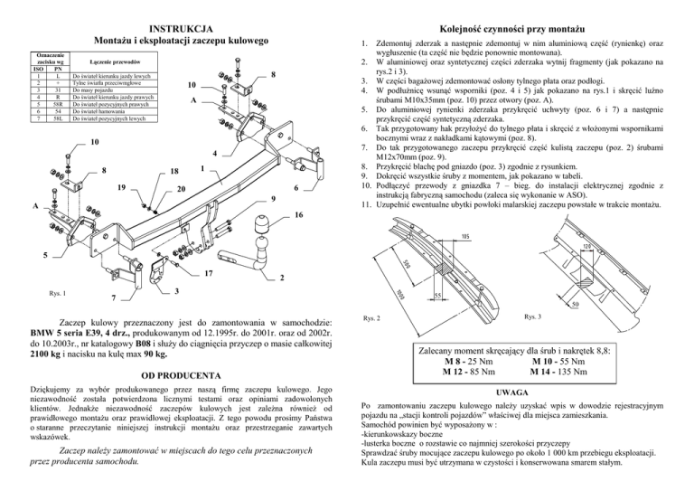 INSTRUKCJA MontaŜu i eksploatacji zaczepu kulowego Oznaczenie zacisku wg ISO PN 1 L 2 + 3 31 4 R 5 58R 6 54 7 58L Kolejność czynności przy montaŜu 1. Łączenie przewodów 8 Do świateł kierunku jazdy lewych Tylne światła przeciwmgłowe Do masy pojazdu Do świateł kierunku jazdy prawych Do świateł pozycyjnych prawych Do świateł hamowania Do świateł pozycyjnych lewych 10 A 10 4 8 18 19 1 6 20 9 A Zdemontuj zderzak a następnie zdemontuj w nim aluminiową część (rynienkę) oraz wygłuszenie (ta część nie będzie ponownie montowana). 2. W aluminiowej oraz syntetycznej części zderzaka wytnij fragmenty (jak pokazano na rys.2 i 3). 3. W części bagaŜowej zdemontować osłony tylnego płata oraz podłogi. 4. W podłuŜnicę wsunąć wsporniki (poz. 4 i 5) jak pokazano na rys.1 i skręcić luźno śrubami M10x35mm (poz. 10) przez otwory (poz. A). 5. Do aluminiowej rynienki zderzaka przykręcić uchwyty (poz. 6 i 7) a następnie przykręcić część syntetyczną zderzaka. 6. Tak przygotowany hak przyłoŜyć do tylnego płata i skręcić z włoŜonymi wspornikami bocznymi wraz z nakładkami kątowymi (poz. 8). 7. Do tak przygotowanego zaczepu przykręcić część kulistą zaczepu (poz. 2) śrubami M12x70mm (poz. 9). 8. Przykręcić blachę pod gniazdo (poz. 3) zgodnie z rysunkiem. 9. Dokręcić wszystkie śruby z momentem, jak pokazano w tabeli. 10. Podłączyć przewody z gniazdka 7 – bieg. do instalacji elektrycznej zgodnie z instrukcją fabryczną samochodu (zaleca się wykonanie w ASO). 11. Uzupełnić ewentualne ubytki powłoki malarskiej zaczepu powstałe w trakcie montaŜu. 16 5 17 Rys. 1 7 2 3 55 50 Zaczep kulowy przeznaczony jest do zamontowania w samochodzie: BMW 5 seria E39, 4 drz., produkowanym od 12.1995r. do 2001r. oraz od 2002r. do 10.2003r., nr katalogowy B08 i słuŜy do ciągnięcia przyczep o masie całkowitej 2100 kg i nacisku na kulę max 90 kg. OD PRODUCENTA Dziękujemy za wybór produkowanego przez naszą firmę zaczepu kulowego. Jego niezawodność została potwierdzona licznymi testami oraz opiniami zadowolonych klientów. JednakŜe niezawodność zaczepów kulowych jest zaleŜna równieŜ od prawidłowego montaŜu oraz prawidłowej eksploatacji. Z tego powodu prosimy Państwa o staranne przeczytanie niniejszej instrukcji montaŜu oraz przestrzeganie zawartych wskazówek. Zaczep naleŜy zamontować w miejscach do tego celu przeznaczonych przez producenta samochodu. Rys. 2 Rys. 3 Zalecany moment skręcający dla śrub i nakrętek 8,8: M 8 - 25 Nm M 10 - 55 Nm M 12 - 85 Nm M 14 - 135 Nm UWAGA Po zamontowaniu zaczepu kulowego naleŜy uzyskać wpis w dowodzie rejestracyjnym pojazdu na „stacji kontroli pojazdów” właściwej dla miejsca zamieszkania. Samochód powinien być wyposaŜony w : -kierunkowskazy boczne -lusterka boczne o rozstawie co najmniej szerokości przyczepy Sprawdzać śruby mocujące zaczepu kulowego po około 1 000 km przebiegu eksploatacji. Kula zaczepu musi być utrzymana w czystości i konserwowana smarem stałym. PPUH AUTO-HAK S.J. WyposaŜenie zaczepu: Produkcja Zaczepów Kulowych Henryk & Zbigniew Nejman 76-200 SŁUPSK ul. Słoneczna 16K tel/fax (059) 8-414-414; 8-414-413 E-mail: [email protected] www. autohak.com.pl Zaczep kulowy bez wyposaŜenia elektrycznego Klasa: A50-X Nr kat. B08 Przeznaczony do zamontowania w samochodzie: Producent: BMW Model: SERIA 5 (E39) Typ: 4drz. produkowanym od 12.1995r. do 2001r. oraz od 2002r. do 10.2003r. Dane techniczne: Wartość siły D: 10,3 kN maksymalna masa przyczepy: 2100 kg maksymalny nacisk na kulę: 90 kg Numer homologacji zgodnie z wytycznymi regulaminu EKG/ONZ 55.01: E20-55R-01 1276 KARTA GWARANCYJNA Producent udziela gwarancji niniejszą kartą gwarancyjną na okres 24 miesięcy licząc od dnia zakupu zaczepu kulowego do samochodu: BMW 5 seria E39 4 drz. produkowanego od 12.1995r. do 2001r. oraz od 2002r. do 10.2003r. Data produkcji .............................. Data zakupu............................................. Zakres gwarancji obejmuje wyłącznie wady jakościowe wynikające z winy producenta. Gwarancja nie obejmuje natomiast uszkodzeń zawinionych przez nabywcę, wynikających z niewłaściwego montaŜu, uŜytkowania lub konserwacji, uszkodzeń mechanicznych, normalnego zuŜycia podczas eksploatacji itp. Gwarancja udzielona na zakupiony towar nie wyłącza, nie ogranicza ani nie zawiesza uprawnień kupującego wynikających z niezgodności towaru z umową. Reklamacje naleŜy zgłaszać w punkcie sprzedaŜy, składając jednocześnie kartę gwarancyjną. Usunięcie "wady" następuje po stwierdzeniu przez punkt sprzedaŜy wspólnie z producentem słuszności złoŜonej reklamacji. Reklamacja powinna być załatwiona w ciągu 14 dni od dnia uznania reklamacji. Karta gwarancyjna jest niewaŜna jeŜeli nie jest wypełniona i podpisana. Data zgłoszenia reklamacji: ................................................................... INFORMACJA WSTĘPNA Zaczep kulowy jest skonstruowany zgodnie z zasadami bezpieczeństwa ruchu drogowego. Zaczep kulowy jest elementem wpływającym na bezpieczeństwo jazdy i moŜe zostać zainstalowany wyłącznie przez personel wyspecjalizowany. Niedopuszczalne jest dokonywanie jakichkolwiek zmian w konstrukcji zaczepu. Powoduje to wygaśniecie dopuszczenia do stosowania. W przypadku obecności masy izolacyjnej lub osłony podwozia w miejscu przylegania zaczepu, naleŜy ją usunąć. Nieosłonięte miejsca karoserii oraz wywiercone otwory naleŜy pomalować farbą antykorozyjną. Informacjami wiąŜącymi odnośnie wartości obciąŜeń są dane podawane przez producenta samochodu, względnie wartości maksymalnej masy przyczepy oraz maksymalnego nacisku na kulę, przy czym wartości parametrów zaczepu kulowego nie mogą być przekroczone. Wzór do obliczania wartości siły D: Maks. masa przyczepy [kg] x Maks. masa samochodu [kg] Maks. masa przyczepy [kg] + Maks. masa samochodu [kg] X 9,81 = 1000 D [kN]