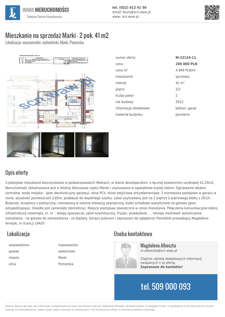 tel. (022) 412 41 50 email: [email protected] www: scn.waw.pl Mieszkanie na sprzedaż Marki - 2 pok. 41 m2 Lokalizacja: mazowieckie, wołomiński, Marki, Pomorska numer oferty M-23124-11 cena 200 000 PLN cena m 4 849 PLN/m2 mieszkanie sprzedaż, metraż 41 m2 piętro 2/2 liczba pokoi 2 rok budowy 2012 informacje dodatkowe balkon, garaż materiał budynku poroterm 2 Opis oferty 2-pokojowe mieszkanie bezczynszowe w podwarszawskich Markach, w stanie developerskim, o łącznej powierzchni użytkowej 41,25m2. Nieruchomość zlokalizowana jest w bliskiej Warszawie części Marek i usytuowana w sąsiedztwie bujnej zieleni. Ogrzewanie lokalne centralne, woda miejska - (piec dwufunkcyjny gazowy), okna PCV, drzwi wejściowe antywłamaniowe, 2 stanowiska postojowe w garażu w cenie, wysokość pomieszczeń 2,65m, poddasze do współnego użytku. Lokal usytuowany jest na 2 piętrze 2-piętrowego bloku z 2012r. Budynek, ocieplony z estetyczną i stonowaną w kolorze elewacją zewnętrzną, klatki schodowe wykończone na gotowo (gres antypoślizgowy). Osiedle jest zamknięte (domofony). Miejsce postojowe zewnętrzne w cenie mieszkania. Połączenia komunikacyjne dobre, infrastruktura rozwinięta, m. in. : sklepy spożywcze, salon kosmetyczny, fryzjer, przedszkole. . . Istnieje możliwość wykończenia mieszkania - na gotowo do zamieszkania - za dopłatą. Gorąco polecam i zapraszam do oglądania! Pośrednik prowadzący Magdalena Armijak, nr licencji 19420 Lokalizacja Osoba kontaktowa Magdalena Alboszta województwo mazowieckie powiat wołomiński [email protected] miasto Marki ulica Pomorska Chętnie udzielę dodatkowych informacji związanych z tą ofertą. Zapraszam do kontaktu! tel. 509 000 093 Zawsze dążymy do tego, aby informacje o proponowanych przez nas ofertach były jak najbardziej dokładne. Niekiedy jednak, ze względu na fakt, iż uzyskujemy je od osób trzecich nie jest możliwe ich zweryfikowanie, wobec czego należy traktować je orientacyjnie i nie stanowią one oferty w rozumieniu kodeksu cywilnego.