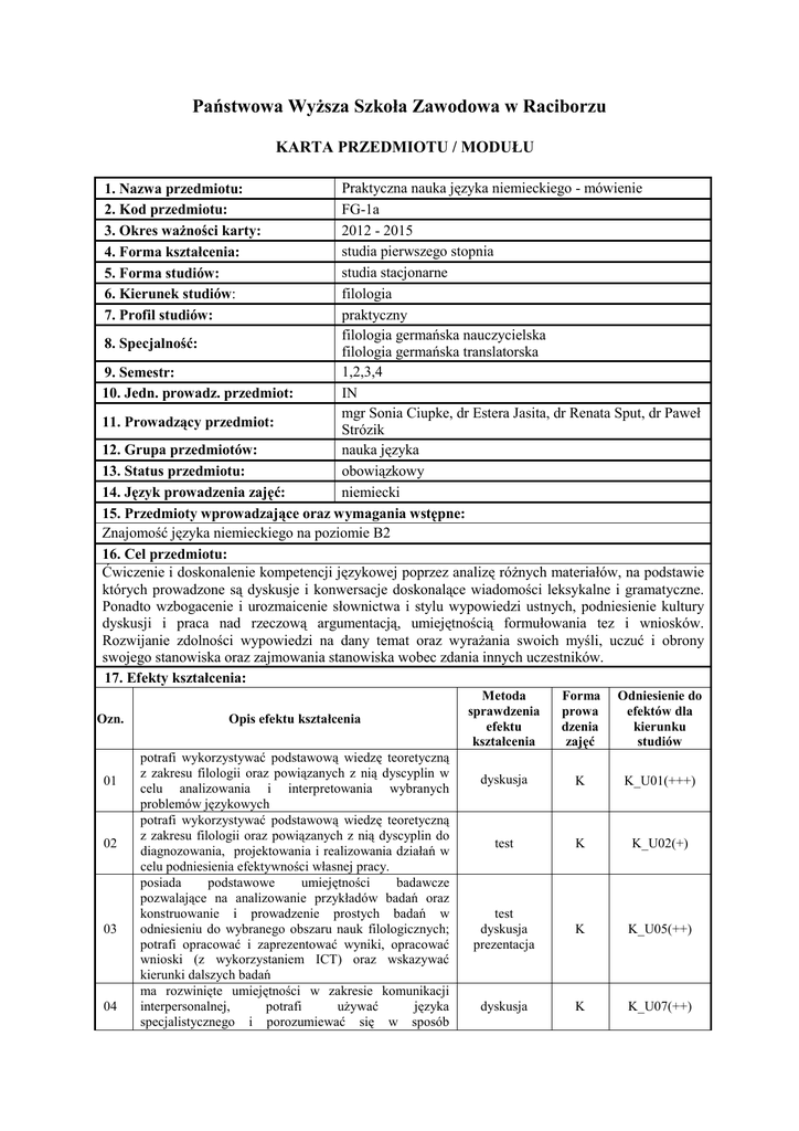 Państwowa Wyższa Szkoła Zawodowa w Raciborzu KARTA PRZEDMIOTU / MODUŁU Praktyczna nauka języka niemieckiego - mówienie FG-1a 2012 - 2015 studia pierwszego stopnia studia stacjonarne filologia praktyczny filologia germańska nauczycielska 8. Specjalność: filologia germańska translatorska 1,2,3,4 9. Semestr: IN 10. Jedn. prowadz. przedmiot: mgr Sonia Ciupke, dr Estera Jasita, dr Renata Sput, dr Paweł 11. Prowadzący przedmiot: Strózik 12. Grupa przedmiotów: nauka języka 13. Status przedmiotu: obowiązkowy niemiecki 14. Język prowadzenia zajęć: 15. Przedmioty wprowadzające oraz wymagania wstępne: Znajomość języka niemieckiego na poziomie B2 16. Cel przedmiotu: Ćwiczenie i doskonalenie kompetencji językowej poprzez analizę różnych materiałów, na podstawie których prowadzone są dyskusje i konwersacje doskonalące wiadomości leksykalne i gramatyczne. Ponadto wzbogacenie i urozmaicenie słownictwa i stylu wypowiedzi ustnych, podniesienie kultury dyskusji i praca nad rzeczową argumentacją, umiejętnością formułowania tez i wniosków. Rozwijanie zdolności wypowiedzi na dany temat oraz wyrażania swoich myśli, uczuć i obrony swojego stanowiska oraz zajmowania stanowiska wobec zdania innych uczestników. 17. Efekty kształcenia: 1. Nazwa przedmiotu: 2. Kod przedmiotu: 3. Okres ważności karty: 4. Forma kształcenia: 5. Forma studiów: 6. Kierunek studiów: 7. Profil studiów: Ozn. 01 02 03 04 Opis efektu kształcenia potrafi wykorzystywać podstawową wiedzę teoretyczną z zakresu filologii oraz powiązanych z nią dyscyplin w celu analizowania i interpretowania wybranych problemów językowych potrafi wykorzystywać podstawową wiedzę teoretyczną z zakresu filologii oraz powiązanych z nią dyscyplin do diagnozowania, projektowania i realizowania działań w celu podniesienia efektywności własnej pracy. posiada podstawowe umiejętności badawcze pozwalające na analizowanie przykładów badań oraz konstruowanie i prowadzenie prostych badań w odniesieniu do wybranego obszaru nauk filologicznych; potrafi opracować i zaprezentować wyniki, opracować wnioski (z wykorzystaniem ICT) oraz wskazywać kierunki dalszych badań ma rozwinięte umiejętności w zakresie komunikacji interpersonalnej, potrafi używać języka specjalistycznego i porozumiewać się w sposób Metoda sprawdzenia efektu kształcenia Forma prowa dzenia zajęć Odniesienie do efektów dla kierunku studiów dyskusja K K_U01(+++) test K K_U02(+) test dyskusja prezentacja K K_U05(++) dyskusja K K_U07(++) 05 06 07 08 precyzyjny i spójny przy użyciu różnych kanałów i technik komunikacyjnych ze specjalistami w zakresie literatury i językoznawstwa, jak i z odbiorcami spoza grona specjalistów, w języku ojczystym i obcym potrafi pracować w zespole pełniąc różne role; umie przyjmować i wyznaczać zadania potrafi stosować zasady i reguły gramatyczne współczesnego języka w akcie komunikacji ma świadomość poziomu swojej wiedzy i umiejętności, rozumie potrzebę ciągłego dokształcania się zawodowego i rozwoju osobistego, dokonuje samooceny własnych kompetencji i doskonali umiejętności, wyznacza kierunki własnego rozwoju i kształcenia jest świadomy swojej pozycji i przygotowany do odpowiedzialnego reprezentowania własnej kultury w kulturze obcej prezentacja dyskusja prezentacja dyskusja K K_U11(+++) K K_U13(+++) dyskusja prezentacja K K_K01(++) dyskusja K K_K05(+++) 18. Formy i wymiar zajęć: K (30h+30h+30h+30h) 19. Treści kształcenia: Freizeitaktivitäten. Hobbys und Interessen ▪ Rolle des Sports im Leben der Menschen. Die Rolle der Frau/des Mannes in der Familie und der Gesellschaft. Reisen. Vorbilder für Jugendliche. Glücklich sein. Studentenleben. Selbständig und unabhängig von den Eltern sein. Heiraten oder Leben ohne Trauschein? Wohnmöglichkeiten. Probleme der heutigen Jugend – Berufswahl, Ausbildung, Arbeit, Beziehung ... Typisch Mann / typisch Frau. Süchte (Kauf-, Alkohol-, Nikotin-, Spielsucht, u.a.) Internet Liebe. Kleinstadt/Großstadt. Die Rolle der Kultur. Literatur, Kino, Theater Heimat. Ferienjobs – eine gute Möglichkeit für Jugendliche, sich etwas Geld zu verdienen, oder? ▪ Kinderarbeit. Toleranz gegenüber sexuellen Minderheiten. Zivilisationskrankheiten – ihre Ursachen und Folgen Die Entwicklung der Technik . Lernklima und Lernerfolg – wie bedingen sie sich gegenseitig? ▪ Schulstress. Abtreibung. Die Rolle der Toleranz in der heutigen Welt. Todesstrafe – für und wider. Kriminalität unter den Jugendlichen. Sterbehilfe. Arbeit im Ausland. Arbeitslosigkeit Mode. Naturverschmutzung. 20. Egzamin: tak, zal/o 21. Literatura podstawowa: Glotz-Kastanis J., Tippmann D.: Sprechen Schreiben Mitreden. Übungsbuch, Ismaning 2006 Müller-Krüppers E., Zöllner I.: Leseverstehen. Fachtexte mit Übungen und methodischen Hinweisen, Ismaning 2002 Rostek E. M.: Lesen und Verstehen 2, Poznań 2002 Rostek E. M.: Deutsch: repetytorium tematyczno-leksykalne, Poznań 2006 22. Literatura uzupełniająca: Aigner B., Gawłowska J., Półrola M.: Übungsmaterialien für Germanistikstudenten und Fortgeschrittene, Łódź 2000 Apelt M.: Wortschatz und mehr, Serie Deutsch üben 9, Ismaning 2001 Ferenbach M., Schlüßer I.: Wörter zur Wahl, Stuttgart 1995 Korman H., Korman H.: Kritisch betrachtet, Ismaning 1997 Tertel R. K.: Diverse Themen im Blickpunkt, Warszawa 1992 Wagner A.: Deutsch sprechen ohne Probleme, Poznań 2005 23. Nakład pracy studenta potrzebny do osiągnięcia efektów kształcenia: Lp. Forma zajęć 1 2 3 4 5 6 Wykład Konwersatorium Laboratorium Projekt Seminarium Przygotowanie się do zajęć Liczba godzin kontaktowych / pracy studenta 120 120 Czytanie tekstów, studiowanie czasopism Przygotowanie prezentacji/ referatu Udział w konsultacjach Przygotowanie się do egzaminu Suma godzin 24. Suma wszystkich godzin: 390 26. Liczba punktów ECTS uzyskanych na zajęciach z bezpośrednim 4 udziałem nauczyciela akademickiego: 28. Uwagi: 60 