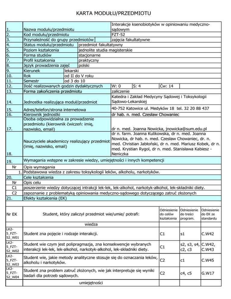 KARTA MODUŁU/PRZEDMIOTU 1. 2. 3. 4. 5. 6. 7. 8. 9. 10. 11. 12. 13. 14. 15. 16. 17. 18. 19. Nr Interakcje ksenobiotyków w opiniowaniu medycznoNazwa modułu/przedmiotu sądowym Kod modułu/przedmiotu FZT-52 Przynależność do grupy przedmiotów zajęcia fakultatywne Status modułu/przedmiotu przedmiot fakultatywny Poziom kształcenia jednolite studia magisterskie Forma studiów stacjonarne Profil kształcenia praktyczny Język prowadzenia zajęć polski Kierunek lekarski Rok od II do V roku Semestr od 3 do 10 Ilość realizowanych godzin dydaktycznych W: 0 S: 4 Ćw: 14 Forma zakończenia przedmiotu zaliczenie Katedra i Zakład Medycyny Sądowej i Toksykologii Sądowo-Lekarskiej Jednostka realizująca moduł/przedmiot Adres/telefon/strona internetowa Kierownik jednostki Osoba odpowidzialna za prowadzenie przedmiotu (kierownik ćwiczeń: imię, nazwisko, email) 40-752 Katowice ul. Medyków 18 tel. 32 20 88 437 dr hab. n. med. Czesław Chowaniec dr n. med. Joanna Nowicka, [email protected] dr n. farm. Joanna Kulikowska, dr n. med. Joanna Nowicka, dr hab. n. med. Czesław Chowaniec, dr. n. Nauczyciele akademiccy realizujący przedmiot med. Christian Jabłoński, dr n. med. Mariusz Kobek, dr n. (imię, nazwisko, email) med. Krystian Rygol, dr n. med. Stanisława Kabiesz Neniczka Wymagania wstępne w zakresie wiedzy, umiejętności i innych kompetencji Opis wymagania 1. Podstawowa wiedza z zakresu toksykologii leków, alkoholu, narkotyków. 20. Cele kształcenia Nr Opis celu C1 poszerzenie wiedzy dotyczącej intrakcji lek-lek, lek-alkohol, narkotyk-alkohol, lek-składniki diety. C2 zapoznanie z problematyką opiniowania medyczno-sądowego dotyczącego zatruć złożonych 21. Efekty kształcenia (EK) Nr EK Student, który zaliczył przedmiot wie/umie/ potrafi: Odniesienie Odniesienie Odniesienie do celów do treści do EK ze kształcenia program. standardu wiedza LK25_FZT52_W01 Student zna pojęcie i rodzaje interakcji. C1 s1 LK25_FZT52_W02 Student wie czym jest polipragmazja, zna konsekwencje wybranych interakcji lek-lek, lek-alkohol, narkotyk-alkohol, lek-składniki diety. C1 s2, s3, s4, C.W42, c2, c3 C.W43 LK25_FZT52_W03 LK25_FZT52_W04 Student wie, jakie metody analityczne stosuje się do oznaczania leków, C2 alkoholu i narkotyków. c1 C.W45 Student zna problem zatruć złożonych, wie jak interpretuje się wyniki badań dla potrzeb sądowych. c4, c5 G.W17 umiejętności C2 C.W42 LK25_FZT52_U01 Student potrafi zabezpieczyć materiał biologiczny do badań na obecność leków, narkotyków, alkoholu. C2 c1 G.U7 C1 s2, s3, c2, K4 c3 kompetencje LK25_FZT52_K01 Stdent jest świadom zagrożeń związanych z interakcjami ksenobiotyków. 22. Treści programowe 22.1. Forma zajęć: WYKŁADY Liczba godzin Forma zajęć: SEMINARIA Liczba godzin Σ 22.2. s1 s2 s3 s4 0 Pojęcie i rodzaje interakcji. Pojęcie polipragmazji. Interakcje lek-lek. Interakcje ksenobiotyków z alkoholem. Interakcje leków ze składnikami diety. 1 1 1 1 Σ 4 Forma zajęć: ĆWICZENIA 22.3. Metody analityczne stosowane do oznaczania leków, narkotyków, alkoholu. Omówienie wybranych interakcji lekowych. Omówienie wybranych interakcji ksenobiotyków z alkoholem. Zatrucia złożone w praktyce toksykologii sądowej. Analiza i omówienie przykładowych ekspertyz toksykologiczno-sądowych dotyczących inetrakcji ksenobiotyków. c1 c2 c3 c4 c5 Liczba godzin 4 2 2 2 Σ 4 14 23. Stosowane narzędzia dydaktyczne 1. prelekcje multimedialne 2. prezentacje 3. zajęcia praktyczne w laboratorium 24. Sposoby weryfikacji efektów kształcenia i sposoby oceny Nr EK Sposoby weryfikacji LK25_FZT52_W01 LK25_FZT52_W02 LK25_FZT52_W03 LK2-5_FZT52_W04 LK25_FZT52_U01 LK25_FZT52_K04 25. Warunki zaliczenia ustne pytanie udzielenie prawidłowej odpowiedzi ustne pytanie udzielenie prawidłowej odpowiedzi ustne pytanie udzielenie prawidłowej odpowiedzi ustne pytanie udzielenie prawidłowej odpowiedzi ustne pytanie udzielenie prawidłowej odpowiedzi ustne pytanie udzielenie prawidłowej odpowiedzi Nakład pracy studenta (bilans punktów ECTS) Forma aktywności Przecietna ilość godzin na zrealizowanie aktywności udział w wykładach Godziny kontaktowe z nauczycielem udział w seminariach akademickim udział w ćwiczeniach Σ przygotowanie do ćwiczeń przygotowanie do zaliczenia Samodzielna praca studenta przygotowanie do egzaminu 0 4 14 18 8 4 Samodzielna praca studenta 26. Σ Łącznia ilość godzin Sumaryczna liczba punktów ECTS dla przedmiotu Sumaryczne wskaźniki charakteryzujące przedmiot Liczba punktów ECTS, które student uzyskuje na zajęcaich wymagajacych bezpośredniego udziału nauczyciela akademickiego Liczba punktów ECTS, które student uzyskuje na zajęcaich o charakterze praktycznym Liczba punktów ECTS, które student uzyskuje w trakcie samodzielnej pracy 12 30 1 0,25 0,25 0,5 27. 27.1. 1. 27.2. Literatura Literatura podstawowa Seńczuk W. (red.): Toksykologia współczesna, PZWL, Warszawa 2006 Literatura uzupełniająca 1. 2. 28. Nr EK Ziglmeier M., Hein T., red. Niewiński P.: Interakcje leków. Wydawnictwo MedPharm, Wrocław 2009 LK25_FZT52_W01 LK25_FZT52_W02 LK25_FZT52_W03 LK25_FZT52_W04 Jarosz M., Dzieniszewski J.: Interakcje leków z żywnością i alkoholem. Borgis, Warszawa 2004. Formy oceny - szczegóły Na ocenę 2 Na ocenę 4 Na ocenę 5 Na ocenę 3 Student nie zna pojęcia i rodzajów interakcji. Student zna pojęcie i rodzaje interakcji w stopniu dostatecznym. Student zna dobrze pojęcie i rodzaje interakcji. Student zna bardzo dobrze pojęcie i rodzaje interakcji. Student nie wie Student wie czym jest Student wie dobrze czym jest polipragmazja, zna czym jest polipragmazja, polipragmazja, nie konsekwencje zna dobrze zna konsekwencji wybranych interakcji lek- konsekwencje wybranych interakcji lek, lek-alkohol, wybranych interakcji leklek-lek, lek-alkohol, narkotyk-alkohol, lek- lek, lek-alkohol, narkotyk-alkohol, lek- składniki diety w narkotyk-alkohol, lekskładniki diety. stopniu dostatecznym. składniki diety. Stud