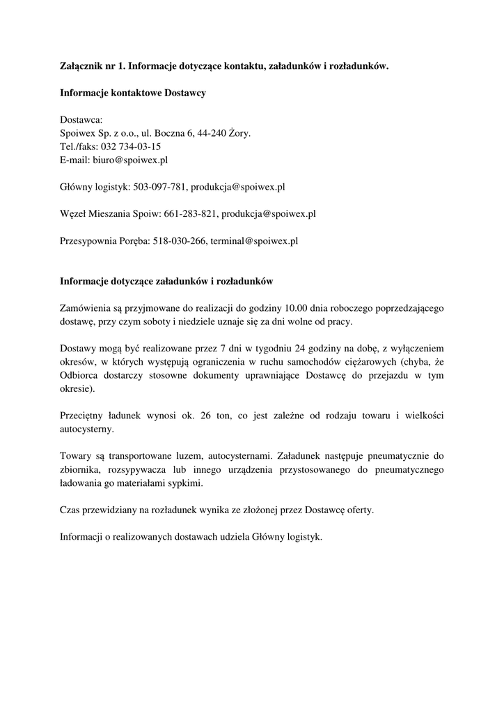 Załącznik nr 1. Informacje dotyczące kontaktu, załadunków i rozładunków. Informacje kontaktowe Dostawcy Dostawca: Spoiwex Sp. z o.o., ul. Boczna 6, 44-240 Żory. Tel./faks: 032 734-03-15 E-mail: [email protected] Główny logistyk: 503-097-781, [email protected] Węzeł Mieszania Spoiw: 661-283-821, [email protected] Przesypownia Poręba: 518-030-266, [email protected] Informacje dotyczące załadunków i rozładunków Zamówienia są przyjmowane do realizacji do godziny 10.00 dnia roboczego poprzedzającego dostawę, przy czym soboty i niedziele uznaje się za dni wolne od pracy. Dostawy mogą być realizowane przez 7 dni w tygodniu 24 godziny na dobę, z wyłączeniem okresów, w których występują ograniczenia w ruchu samochodów ciężarowych (chyba, że Odbiorca dostarczy stosowne dokumenty uprawniające Dostawcę do przejazdu w tym okresie). Przeciętny ładunek wynosi ok. 26 ton, co jest zależne od rodzaju towaru i wielkości autocysterny. Towary są transportowane luzem, autocysternami. Załadunek następuje pneumatycznie do zbiornika, rozsypywacza lub innego urządzenia przystosowanego do pneumatycznego ładowania go materiałami sypkimi. Czas przewidziany na rozładunek wynika ze złożonej przez Dostawcę oferty. Informacji o realizowanych dostawach udziela Główny logistyk.