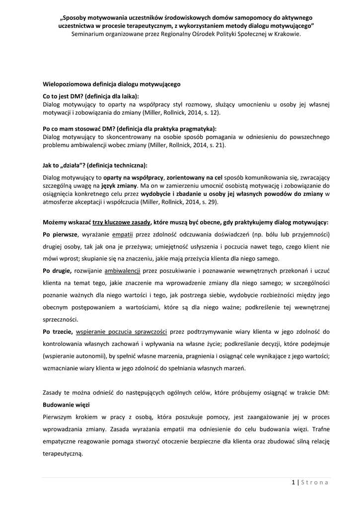 „Sposoby motywowania uczestników środowiskowych domów samopomocy do aktywnego uczestnictwa w procesie terapeutycznym, z wykorzystaniem metody dialogu motywującego” Seminarium organizowane przez Regionalny Ośrodek Polityki Społecznej w Krakowie. Wielopoziomowa definicja dialogu motywującego Co to jest DM? (definicja dla laika): Dialog motywujący to oparty na współpracy styl rozmowy, służący umocnieniu u osoby jej własnej motywacji i zobowiązania do zmiany (Miller, Rollnick, 2014, s. 12). Po co mam stosować DM? (definicja dla praktyka pragmatyka): Dialog motywujący to skoncentrowany na osobie sposób pomagania w odniesieniu do powszechnego problemu ambiwalencji wobec zmiany (Miller, Rollnick, 2014, s. 21). Jak to „działa”? (definicja techniczna): Dialog motywujący to oparty na współpracy, zorientowany na cel sposób komunikowania się, zwracający szczególną uwagę na język zmiany. Ma on w zamierzeniu umocnić osobistą motywację i zobowiązanie do osiągnięcia konkretnego celu przez wydobycie i zbadanie u osoby jej własnych powodów do zmiany w atmosferze akceptacji i współczucia (Miller, Rollnick, 2014, s. 29). Możemy wskazać trzy kluczowe zasady, które muszą być obecne, gdy praktykujemy dialog motywujący: Po pierwsze, wyrażanie empatii przez zdolność odczuwania doświadczeń (np. bólu lub przyjemności) drugiej osoby, tak jak ona je przeżywa; umiejętność usłyszenia i poczucia nawet tego, czego klient nie mówi wprost; skupianie się na znaczeniu, jakie mają przeżycia klienta dla niego samego. Po drugie, rozwijanie ambiwalencji przez poszukiwanie i poznawanie wewnętrznych przekonań i uczuć klienta na temat tego, jakie znaczenie ma wprowadzenie zmiany dla niego samego; w szczególności poznanie ważnych dla niego wartości i tego, jak postrzega siebie, wydobycie rozbieżności między jego obecnym postępowaniem a wartościami, które są dla niego ważne; podkreślenie tej wewnętrznej sprzeczności. Po trzecie, wspieranie poczucia sprawczości przez podtrzymywanie wiary klienta w jego zdolność do kontrolowania własnych zachowań i wpływania na własne życie; podkreślanie decyzji, które podejmuje (wspieranie autonomii), by spełnić własne marzenia, pragnienia i osiągnąć cele wynikające z jego wartości; wzmacnianie wiary klienta w jego zdolność do spełniania własnych marzeń. Zasady te można odnieść do następujących ogólnych celów, które próbujemy osiągnąć w trakcie DM: Budowanie więzi Pierwszym krokiem w pracy z osobą, która poszukuje pomocy, jest zaangażowanie jej w proces wprowadzania zmiany. Zasada wyrażania empatii ma odniesienie do celu budowania więzi. Trafne empatyczne reagowanie pomaga stworzyć otoczenie bezpieczne dla klienta oraz zbudować silną relację terapeutyczną. 1|Strona „Sposoby motywowania uczestników środowiskowych domów samopomocy do aktywnego uczestnictwa w procesie terapeutycznym, z wykorzystaniem metody dialogu motywującego” Seminarium organizowane przez Regionalny Ośrodek Polityki Społecznej w Krakowie. Rozwiązywanie ambiwalencji Jednym z kluczowych elementów DM jest praca nad ambiwalencją klienta, zwana jej rozwiązywaniem. Rozwiązanie ambiwalencji następuje, gdy rozbieżność między obecnym zachowaniem i ustalonymi celami lub wartościami staje się bardzo wyraźna. Kluczowe elementy, od których zależy pozytywne rozwiązanie ambiwalencji, to wiara klienta, że może wprowadzić zmianę, którą uważa za ważną. Skuteczność działań klienta będzie zależała od tego, czy on sam znajdzie sposób wprowadzenia zmiany i będzie miał pewność, że potrafi go zrealizować. Umacnianie klienta To, na ile klient będzie gotów podążyć w kierunku zmiany, zależy od tego, na ile specjalista będzie w stanie pracować nad umacnianiem klienta i wywołać rozmowę na temat jego marzeń, umiejętności, powodów i potrzeb związanych ze zmianą zachowania. Jeśli klient mówi, co sprawia, że potrafi i powinien podjąć zmianę, to zadaniem specjalisty jest podtrzymanie i rozwinięcie takiej rozmowy. Ważnym krokiem jest więc zaangażowanie klienta w rozmowę o zachowaniu, które chce zmienić. Angażujemy klienta w rozmowę o zmianie, posługując się określonymi, opisanymi poniżej, narzędziami” Podstawowe pojęcia w DM Do podstawowych pojęć stosowanych w DM należą: tzw. wiosła, zjawisko ambiwalencji, zjawisko oporu i języka podtrzymania oraz tzw. język zmiany i język zobowiązania. Każde z tych pojęć warte jest krótkiej charakterystyki. „Wiosła” (OARS) Do „wioseł” dialogu motywującego należą pytania otwarte, dowartościowania, odzwierciedlenia i podsumowania. Stosowanie ich w sposób motywujący pozwala klientowi poczuć się wysłuchanym i zrozumianym na tyle, że gotów będzie podjąć i kontynuować pracę w kierunku zmiany. Poniżej przedstawiamy krótki opis czterech „wioseł”. „Wiosło” nr 1: pytania otwarte To pytania, które pozwalają klientowi mówić więcej niż mówi specjalista, zwłaszcza w porównaniu z pytaniami zamkniętymi, które pozwalają tylko na pojedyncze słowa lub lakoniczne odpowiedzi (tak/nie; cyfra lub nazwa). Pytania otwarte umożliwiają zbieranie licznych informacji i danych Postawa: uważne zainteresowanie, budzenie w sobie ciekawości tym, jak klient postrzega cel i miejsce zmiany w swoim obecnym życiu. Powody stosowania: zadawanie pytań zamkniętych lub zbyt wielu pytań powoduje u osoby pytanej uczucie bycia mniej ważną, osłabia jej poczucie zrozumienia własnego życia, poczucie kontroli i dlatego może prowadzić do lakonicznych odpowiedzi; odpowiedzi wyłącznie na zadane pytanie, bez pogłębienia wypowiedzi, co mogłoby dać pełniejszy obraz i więcej informacji; przyjęcie pasywnej postawy 2|Strona „Sposoby motywowania uczestników środowiskowych domów samopomocy do aktywnego uczestnictwa w procesie terapeutycznym, z wykorzystaniem metody dialogu motywujące
