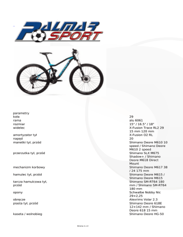 parametry koła rama rozmiar widelec amortyzator tył napęd manetki tył, przód przerzutka tył, przód mechanizm korbowy hamulec tył, przód tarcza hamulcowa tył, przód opony obręcze piasta tył, przód kaseta / wolnobieg Strona 1 z 2 29 alu 6061 15" / 16.5" / 18" X-Fusion Trace RL2 29 15 mm 120 mm X-Fusion O2 RL 20 Shimano Deore M610 10 speed / Shimano Deore M610 2 speed Shimano SLX M675 Shadow+ / Shimano Deore M618 Direct Mount Shimano Deore M617 38 / 24 175 mm Shimano Deore M615 / Shimano Deore M615 Shimano SM-RT64 180 mm / Shimano SM-RT64 180 mm Schwalbe Nobby Nic 29×2,25 Alexrims Volar 2.3 Shimano Deore 618E 12×142 mm / Shimano Deore 618 15 mm Shimano Deore HG-50 kierownica sztyca mostek kierownicy siodło waga Dostępne rozmiary ramy: 15" / 16.5" / 18" Liczba biegów: 20 Waga: 14 kg cena katalogowa 10149 zł Strona 2 z 2 11-36 10 speed Kore Mega 760 mm Kore XCD 31,6 / 400 mm Kore Durox 60 mm Selle Italia Q-Bik 14 kg