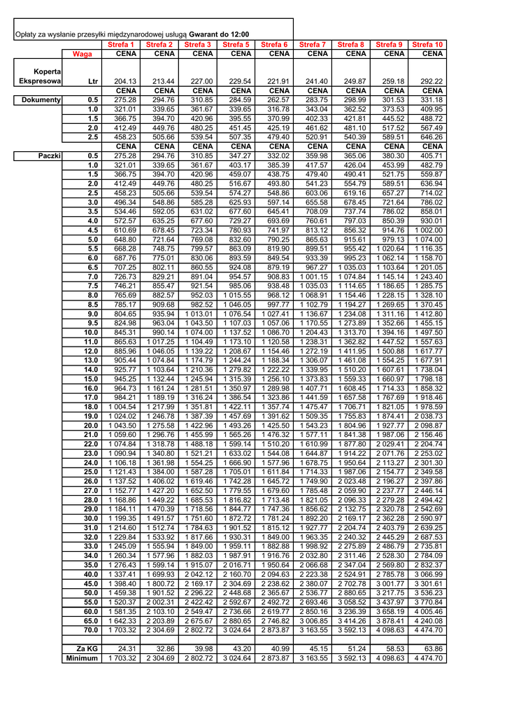 Opłaty za wysłanie przesyłki międzynarodowej usługą Gwarant do 12:00 Strefa 1 Strefa 2 Strefa 3 Strefa 5 CENA CENA CENA CENA Waga Koperta Ekspresowa Ltr Dokumenty 0.5 1.0 1.5 2.0 2.5 Paczki 0.5 1.0 1.5 2.0 2.5 3.0 3.5 4.0 4.5 5.0 5.5 6.0 6.5 7.0 7.5 8.0 8.5 9.0 9.5 10.0 11.0 12.0 13.0 14.0 15.0 16.0 17.0 18.0 19.0 20.0 21.0 22.0 23.0 24.0 25.0 26.0 27.0 28.0 29.0 30.0 31.0 32.0 33.0 34.0 35.0 40.0 45.0 50.0 55.0 60.0 65.0 70.0 204.13 CENA 275.28 321.01 366.75 412.49 458.23 CENA 275.28 321.01 366.75 412.49 458.23 496.34 534.46 572.57 610.69 648.80 668.28 687.76 707.25 726.73 746.21 765.69 785.17 804.65 824.98 845.31 865.63 885.96 905.44 925.77 945.25 964.73 984.21 1 004.54 1 024.02 1 043.50 1 059.60 1 074.84 1 090.94 1 106.18 1 121.43 1 137.52 1 152.77 1 168.86 1 184.11 1 199.35 1 214.60 1 229.84 1 245.09 1 260.34 1 276.43 1 337.41 1 398.40 1 459.38 1 520.37 1 581.35 1 642.33 1 703.32 Za KG Minimum 24.31 1 703.32 Strefa 6 CENA Strefa 7 CENA Strefa 8 CENA Strefa 9 CENA Strefa 10 CENA 213.44 CENA 294.76 339.65 394.70 449.76 505.66 CENA 294.76 339.65 394.70 449.76 505.66 548.86 592.05 635.25 678.45 721.64 748.75 775.01 802.11 829.21 855.47 882.57 909.68 935.94 963.04 990.14 1 017.25 1 046.05 1 074.84 1 103.64 1 132.44 1 161.24 1 189.19 1 217.99 1 246.78 1 275.58 1 296.76 1 318.78 1 340.80 1 361.98 1 384.00 1 406.02 1 427.20 1 449.22 1 470.39 1 491.57 1 512.74 1 533.92 1 555.94 1 577.96 1 599.14 1 699.93 1 800.72 1 901.52 2 002.31 2 103.10 2 203.89 2 304.69 227.00 CENA 310.85 361.67 420.96 480.25 539.54 CENA 310.85 361.67 420.96 480.25 539.54 585.28 631.02 677.60 723.34 769.08 799.57 830.06 860.55 891.04 921.54 952.03 982.52 1 013.01 1 043.50 1 074.00 1 104.49 1 139.22 1 174.79 1 210.36 1 245.94 1 281.51 1 316.24 1 351.81 1 387.39 1 422.96 1 455.99 1 488.18 1 521.21 1 554.25 1 587.28 1 619.46 1 652.50 1 685.53 1 718.56 1 751.60 1 784.63 1 817.66 1 849.00 1 882.03 1 915.07 2 042.12 2 169.17 2 296.22 2 422.42 2 549.47 2 675.67 2 802.72 229.54 CENA 284.59 339.65 395.55 451.45 507.35 CENA 347.27 403.17 459.07 516.67 574.27 625.93 677.60 729.27 780.93 832.60 863.09 893.59 924.08 954.57 985.06 1 015.55 1 046.05 1 076.54 1 107.03 1 137.52 1 173.10 1 208.67 1 244.24 1 279.82 1 315.39 1 350.97 1 386.54 1 422.11 1 457.69 1 493.26 1 565.26 1 599.14 1 633.02 1 666.90 1 705.01 1 742.28 1 779.55 1 816.82 1 844.77 1 872.72 1 901.52 1 930.31 1 959.11 1 987.91 2 016.71 2 160.70 2 304.69 2 448.68 2 592.67 2 736.66 2 880.65 3 024.64 221.91 CENA 262.57 316.78 370.99 425.19 479.40 CENA 332.02 385.39 438.75 493.80 548.86 597.14 645.41 693.69 741.97 790.25 819.90 849.54 879.19 908.83 938.48 968.12 997.77 1 027.41 1 057.06 1 086.70 1 120.58 1 154.46 1 188.34 1 222.22 1 256.10 1 289.98 1 323.86 1 357.74 1 391.62 1 425.50 1 476.32 1 510.20 1 544.08 1 577.96 1 611.84 1 645.72 1 679.60 1 713.48 1 747.36 1 781.24 1 815.12 1 849.00 1 882.88 1 916.76 1 950.64 2 094.63 2 238.62 2 365.67 2 492.72 2 619.77 2 746.82 2 873.87 241.40 CENA 283.75 343.04 402.33 461.62 520.91 CENA 359.98 417.57 479.40 541.23 603.06 655.58 708.09 760.61 813.12 865.63 899.51 933.39 967.27 1 001.15 1 035.03 1 068.91 1 102.79 1 136.67 1 170.55 1 204.43 1 238.31 1 272.19 1 306.07 1 339.95 1 373.83 1 407.71 1 441.59 1 475.47 1 509.35 1 543.23 1 577.11 1 610.99 1 644.87 1 678.75 1 714.33 1 749.90 1 785.48 1 821.05 1 856.62 1 892.20 1 927.77 1 963.35 1 998.92 2 032.80 2 066.68 2 223.38 2 380.07 2 536.77 2 693.46 2 850.16 3 006.85 3 163.55 249.87 CENA 298.99 362.52 421.81 481.10 540.39 CENA 365.06 426.04 490.41 554.79 619.16 678.45 737.74 797.03 856.32 915.61 955.42 995.23 1 035.03 1 074.84 1 114.65 1 154.46 1 194.27 1 234.08 1 273.89 1 313.70 1 362.82 1 411.95 1 461.08 1 510.20 1 559.33 1 608.45 1 657.58 1 706.71 1 755.83 1 804.96 1 841.38 1 877.80 1 914.22 1 950.64 1 987.06 2 023.48 2 059.90 2 096.33 2 132.75 2 169.17 2 204.74 2 240.32 2 275.89 2 311.46 2 347.04 2 524.91 2 702.78 2 880.65 3 058.52 3 236.39 3 414.26 3 592.13 259.18 CENA 301.53 373.53 445.52 517.52 589.51 CENA 380.30 453.99 521.75 589.51 657.27 721.64 786.02 850.39 914.76 979.13 1 020.64 1 062.14 1 103.64 1 145.14 1 186.65 1 228.15 1 269.65 1 311.16 1 352.66 1 394.16 1 447.52 1 500.88 1 554.25 1 607.61 1 660.97 1 714.33 1 767.69 1 821.05 1 874.41 1 927.77 1 987.06 2 029.41 2 071.76 2 113.27 2 154.77 2 196.27 2 237.77 2 279.28 2 320.78 2 362.28 2 403.79 2 445.29 2 486.79 2 528.30 2 569.80 2 785.78 3 001.77 3 217.75 3 437.97 3 658.19 3 878.41 4 098.63 292.22 CENA 331.18 409.95 488.72 567.49 646.26 CENA 405.71 482.79 559.87 636.94 714.02 786.02 858.01 930.01 1 002.00 1 074.00 1 116.35 1 158.70 1 201.05 1 243.40 1 285.75 1 328.10 1 370.45 1 412.80 1 455.15 1 497.50 1 557.63 1 617.77 1 677.91 1 738.04 1 798.18 1 858.32 1 918.46 1 978.59 2 038.73 2 098.87 2 156.46 2 204.74 2 253.02 2 301.30 2 349.58 2 397.86 2 446.14 2 494.42 2 542.69 2 590.97 2 639.25 2 687.53 2 735.81 2 784.09 2 832.37 3 066.99 3 301.61 3 536.23 3 770.84 4 005.46 4 240.08 4 474.70 32.86 2 304.69 39.98 2 802.72 43.20 3 024.64 40.99 2 873.87 45.15 3 163.55 51.24 3 592.13 58.53 4 098.63 63.86 4 474.70