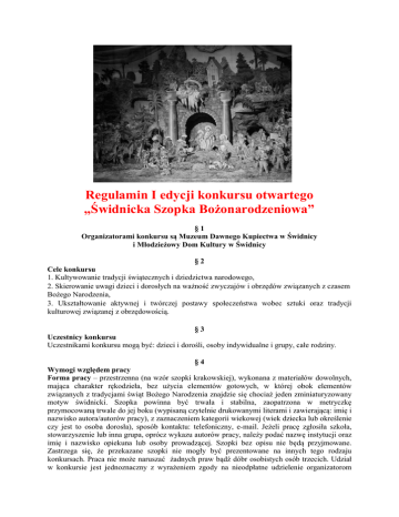 Regulamin I edycji konkursu otwartego „Świdnicka Szopka Bożonarodzeniowa” §1 Organizatorami konkursu są Muzeum Dawnego Kupiectwa w Świdnicy i Młodzieżowy Dom Kultury w Świdnicy §2 Cele konkursu 1. Kultywowanie tradycji świątecznych i dziedzictwa narodowego, 2. Skierowanie uwagi dzieci i dorosłych na ważność zwyczajów i obrzędów związanych z czasem Bożego Narodzenia, 3. Ukształtowanie aktywnej i twórczej postawy społeczeństwa wobec sztuki oraz tradycji kulturowej związanej z obrzędowością. §3 Uczestnicy konkursu Uczestnikami konkursu mogą być: dzieci i dorośli, osoby indywidualne i grupy, całe rodziny. §4 Wymogi względem pracy Forma pracy – przestrzenna (na wzór szopki krakowskiej), wykonana z materiałów dowolnych, mająca charakter rękodzieła, bez użycia elementów gotowych, w której obok elementów związanych z tradycjami świąt Bożego Narodzenia znajdzie się chociaż jeden zminiaturyzowany motyw świdnicki. Szopka powinna być trwała i stabilna, zaopatrzona w metryczkę przymocowaną trwale do jej boku (wypisaną czytelnie drukowanymi literami i zawierającą: imię i nazwisko autora/autorów pracy), z zaznaczeniem kategorii wiekowej (wiek dziecka lub określenie czy jest to osoba dorosła), sposób kontaktu: telefoniczny, e-mail. Jeżeli pracę zgłosiła szkoła, stowarzyszenie lub inna grupa, oprócz wykazu autorów pracy, należy podać nazwę instytucji oraz imię i nazwisko opiekuna lub osoby prowadzącej. Szopki bez opisu nie będą przyjmowane. Zastrzega się, że przekazane szopki nie mogły być prezentowane na innych tego rodzaju konkursach. Praca nie może naruszać żadnych praw bądź dóbr osobistych osób trzecich. Udział w konkursie jest jednoznaczny z wyrażeniem zgody na nieodpłatne udzielenie organizatorom prawa do publikacji zdjęć szopki w środkach masowego przekazu i prezentowania jej na wystawie. §5 Kryteria oceny Walory artystyczne i estetyczne, staranność wykonania, nowatorskość wykonanej pracy, ciekawa interpretacja proponowanej tematyki, sposób wykorzystania świdnickiego motywu. Nie będą oceniane prace z „gotowymi” figurkami. §6 Ocena Szopki oceni jury. Wyniki konkursu zostaną ogłoszone na stronie internetowej Muzeum Dawnego Kupiectwa oraz Młodzieżowego Domu Kultury. O wynikach zostaną też poinformowane lokalne środki masowego przekazu. Zdobywca głównej nagrody oraz osoby wyróżnione zostaną powiadomione przez organizatorów. §7 Nagrody Przewidziana jest nagroda rzeczowa oraz wyróżnienia. §8 Postanowienia końcowe Organizatorzy zastrzegają sobie prawo (po przyjęciu prac na konkurs) do wprowadzenia kategorii wiekowych. Decyzje jury są ostateczne i nie przysługuje od nich odwołanie. Prace należy składać od 26 listopada do 3 grudnia 2014 r. (za wyjątkiem 29 i 30 listopada) w godz. 10.0015.00 w siedzibie Muzeum Dawnego Kupiectwa. Prace uszkodzone nie będą przyjmowane na konkurs. Z wyróżnionych oraz wybranych przez jury szopek zostanie przygotowana wystawa czasowa, jej wernisaż oraz wręczenie nagrody i wyróżnień odbędzie się w grudniu 2014 r. podczas Świdnickiej Kolędy. Szopki wykorzystane do organizacji wystawy będzie można odebrać w Muzeum Dawnego Kupiectwa w dniach od 2 lutego do 6 lutego 2015 r. (w godz. 10.00 – 15.00). W indywidualnych wypadkach możliwe jest, po wcześniejszym uzgodnieniu, ustalenie innego terminu odebrania prac. Prace nie odebrane do końca miesiąca lutego 2015 r. przejdą na własność organizatorów. Organizator nie ponosi odpowiedzialności za podanie przez uczestnika konkursu danych niezgodnych z prawdą. Po rozstrzygnięciu konkursu prace nie zakwalifikowane na wystawę powinny być odebrane w ciągu 30 dni (w godzinach otwarcia Muzeum Dawnego Kupiectwa), po tym terminie przejdą na własność organizatorów. W razie potrzeby dodatkowych informacji udzielą: - dr Dobiesław Karst z Muzeum Dawnego Kupiectwa, tel. 74/8521291, - mgr Elżbieta Tarnowska z Młodzieżowego Domu Kultury w Świdnicy, tel. 74/8512756. §9 METRYCZKA Imię i nazwisko, kategoria wiekowa (dziecko - z podaniem lat, bądź osoba dorosła) ............................................................................................................................. ……………………………………………………………………………………… ………………………………………………………………………………………. ………………………………………………………………………………………. ………………………………………………………………………………………. Imię i nazwisko nauczyciela, opiekuna lub przedstawiciela grupy: .............................................................................................................................. e-mail, telefon nauczyciela, opiekuna lub przedstawiciela grupy: ..............................................................................................................................