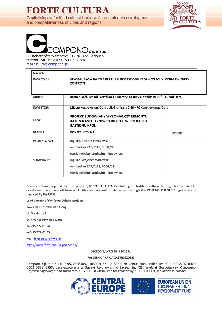 FORTE CULTURA Capitalising of fortified cultural heritage for sustainable development and competitiveness of cities and regions Sp. z o.o. ul. Bohaterów Warszawy 21, 70-372 Szczecin telefon: 501 632 021, 501 397 938 mail: [email protected] NAZWA INWESTYCJI: REWITALIZACJA NA CELE KULTURALNE BASTIONU KRÓL – CZĘŚCI MUZEUM TWIERDZY KOSTRZYN ADRES: Bastion Król, Zespół Fortyfikacji Twierdzy Kostrzyn, działka nr 75/3, K. nad Odrą INWESTOR: Miasto Kostrzyn nad Odrą , Ul. Graniczna 2 66-470 Konstrzyn nad Odrą FAZA: PROJEKT BUDOWLANY WYKONAWCZY REMONTU RATUNKOWEGO ZNISZCZONEGO LEWEGO BARKU BASTIONU KRÓL BRANŻA: KONSTRUKCYJNA PROJEKTOWAŁ: mgr inż. Bartosz Januszewski PODPIS upr. bud. nr ZAP/0102/POOK/08 specjalność konstrukcyjno - budowlana SPRAWDZIŁ: mgr inż. Wojciech Witkowski upr. bud. nr ZAP/0135/POOK/12 specjalność konstrukcyjno - budowlana Documentation prepared for the project „FORTE CULTURA Capitalizing of fortified cultural heritage for sustainable development and competitiveness of cities and regions” implemented through the CENTRAL EUROPE Programme cofinanced by the ERDF. Lead partner of the Forte Cultura project: Town Hall Kostrzyn nad Odrą ul. Graniczna 2 66-470 Kostrzyn nad Odrą +48 95 727 81 24 +48 95 727 81 93 mail: [email protected] http://www.forte-cultura-project.eu/ SZCZECIN, WRZESIEŃ 2013 R. WSZELKIE PRAWA ZASTRZEŻONE Compono Sp. z o.o.; NIP 8522596409, REGON 321171865; Nr konta: Bank Millenium 69 1160 2202 0000 0002 0838 1558; zarejestrowana w Sądzie Rejonowym w Szczecinie, XIII Wydział Gospodarczy Krajowego Rejestru Sądowego pod numerem KRS 0000406884, kapitał zakładowy 5 000,00 PLN, wpłacony w całości; FORTE CULTURA Capitalising of fortified cultural heritage for sustainable development and competitiveness of cities and regions OŚWIADCZENIE PROJEKTANTÓW W trybie art. 20 pkt. 4 Ustawy Prawo Budowlane z dnia 7 lipca 1994r. z późniejszymi zmianami. Niniejszym oświadczamy, że wyżej wymieniony Projekt Budowlany sporządzony został zgodnie z obowiązującymi przepisami oraz zasadami wiedzy technicznej Opracował: mgr inż. Bartosz Januszewski ZAP/0102/POOK/08 spec. konstukcyjno-budowlana Sprawdził: mgr inż. Wojciech Witkowski ZAP/0135/POOK/12 spec. konstukcyjno-budowlana FORTE CULTURA Capitalising of fortified cultural heritage for sustainable development and competitiveness of cities and regions I . ZAWARTOŚĆ OPRACOWANIA OŚWIADCZENIA PROJEKTANTÓW………………………………………………………2 UPRAWNIENIA PROJEKTANTÓW ORAZ PRZYNALEŻNOŚĆ DO PZITB…………3 I . ZAWARTOŚĆ OPRACOWANIA................................................................................................................ 9 II . CZĘŚĆ RYSUNKOWA ................................................................................................................................ 9 I. OPIS TECHNICZNY................................................................................................................................. 10 1. DANE OGÓLNE ........................................................................................................................................ 10 2. PODSTAWA OPRACOWANIA .............................................................................................................. 10 3. PRZEDMIOT I ZAKRES OPRACOWANIA ......................................................................................... 10 4. CHARAKTERYSTYKA OBIEKTU........................................................................................................ 11 5. ROZWIĄZANIA KONSTRUKCYJNE ................................................................................................... 12 6. UWAGI KOŃCOWE................................................................................................................................. 15 II . CZĘŚĆ RYSUNKOWA Nr rys. Nazwa rysunku skala Z.1 Zagospodarowanie terenu 1:250 K.1 Widok zniszczonego barku 1:100 FORTE CULTURA Capitalising of fortified cultural heritage for sustainable development and competitiveness of cities and regions I. OPIS TECHNICZNY 1. DANE OGÓLNE 1.1 Inwestor : Miasto Kostrzyn nad Odrą Ul. Graniczna 2 66-470 Kostrzyn nad Odrą 1.2 Przedsięwzięcie : Rewitalizacja na cele kulturalne Bastionu Król – części Muzeum Twierdzy Kostrzyn 1.3 Obiekt : Bastion Król - bark południowo-zachodni bastionu 1.4 Branża : Konstrukcja 1.5 Faza : Projekt budowlany wykonawczy 1.6 Lokalizacja : dz. nr 75/3 stanowiącej własność Gminy Kostrzyn nad Odrą 2. PODSTAWA OPRACOWANIA 2.1 Zlecenie branży architektonicznej. 2.2 Wizja lokalna. 2.3 Dokumentacja fotograficzna. 2.5 Obciążenia zebrano zgodnie z: PN-82/B-02000 Obciążenia budowli. Zasady ustalania wartości. PN-82/B-02001 Obciążenia budowli. Obciążenie stałe. PN-82/B-02003 Obciążenia budowli. Obciążenie Podstawowe obciążenia technologiczne i montażowe. zmienne technologiczne. 2.6 Elementy konstrukcyjne budynku zwymiarowano zgodnie z: PN-B-03002 Konstrukcje murowe niezbrojone. Projektowanie i obliczanie. PN-B-03010 Ściany oporowe, obliczenia statyczne i projektowanie PN-81/B-03020 Grunty budowlane. Posadowienie bezpośrednie budowli Obliczenia statyczne i projektowanie. PN-B-03264 2002 Konstrukcje Obliczenia statyczne i projektowanie. 3. PRZEDMIOT I ZAKRES OPRACOWANIA betonowe, żelbetowe i sprężone. FORTE CULTURA Capitalising of fortified cultural heritage for sustainable development and competitiveness of cities and regions Przedmiotem niniejszej dokumentacji jest sporządzenie projektu budowlanego, zabezpieczenia tymczasowego zniszczonego barku południowo-zachodniego bastionu Król, dla Rewitalizacji Twierdzy Kostrzyn nad Odrą. Projekt obejmuje swym zakresem rozwiązania konstrukcyjno-materiałowe elementów konstrukcyjnych, w zakresie pozwalającym na uzyskanie pozwolenia na budowę i prawidłowe prowadzenie prac. 4. CHARAKTERYSTYKA OBIEKTU Przedmiotowy obiekt wchodzący w skład zespołu for