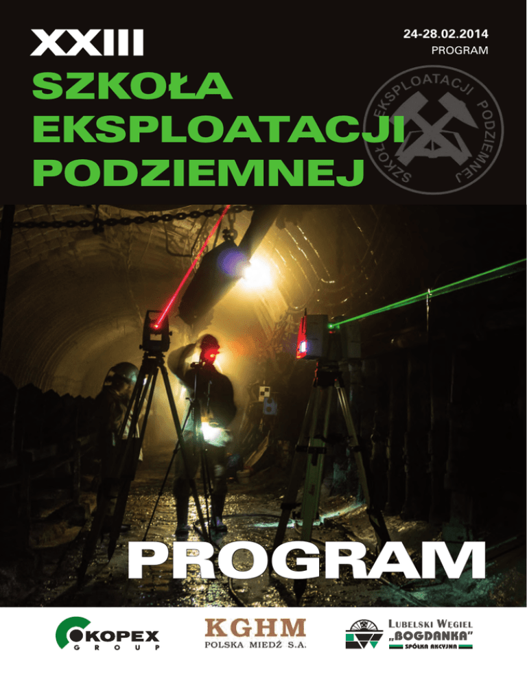 XXIII SZKOŁA EKSPLOATACJI PODZIEMNEJ 24-28.02.2014 PROGRAM PROGRAM Złoty Partner Szkoły Eksploatacji Podziemnej 2014 Patron sesji wykładowej Patron sesji wykładowych Poniedziałek, 24 lutego 2014 Poniedziałek 24 lutego 2014 sale wykładowe Hotelu QUBUS 08:00 - 14:00 - 14:10 14:10 - 16:30 Rejestracja uczestników Otwarcie obrad XXIII Szkoły Eksploatacji Podziemnej Obrady sesji plenarnej: W kierunku inteligentnej kopalni 16:30 - 17:00Przerwa kawowa 17:00 - 19:00 Obrady sesji plenarnej: W kierunku inteligentnej kopalni 19:00 - 20:00Kolacja 20:30 - 21:30Wieczór promocyjny firmy Kopex S.A. – Kabaret „Łowcy.B” 20:30 - 21:30Spotkanie integracyjne w Klubie Mile Stone, na które zaprasza firma Kopex S.A. SALA D+E SALA D+E SALA D+E SALA C Sesja plenarna: W kierunku inteligentnej kopalni 14:10 - 14:30 14:30 - 14:50 14:50 - 15:10 15:10 - 15:30 program 2014.indd 1 Poniedziałek 24 LUTEGO 2014, 14:00-19:00 Hotel Qubus, I piętro, sala D+E ProwadzącY: Józef Dubiński (GIG), PIOTR CZAJA (AGH) Jerzy Kicki - AGH / IGSMiE PAN W kierunku inteligentnej kopalni Herbert Wirth - KGHM Polska Miedź SA Inteligentna kopalnia przyszłości w działaniach KGHM Polska Miedź SA Jerzy Borecki - Jastrzębska Spółka Węglowa SA Inteligentna kopalnia - klucz do poprawy bezpieczeństwa oraz optymalizacji kosztów procesu produkcyjnego Zbigniew Stopa, Sławomir Karlikowski - LW Bogdanka SA W kierunku inteligentnej kopalni – stan aktualny i perspektywy na przykładzie LW Bogdanka SA XXIII SZKOŁA EKSPLOATACJI PODZIEMNEJ 24-28 Lutego 2014 1 2014-02-21 23:37:11 Poniedziałek, 24 lutego 2014 15:30 - 15:50 15:50 - 16:10 16:10 - 16:30 16:30 - 17:00 17:00 - 17:20 17:20 - 17:40 17:40 - 18:00 18:00 - 18:30 Roman Łój, Marek Skuza - KHW SA E-Kopalnia - działania KHW SA wobec wyzwań przed jakimi staje górnictwo Andrzej Meder - Kopex S.A. Rozwój automatyzacji systemów eksploatacyjnych produkcji Grupy Kopex Dyskusja Przerwa kawowa Józef Dubiński - Główny Instytut Górnictwa Podziemne zgazowanie węgla - innowacyjna technologia pozyskiwania energii - teoria i praktyka Jerzy Borecki, Augustyn Holeksa, Patrycjusz Polak, Zbigniew Schinohl, Stanisław Sitek - Jastrzębska Spółka Węglowa SA Wdrożenie w JSW S.A. internetowej platformy szkoleniowo-informacyjnej „STREFA SZTYGARA i nie tylko” Henryk Passia - Główny Instytut Górnictwa Metody techniki laserowej i optoelektroniki w monitoringu działania kopalni Adam Piotrowski - ABB Sp. z o. o. Mining 2.0, koncepcja automatyzacji nowoczesnej kopalni podziemnej Sesja inaugurująca projekt IS-EPOS pt. „Cyfrowa przestrzeń badawcza sejsmiczności indukowanej dla celów EPOS” 18:30 - 18:45 18:45 - 19:00 2 program 2014.indd 2 Beata Orlecka-Sikora - Instytutu Geofizyki PAN Europejski program integracji infrastruktury badawczej sejsmiczności indukowanej w ramach EPOS Stanisław Lasocki - Instytutu Geofizyki PAN IS-EPOS - Cyfrowa przestrzeń badawcza sejsmiczności indukowanej dla celów EPOS XXIII SZKOŁA EKSPLOATACJI PODZIEMNEJ 24-28 Lutego 2014 2014-02-21 23:37:12 Wtorek, 25 lutego 2014 Wtorek 08:30 - 11:15 25 lutego 2014 sale wykładowe Hotelu QUBUS Obrady w sesjach: – Dobre praktyki w projektowaniu i budowie szybów, szybików –Człowiek i środowisko: Szanse i bariery procesu sala A sala B+C podziemnego zgazowania węgla –Nowe techniki i technologie w eksploatacji podziemnej złóż 11:15 - 11:30Przerwa kawowa 11:30 - 13:00 Obrady w sesjach: –Metan, wentylacja i klimatyzacja kopalń –Nowoczesna technika strzałowa w górnictwie –Nowe techniki i technologie w eksploatacji podziemnej złóż 13:00 - 14:00Przerwa obiadowa 14:00 - 16:00 Obrady w sesjach: – Monitoring, sterowanie i wizualizacja procesów sala D+E sala A sala B+C sala D+E sala a podziemnej eksploatacji złóż – Informatyka w górnictwie – Nowe techniki i technologie w eksploatacji podziemnej złóż 16:00 - 16:30Przerwa kawowa 16:30 - 19:00 Obrady w sesjach: –Monitoring, sterowanie i wizualizacja procesów sala b+c sala D+E sala a podziemnej eksploatacji złóż –Informatyka w górnictwie – Wykonywanie i utrzymanie wyrobisk 19:00 - 20:00Kolacja 20:00 -Wieczór promocyjny KGHM Polska Miedź S.A. i koncert HooDoo Band program 2014.indd 3 XXIII SZKOŁA EKSPLOATACJI PODZIEMNEJ 24-28 Lutego 2014 sala b+c sala D+E 3 2014-02-21 23:37:12 Wtorek, 25 lutego 2014 Dobre praktyki w projektowaniu i budowie szybów, szybików wTOREK 25 LUTEGO 2014, 09:00-11:15 Hotel Qubus, sala A ProwadzącY: Czesław Kubaczka (JSW SA) Sesja pod patronatem 09:00 - 09:15 09:15 - 09:30 09:30 - 09:45 09:45 - 10:00 10:00 - 10:15 10:15 - 10:30 10:30 - 10:45 10:45 - 11:00 11:00 - 11:15 4 program 2014.indd 4 Joanna Drabek, Szymon Maczuga, Mariusz Wojtaczka - Kopex Przedsiębiorstwo Budowy Szybów SA Wpływ prawidłowego rozpoznania warunków hydrogeologicznych i geologiczno-inżynierskich na dobór technologii i bezpiecznego głębienia szybu Andrzej Wichur - AGH, Jacek Franiel - PPG ROW - JAS Sp. z o. o. Obudowa szybu VI w JSW S.A. KWK „Budryk” w strefie uskoku chudeckiego na odcinku od 1170,0 m do głębokości 1233,7 m Joanna Drabek, Tomasz Sanocki, Mariusz Wojtaczka - Kopex Przedsiębiorstwo Budowy Szybów SA Modyfikacja konstrukcji obudowy i technologii głębienia szybu w zawodnionym górotworze o niskich parametrach wytrzymałościowych Piotr Czaja, Paweł Kamiński - AGH Sposób regulacji obciążenia i konstrukcja obudowy szybowej na odcinkach przechodzących przez górotwór solny Zygmunt Niedojadło, Karolina Matwij - AGH Wpływ odwodnienia górotworu na deformacje obudowy szybów LGOM Wojciech Lekan - LW Bogdanka SA Modernizacja szybu 1.5 w LW Bogdanka SA Tomasz Rokita - AGH Pomosty bezpieczeństwa w pogłębianych szybach górniczych Jarosław Pyka, Krzysztof Brenza - Kompania Węglowa SA Bezpieczne prowadzenie eksploatacji w filarze szybów głównych rejonu „Brzeziny” – KWK „Piekary” na przykładzie ścian w pokł. 419, 501 i 504 z zastosowaniem profilaktyki przeciwpożarowej w