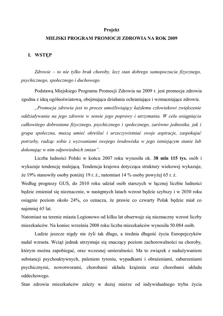 Projekt MIEJSKI PROGRAM PROMOCJI ZDROWIA NA ROK 2009 I