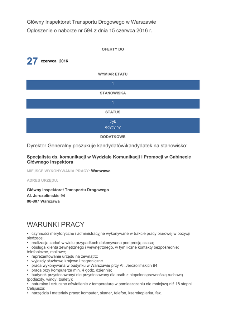 Główny Inspektorat Transportu Drogowego w Warszawie Ogłoszenie o naborze nr 594 z dnia 15 czerwca 2016 r. OFERTY DO 27 czerwca 2016 WYMIAR ETATU 1 STANOWISKA 1 STATUS tryb edycyjny DODATKOWE Dyrektor Generalny poszukuje kandydatów\kandydatek na stanowisko: Specjalista ds. komunikacji w Wydziale Komunikacji i Promocji w Gabinecie Głównego Inspektora MIEJSCE WYKONYWANIA PRACY: Warszawa ADRES URZĘDU: Główny Inspektorat Transportu Drogowego Al. Jerozolimskie 94 00-807 Warszawa WARUNKI PRACY • czynności merytoryczne i administracyjne wykonywane w trakcie pracy biurowej w pozycji siedzącej; • realizacja zadań w wielu przypadkach dokonywana pod presją czasu; • obsługa klienta zewnętrznego i wewnętrznego, w tym liczne kontakty bezpośrednie; telefoniczne, mailowe; • reprezentowanie urzędu na zewnątrz; • wyjazdy służbowe krajowe i zagraniczne. • praca wykonywana w budynku w Warszawie przy Al. Jerozolimskich 94 • praca przy komputerze min. 4 godz. dziennie; • budynek przystosowany/ nie przystosowany dla osób z niepełnosprawnością ruchową (podjazdy, windy, toalety); • naturalne i sztuczne oświetlenie z temperaturą w pomieszczeniu nie mniejszą niż 18 stopni Celsjusza; • narzędzia i materiały pracy: komputer, skaner, telefon, kserokopiarka, fax. ZAKRES ZADAŃ Przygotowywanie notatek prasowych, sprawozdań, wiadomości na stronę internetową dotyczących bieżącej działalności ITD. Współpraca w tworzeniu materiałów promocyjnych i informacyjnych. Opracowywanie odpowiedzi zwrotnych na korespondencję elektroniczną wpływającą na adres: [email protected] we współpracy z biurami właściwymi merytorycznie. Przygotowywanie dokumentów wewnętrznych Gabinetu Głównego Inspektora, a także przygotowywanie projektów odpowiedzi na pisma kierowane do GITD oraz bezpośrednio do Gabinetu. Współprowadzenie i redakcja profilu Inspekcji Transportu Drogowego w serwisach społecznościowych, stronie internetowej GITD. Udział i współorganizacja wydarzeń promocyjnych na terenie całego kraju oraz spotkań przedstawicieli Głównego Inspektoratu Transportu Drogowego z udziałem mediów. WYMAGANIA NIEZBĘDNE Wykształcenie: wyższe magisterskie doświadczenie zawodowe: 1 rok pracy z mediami Prawo jazdy kat. B; Znajomość języka angielskiego w stopniu B2; Biegła obsługa programów Microsoft Office; Znajomość ustawy o transporcie drogowym; Znajomość ustawy Prawo prasowe; Komunikatywność; Organizacja pracy własnej, Radzenie sobie ze stresem, Samodzielność. Posiadanie obywatelstwa polskiego Korzystanie z pełni praw publicznych Nieskazanie prawomocnym wyrokiem za umyślne przestępstwo lub umyśle przestępstwo skarbowe DOKUMENTY I OŚWIADCZENIA NIEZBĘDNE Życiorys/CV i list motywacyjny Kopie dokumentów potwierdzających spełnienie wymagania niezbędnego w zakresie wykształcenia Kopie dokumentów potwierdzających spełnienie wymagania niezbędnego w zakresie doświadczenia zawodowego / stażu pracy Kopia prawa jazdy kat. B Oświadczenie o posiadaniu obywatelstwa polskiego albo kopia dokumentu potwierdzającego posiadanie polskiego obywatelstwa Oświadczenie o wyrażeniu zgody na przetwarzanie danych osobowych do celów naboru Oświadczenie o korzystaniu z pełni praw publicznych Oświadczenie o nieskazaniu prawomocnym wyrokiem za umyślne przestępstwo lub umyślne przestępstwo skarbowe DOKUMENTY I OŚWIADCZENIA DODATKOWE kopia dokumentu potwierdzającego niepełnosprawność - w przypadku kandydatek/kandydatów, zamierzających skorzystać z pierwszeństwa w zatrudnieniu w przypadku, gdy znajdą się w gronie najlepszych kandydatek/kandydatów TERMINY I MIEJSCE SKŁADANIA DOKUMENTÓW Dokumenty należy złożyć do: 27 czerwca 2016 r. Decyduje data: stempla pocztowego / osobistego dostarczenia oferty do urzędu Miejsce składania dokumentów: Główny Inspektorat Transportu Drogowego Biuro Dyrektora Generalnego Aleje Jerozolimskie 94 00-807 Warszawa z dopiskiem na kopercie i w liście motywacyjny: BDG.110.29.2016.0363 INNE INFORMACJE: W miesiącu poprzedzającym datę upublicznienia ogłoszenia wskaźnik zatrudnienia osób niepełnosprawnych w urzędzie, w rozumieniu przepisów o rehabilitacji zawodowej i społecznej oraz zatrudnianiu osób niepełnosprawnych, nie wynosi co najmniej 6%. Prosimy o napisanie w liście motywacyjnym, jakiego ogłoszenia dotyczy oferta–numer podany w „miejscu składania dokumentów”. Kandydaci zakwalifikowani zostaną powiadomieni o terminie postępowania rekrutacyjnego. Oferty przesłane drogą elektroniczną nie opatrzone bezpiecznym podpisem elektronicznym lub faksem lub otrzymane po terminie lub nie spełniające wymagań określonych w ogłoszeniu nie będą rozpatrywane. Oferty odrzucone zostaną komisyjnie zniszczone. Przyjmujemy tylko kserokopie dokumentów. W przypadku wpływu dużej liczby ofert, Urząd zastrzega sobie możliwość rozsyłania informacji o terminie postępowania rekrutacyjnego wyłącznie drogą e-mailową. W sytuacji braku dostępu kandydata do poczty elektronicznej, prosimy o zamieszczenie takiej informacji wraz z telefonem kontaktowym w liście motywacyjnym. Weryfikacja spełniania przez kandydatów wymagań formalnych dokonana zostanie na podstawie dokumentów wymienionych w części „wymagane dokumenty i oświadczenia”. Za kompletne oferty uznane będą oferty, zawierając wszystkie wymagane dokumenty i własnoręcznie podpisane oświadczenia. Prosimy o skorzystanie ze wzorów oświadczeń, które dostępne są na stronie internetowej Inspektoratu w zakładce Kariera pod adresem http://www.gitd.gov.pl/kariera/dokumenty-do-pobrania. Zachęcamy do zapoznania się z informacjami dotyczącymi zasad organizacji naboru, które są dostępne w zakładce Kariera na stronie internetowej Inspektoratu pod adresemhttp://www.gitd.gov.pl/kariera. Pod tym adresem znajduję się również formularz kontaktowy, umożliwiający bezpośredni kontakt z działem rekrutacji. Zachęcamy ta