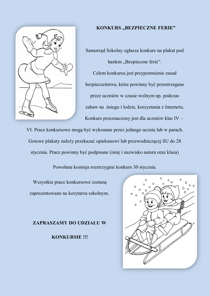 KONKURS „BEZPIECZNE FERIE” Samorząd Szkolny ogłasza konkurs na plakat pod hasłem „Bezpieczne ferie”. Celem konkursu jest przypomnienie zasad bezpieczeństwa, które powinny być przestrzegane przez uczniów w czasie wolnym np. podczas zabaw na śniegu i lodzie, korzystania z Internetu. Konkurs przeznaczony jest dla uczniów klas IV – VI. Prace konkursowe mogą być wykonane przez jednego ucznia lub w parach. Gotowe plakaty należy przekazać opiekunowi lub przewodniczącej SU do 28 stycznia. Prace powinny być podpisane (imię i nazwisko autora oraz klasa) Powołana komisja rozstrzygnie konkurs 30 stycznia. Wszystkie prace konkursowe zostaną zaprezentowane na korytarzu szkolnym. ZAPRASZAMY DO UDZIAŁU W KONKURSIE !!!