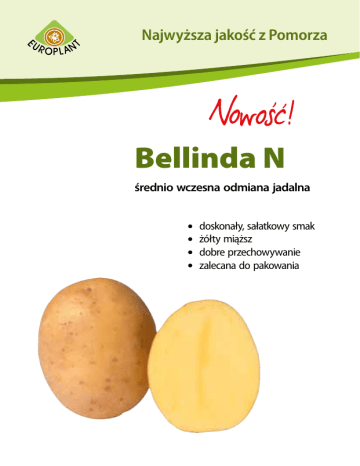 Najwyższa jakość Najwyższa jakość z Pomorza Bellinda N średnio wczesna odmiana jadalna doskonały, sałatkowy smak żółty miąższ dobre przechowywanie zalecana do pakowania Bellinda N Średnio wczesna odmiana jadalna o doskonałej jakości Wymagania glebowe: Bellinda wymaga gleb średnich oraz średniego zapotrzebowania na wodę. Należy ją uprawiać na glebach utrzymanych w dobrej kulturze rolnej. Jest odporna na stres związany z suszą. Wymagania szczególne: Bellindę należy sadzić w odstępach co 30–32 cm, w rozstępach między rzędami 75 cm (ok. 43.000 roślin/ha). Bellinda jest bardzo wdzięczna za harmonijne nawożenie, które zaleca się w następujących proporcjach: N – do 160 kg/ha, K – 250 do 300 kg/ha, P – 100 kg/ha. Należy również uwzględnić nawożenie Mg oraz mikroelementy. Zaleca się regularną ochronę przeciwko zarazie ziemniaka. Jest wrażliwa na metrobuzynę zawartą w herbicydach. W celu wyrównanych wschodów i ochrony przed rizoktoniozą, zaleca się zaprawianie sadzeniaków. Zbiór należy wykonać w temp. pow. 12 st. C, co pozwala ograniczyć uszkodzenia bulw a następnie przez 2-4 tyg. zaleca się wentylowanie i schłodzenie w celu wysuszenia i zabliźnienia uszkodzeń. Wczesność średnio wczesna Walory kulinarne typ kulinarny A, doskonale nadaje się na sałatki, ciemnożółta barwa miąższu, zachowuje zwartą konsystencję po pokrojeniu Wschody równomierne Przechowywanie długi okres spoczynku, dobrze się przechowuje Bulwy Kształt Położenie oczek Barwa miąższu Skórka Odporność Nicienie Podatność Parch Rdzawa plamistość Czarna plamistość Uszkodzenia owalny-podłużnoowalny płytkie ciemnożółta gładka Mątwik ziemniaka Ro 1i4 średnia mała-średnia mała-średnia mała-średnia Bellinda łączy w sobie doskonały smak z wysokim plonem. Ze względu na szybki przyrost bulw i stabilną jakość miąższu wcześnie osiąga przydatność handlową. Ładna gładka skórka i kształtne bulwy sprawiają, że Bellinda idealnie nadaje się do mycia i pakowania. Przedstawiciel w Polsce południowej: Nysa • kom. 602 500 723 EUROPLANT HANDEL ZIEMNIAKAMI Sp. z o.o. woj. zachodniopomorskie • Laski Koszalińskie 3/A • 76 - 039 Biesiekierz tel. 094 347 34 61 • fax 094 347 34 62 • kom. 602 606 233 • 608 619 440