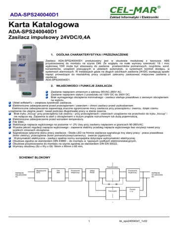 ADA-SPS240040D1 Zakład Informatyki i Elektroniki Karta Katalogowa ADA-SPS240040D1 Zasilacz impulsowy 24VDC/0,4A 1. OGÓLNA CHARAKTERYSTYKA I PRZEZNACZENIE Zasilacz ADA-SPS240040D1 produkowany jest w obudowie modułowej z tworzywa ABS przystosowanej do montażu na szynie DIN. Ze względu na małe wymiary szerokość 1S i moc wyjściową 10W może być stosowany do zasilania przetworników pomiarowych, czujników, sond, konwerterów, urządzeń pracujących w układach automatyki, w systemach kontroli dostępu, w systemach alarmowych. W instalacjach gdzie na długich odcinkach zasilania 24VDC występują spadki napięć prowadzące do niestabilnej pracy urządzeń zalecamy zastosować miejscowe zasilanie z zasilacza ADA-SPS240040D1. 2. WŁAŚCIWOŚCI I FUNKCJE ZASILACZA Zasilanie napięciem zmiennym z zakresu 90VAC-260V AC. Zasilanie napięciem stałym z przedziału od 130V DC do 350V DC. Brak wymaganego obciążenia minimalnego - zasilacz startuje prawidłowo z zerowym obciążeniem na wyjściu, Układ softstart'u – zwiększa żywotność zasilacza. Elektroniczne zabezpieczenie przed przeciążeniem i zwarciem - chroni zasilacz przed uszkodzeniem. Elektroniczne zabezpieczenia zapewniają znaczne ograniczenie mocy zasilacza przy przeciążeniu i zwarciu, dzięki czemu urządzenie nie ulegnie awarii nawet podczas długotrwałej pracy w stanie zwarcia. Brak trybu „hiccup” przy przeciążeniu lub zwarciu - przy przeciążeniach i zwarciach urządzenie nie przechodzi do trybu „hiccup” i nie wyłącza się. Zapewnia to start z obciążeniami o dużym prądzie rozruchowym lub dużą pojemnością. Elektroniczne zabezpieczenie przed wzrostem temperatury. Filtr EMC. Stabilizacja napięcia wyjściowego na poziomie +/- 2% Uwy przy zasilaniu napięciem w granicach 90-260VAC. Wysoka jakość regulacji napięcia wyjściowego - zapewnia stabilny przebieg napięcia wyjściowego bez oscylacji nawet przy szybkich zmianach obciążenia. Sygnalizacja optyczna stanu pracy zasilacza - Dioda LED na froncie zasilacza sygnalizuje trzy stany pracy : praca prawidłowa (kolor zielony), przeciążenie (kolor pomarańczowy/czerwony), zwarcie (zgaszona). Wytrzymałość elektryczna - zasilacz spełnia normy europejskie dotyczące wytrzymałości elektrycznej. Obudowa zgodna ze standardem DIN 43880 – do montażu w typowych szafkach elektroinstalacyjnych, Obudowa przystosowana do montażu na szynie zgodnej ze standardem DIN EN 50022, Wymiary obudowy (Sz x Wy x Gł) 18mm x 90mm x 65 mm, SCHEMAT BLOKOWY Transformator NAPIĘCIE WEJŚCIOWE AC Bezpiecznik NTC Filtr EMI Prostownik Wejściowy Układ PWM Prostownik Wyjściowy Transoptor 1 Pomiar IiU kk_sps240040d1_1v02 NAPIĘCIE WYJŚCIOWE DC ADA-SPS240040D1 Zakład Informatyki i Elektroniki 3. DANE TECHNICZNE Parametry Dane Parametry wejścia 90 - 260VAC 90 – 110VAC obciążenie 250mA 120 – 260VAC obciążenie 400mA Zakres napięcia zasilania Napięcie znamionowe 230VAC 53 mA Prąd znamionowy Częstotliwość zasilania (znamionowa) 48 - 63 Hz ( 50Hz ) Prąd wejściowy przy zwartym wyjściu 12 mA (Vout=0V) Zabezpieczenie przed wzrostem napięcia elektroniczne 1A klasy C Zewnętrzny bezpiecznik Złącza Złącza śrubowe 2,5 mm2 Parametry wyjścia 24VDC Napięcie znamionowe Znamionowy prąd wyjściowy 0,40A Moc wyjściowa 9,6W Współczynnik stabilizacji napięcia wyjściowego Su 0,2% Nastawialne napięcie wyjściowe Brak < 200mVpp Tętnienia Ograniczenie prądu 0,49A 0,58A (Vout=0V) Prąd zwarcia Zabezpieczenie przed przeciążeniem elektroniczne Zabezpieczenie przed zwarciem elektroniczne Dioda LED na froncie zasilacza sygnalizuje następujące stany pracy : -praca prawidłowa (kolor zielony), -przeciążenie lub zwarcie (zgaszona) Sygnalizacja optyczna pracy zasilacza Złącza śrubowe 2,5 mm2 Złącza Dane ogólne Sprawność 80% Zmienna, maksymalna 132kHz Częstotliwość impulsowania Wytrzymałość elektryczna uzwojeń transformatora pierwotne/wtórne 3kV/1min Klasa ochronności II, brak zacisku PE PN-EN 61204-3 Kompatybilność elektromagnetyczna EMC Wymagania bezpieczeństwa Środowisko PN-EN 61204 Handlowe i lekko uprzemysłowione Temperatura pracy (znamionowa) 0 – 50°C ( 25°C ) Wilgotność względna powietrza (znamionowa) 5 ÷ 90% (60%) - bez kondensacji Montaż na szynie DIN Położenie podczas pracy Obudowa Wymiary ( Wys x Sz x G) 89,6 x 17,5 x 63 mm ABS niepalny, kolor RAL 7035 Materiał Stopień ochrony obudowy IP20 Masa 90 g Warunki przechowywania i transportu Temperatura zewnętrzna -40 ÷ +70°C 5 ÷ 95% - bez kondensacji Wilgotność względna powietrza 2 ADA-SPS240040D1 Producent Zakład Informatyki i Elektroniki Dystrybutor CEL-MAR sp.j. Zakład Informatyki i Elektroniki ul. Ściegiennego 219C 25-116 Kielce, POLSKA Tel/fax ............................................ : +48 41 362-12-46 Fax.................................................. : +48 41 361-07-70 Web................................................ : http://www.cel-mar.pl Biuro............................................... : [email protected] Dział handlowy............................... : [email protected] Informacja techniczna ................... : [email protected] 3