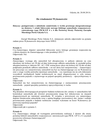 Gdynia, dn. 28.08.2013r. Do wiadomości Wykonawców Dotyczy: postępowania o udzielenie zamówienia w trybie przetargu nieograniczonego na dostawę 1 sztuki fabrycznie nowego lekkiego samochodu rozpoznawczoratowniczego typu PICK-UP 4 x 4 dla Portowej Straży Pożarnej Zarządu Morskiego Portu Gdynia S.A. Zarząd Morskiego Portu Gdynia S.A. niniejszym udziela odpowiedzi na pytania zadane przez Wykonawców dotyczące treści SIWZ: Pytanie 1: Czy Zamawiający dopuści samochód fabrycznie nowy którego gwarancja rozpocznie się z dniem dostawy do Zamawiającego z roku produkcji 2012 ? Odpowiedź: Nie Pytanie 2: Zamawiający wymaga aby samochód był ubezpieczony w pełnym zakresie na czas określony nie krótszy niż 30 dni od daty końcowego odbioru samochodu, tj. posiadał polisę ubezpieczeniową w zakresie OC, AC i NW ważną przez okres nie krótszy niż 30 dni od daty podpisania protokołu odbioru samochodu i na ten okres był zarejestrowany – Zamawiający nie precyzuje czy zarejestrowany samochód ma być na Zamawiającego czy na Wykonawcę oraz z czego wynika potrzeba rejestracji samochodu – czy rejestracja ma na celu dokonanie wszystkich niezbędnych badań technicznych na stacji diagnostycznej w celu zmiany przeznaczenia pojazdu z ciężarowego na pojazd specjalny pożarniczy – uprzywilejowany w ruchu. Odpowiedź: Samochód ma być zarejestrowany na Zamawiającego z zaznaczeniem: przeznaczenie samochodu – pojazd specjalny pożarniczy uprzywilejowany w ruchu. Pytanie 3: Wg aktualnie obowiązujących przepisów badania techniczne dot. zmiany w samochodzie lub konstrukcji samochodu jak również przeznaczenia mogą być dokonywane na stacjach diagnostycznych po rejestracji samochodu. W związku z powyższym czy zamawiający dopuści dostarczenie samochodu wraz z opinią biegłego rzeczoznawcy dot. zmian i rodzaju przeznaczenia pojazdu a badanie techniczne zostanie wykonane na koszt Wykonawcy po pierwszej rejestracji pojazdu? Odpowiedź: Odpowiedź jak w pytaniu 2. Pytanie 4: Czy Zamawiający odstąpi od wymagania potwierdzenia realizacji 2 dostaw dla straży pożarnej lekkich samochodów rozpoznawczo- ratowniczych typu PICK -UP 4 x 4 i uzyskali pozytywne referencje Zamawiających? Odpowiedź: Nie. Pytanie 5: Czy Zamawiający dopuści do udziału w postępowaniu Wykonawcę, który wykonał w ostatnich 3 latach jednej dostawy 2 sztuk samochodów typu PICK – UP 4 x 4 dla Straży Pożarnej oraz kilku innych dostaw lekkich samochodów rozpoznawczo ratowniczych dla Straży Pożarnej z napędem 4 x 4 i w każdym z przypadków otrzymał pozytywną ocenę zrealizowanej dostawy? Odpowiedź: Tak Pytanie 6: W SIWZ w wymaganiach Zamawiającego w punkcie 1. Parametrów TechnicznoUżytkowych jest: … nadwozie pojazdu w kolorze czerwonym- odcień zbliżony do czerwieni sygnałowej(RAL 3000). Czy zamawiający dopuści do postępowania samochód w kolorze białym? Odpowiedź: Nie Pytanie 7: W SIWZ w wymaganiach zamawiającego w punkcie 6. Parametrów TechnicznoUżytkowych jest:…. Napęd: terenowy 4 x 4 z reduktorem i blokada tylnego mostu…. Czy zamawiający dopuści do postępowania samochód wyposażony w rozwiązanie równoznaczne z blokadą tylnego mostu? Odpowiedź: Tak. Podpisał: Dyrektor ds. Zabezpieczenia portu /-/Marek Kamiński