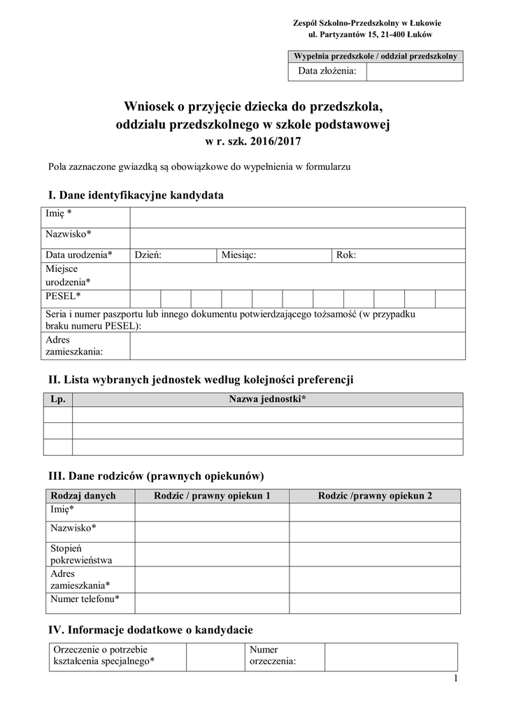 Zespól Szkolno-Przedszkolny w Łukowie ul. Partyzantów 15, 21-400 Łuków Wypełnia przedszkole / oddział przedszkolny Data złożenia: Wniosek o przyjęcie dziecka do przedszkola, oddziału przedszkolnego w szkole podstawowej w r. szk. 2016/2017 Pola zaznaczone gwiazdką są obowiązkowe do wypełnienia w formularzu I. Dane identyfikacyjne kandydata Imię * Nazwisko* Data urodzenia* Miejsce urodzenia* PESEL* Dzień: Miesiąc: Rok: Seria i numer paszportu lub innego dokumentu potwierdzającego tożsamość (w przypadku braku numeru PESEL): Adres zamieszkania: II. Lista wybranych jednostek według kolejności preferencji Lp. Nazwa jednostki* III. Dane rodziców (prawnych opiekunów) Rodzaj danych Imię* Rodzic / prawny opiekun 1 Rodzic /prawny opiekun 2 Nazwisko* Stopień pokrewieństwa Adres zamieszkania* Numer telefonu* IV. Informacje dodatkowe o kandydacie Orzeczenie o potrzebie kształcenia specjalnego* Numer orzeczenia: 1 Deklarowany czas pobytu dziecka w przedszkolu* Istotne dane o stanie zdrowia dziecka , stosowanej diecie i rozwoju psychofizycznym dziecka: od do V. Kryteria przyjęcia (proszę wstawić symbol X w odpowiedniej kratce) Kryteria podstawowe TAK NIE Odmowa podania danych Wielodzietność rodziny kandydata (3 i więcej dzieci). Niepełnosprawność kandydata. Niepełnosprawność jednego z rodziców kandydata. Niepełnosprawność obojga z rodziców kandydata. Niepełnosprawność rodzeństwa kandydata. Samotne wychowywanie kandydata w rodzinie. Objęcie kandydata pieczą zastępczą. Kryteria automatyczne Kandydat mieszka na terenie gminy prowadzącej nabór …………………………………………………….….……… TAK Kryteria dodatkowe NIE Odmowa podania danych Rodzeństwo kandydata uczęszcza do tego przedszkola (szkoły) Lokalizacja przedszkola pierwszego wyboru/szkoły podstawowej, w której znajduje się oddział przedszkolny pierwszego wyboru najbliżej miejsca zamieszkania kandydata. Przynajmniej jeden z rodziców (prawnych opiekunów) kandydata pracuje lub uczy się w systemie dziennym Kandydat będzie korzystał z pełnej oferty przedszkola (nauczania, wychowania i opieki) powyżej 5 godzin dziennie z posiłkami. VI. Oświadczenia dotyczące treści zgłoszenia Oświadczam, że jestem/nie jestem* osobą samotnie wychowującą i nie wychowują żadnego dziecka wspólnie z jego rodzicem. Oświadczam, że posiadam na własnym utrzymaniu …………dzieci.** (wpisać liczbę dzieci) * niepotrzebne skreślić ** Przez dzieci pozostające na własnym utrzymaniu rozumie się dziecko w wieku do ukończenia 18 roku życia lub do ukończenia 25 roku życia w przypadku, gdy dziecko uczy się lub studiuje. Oświadczam, że do Przedszkola Miejskiego Nr 6 w Łukowie lub Szkoły Podstawowej Nr 1 w Łukowie uczęszcza rodzeństwo kandydata: Lp. Imię i nazwisko dziecka Data urodzenia Grupa/Klasa 2 Oświadczam, że wszystkie podane we wniosku dane są zgodne ze stanem faktycznym. Jestem świadomy(a) odpowiedzialności karnej za złożenie fałszywego oświadczenia. Oświadczam, że zapoznałem(am) się z przepisami ustawy z dnia 7 września 1991 r. o systemie oświaty (Dz.U. 2015 poz. 2156 z późn. zm.) obejmującymi zasady rekrutacji do przedszkoli i szkół oraz zasadami wprowadzonymi przez gminę jako organ prowadzący oraz dyrektora placówki, do której kierowany jest niniejszy wniosek. W szczególności mam świadomość przysługujących komisji rekrutacyjnej weryfikującej wniosek uprawnień do potwierdzenia okoliczności wskazanych w powyższych oświadczeniach. Przyjmuję do wiadomości, że w przypadku zakwalifikowania dziecka do placówki będę zobowiązany(a) potwierdzić wolę korzystania z usług placówki w terminie podanym w harmonogramie postępowania rekrutacyjnego. Mam świadomość, że brak potwierdzenia woli w ww. terminie oznacza wykreślenie dziecka z listy zakwalifikowanych i utratę miejsca w placówce. …………………………………… Podpis rodzica/opiekuna prawnego 1 i/lub …………………………………… Podpis rodzica/opiekuna prawnego 2 VII. Oświadczenie dotyczące danych osobowych. Przyjmuję do wiadomości, że zgodnie z ustawą z dnia 29 sierpnia 1997 r. o ochronie danych osobowych (Dz. U. 2015, poz. 2135 z późn. zm.) administratorem danych jest placówka, do której kierowany jest wniosek, a której pełna nazwa i adres jest wskazany na pierwszej stronie wniosku. Mam świadomość przysługującego mi prawa wglądu do treści danych oraz ich poprawienia. Podstawą prawną przetwarzania danych przez placówkę jest art. 23 ust. 1 pkt. 2 ustawy z dnia 29 sierpnia 1997 roku o ochronie danych osobowych (Dz. U. 2015, poz. 2135 z późn. zm.) w związku z art. 20s, 20t, 20z i 20ze ustawy z dnia 7 września 1991 roku o systemie oświaty (Dz.U. 2015 poz. 2156 z późn. zm.). Zakres danych określony jest w przepisach ustawy z dnia 7 września 1991 roku o systemie oświaty (Dz.U. 2015 poz. 2156 z późn. zm.). Rodzic (prawny opiekun) ma prawo odmówić podania określonych informacji, przy czym może to skutkować brakiem możliwości udziału w procesie rekrutacji do placówki lub brakiem możliwości skorzystania z uprawnienia do pierwszeństwa w kwalifikacji. …………………………………… Podpis rodzica/opiekuna prawnego 1 i/lub …………………………………… Podpis rodzica/opiekuna prawnego 2 Verte => 3 Załącznik Nr 1 do Uchwały Nr V/31/2015 Rady Miasta Łuków z dnia 25 lutego 2015 r. Oświadczenie rodzica (prawnego opiekuna) o zatrudnieniu lub pobieraniu nauki w systemie dziennym Ja niżej podpisana/y ….……………………………………………………………………… zamieszkała/y ……………………………………………………………………….………….. legitymująca/y się dowodem osobistym nr ………………. wydanym przez ………………………………………………………………………………... 1) Ośw