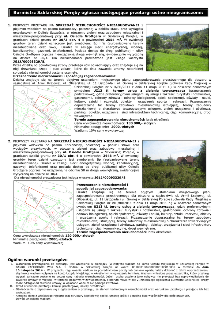 Burmistrz Szklarskiej Poręby ogłasza następujące przetargi ustne nieograniczone: 1. PIERWSZY PRZETARG NA SPRZEDAŻ NIERUCHOMOŚCI NIEZABUDOWANEJ z pięknym widokiem na pasmo Karkonoszy, położonej w pobliżu stawu oraz wyciągów orczykowych w Dolinie Szczęścia, w otoczeniu zieleni oraz zabudowy mieszkalnej i mieszkalno-pensjonatowej przy ul. Osiedle Grottgera w Szklarskiej Porębie, w granicach działki gruntu nr 30/2 obr. 4 o powierzchni 2554 m2. W ewidencji gruntów teren działki oznaczony jest symbolem: Bp i W (zurbanizowane tereny niezabudowane oraz rowy). Działka w zasięgu sieci: energetycznej, wodnej, kanalizacyjnej, gazowej, telefonicznej. Posiada dostęp do drogi publicznej – ulicy Osiedle Grottgera poprzez nieurządzoną drogę wewnętrzną, ewidencyjnie wytyczoną na działce nr 30/4. Dla nieruchomości prowadzona jest księga wieczysta JG1J/00093329/8. Przez działkę od południowej strony przebiega rów odwadniający oraz znajduje się na niej drewniana szopa i plac zabaw, które do dnia zawarcia umowy notarialnej sprzedaży nieruchomości zostaną usunięte. Przeznaczenie nieruchomości i sposób jej zagospodarowania: Działka znajduje się na terenie objętym ustaleniami miejscowego planu zagospodarowania przestrzennego dla obszaru w sąsiedztwie ul. Armii Krajowej, ul. Oficerskiej, ul. 11 Listopada i ul. Górnej w Szklarskiej Porębie (uchwała Rady Miejskiej w Szklarskiej Porębie nr VIII/80/2011 z dnia 11 maja 2011 r.) w obszarze oznaczonym symbolem UZ13 tj. tereny usług z zielenią towarzyszącą (przeznaczenie podstawowe), gdzie preferencyjnymi usługami są usługi z zakresu: turystyki i hotelarstwa, gastronomii, ochrony zdrowia i odnowy biologicznej, opieki społecznej, oświaty i nauki, kultury, sztuki i rozrywki, obiekty i urządzenia sportu i rekreacji. Przeznaczenie dopuszczalne to: tereny zabudowy mieszkaniowej istniejącej, tereny zabudowy mieszkaniowej o charakterze towarzyszącym usługom, zieleń urządzona i użytkowa, parkingi, obiekty, urządzenia i sieci infrastruktury technicznej, ciągi komunikacyjne, drogi wewnętrzne. Termin zagospodarowania nieruchomości: brak określenia Cena wywoławcza nieruchomości: 130 000,- złotych Minimalne postąpienie: 2000,-złotych Wadium: 10% ceny wywoławczej 2. PIERWSZY PRZETARG NA SPRZEDAŻ NIERUCHOMOŚCI NIEZABUDOWANEJ z pięknym widokiem na pasmo Karkonoszy, położonej w pobliżu stawu oraz wyciągów orczykowych, w otoczeniu zieleni oraz zabudowy mieszkalnej i mieszkalno-pensjonatowej przy ul. Osiedle Grottgera w Szklarskiej Porębie, w granicach działki gruntu nr 30/1 obr. 4 o powierzchni 2648 m2. W ewidencji gruntów teren działki oznaczony jest symbolami: Bp (zurbanizowane tereny niezabudowane). Działka w zasięgu sieci: energetycznej, wodnej, kanalizacyjnej, gazowej, telefonicznej oraz posiada dostęp do drogi publicznej ulicy Osiedle Grottgera poprzez nie urządzoną na odcinku 50 m drogę wewnętrzną, ewidencyjnie wytyczoną na działce nr 30/4. Dla nieruchomości prowadzona jest księga wieczysta JG1J/00093329/8 Przeznaczenie nieruchomości i sposób jej zagospodarowania: Działka znajduje się na terenie objętym ustaleniami miejscowego planu zagospodarowania przestrzennego dla obszaru w sąsiedztwie ul. Armii Krajowej, ul. Oficerskiej, ul. 11 Listopada i ul. Górnej w Szklarskiej Porębie (uchwała Rady Miejskiej w Szklarskiej Porębie nr VIII/80/2011 z dnia 11 maja 2011 r.) w obszarze oznaczonym symbolem UZ13 tj. tereny usług z zielenią towarzyszącą, gdzie preferencyjnymi usługami są usługi z zakresu: turystyki i hotelarstwa, gastronomii, ochrony zdrowia i odnowy biologicznej, opieki społecznej, oświaty i nauki, kultury, sztuki i rozrywki, obiekty i urządzenia sportu i rekreacji. Przeznaczenie dopuszczalne to: tereny zabudowy mieszkaniowej istniejącej, tereny zabudowy mieszkaniowej o charakterze towarzyszącym usługom, zieleń urządzona i użytkowa, parkingi, obiekty, urządzenia i sieci infrastruktury technicznej, ciągi komunikacyjne, drogi wewnętrzne. Termin zagospodarowania nieruchomości: brak określenia Cena wywoławcza nieruchomości: 120 000,- złotych Minimalne postąpienie: 2000,-złotych Wadium: 10% ceny wywoławczej Ogólne warunki przetargów: I. Warunkiem przystąpienia do przetargu jest wniesienie w pieniądzu (w złotych) wadium na konto Urzędu Miejskiego w Szklarskiej Porębie w BANKU ZACHODNIM WBK S.A. 1 Oddział w Szklarskiej Porębie nr konta: 03109019840000000100810039 w terminie do dnia 10 listopada 2014 r. W przypadku regulowania wadium za pośrednictwem poczty lub banków wpłatę należy dokonać z takim wyprzedzeniem, aby kwota wadium wpłynęła na konto Urzędu Miejskiego w określonym w ogłoszeniu terminie. Wadium wniesione przez uczestnika, który przetarg wygrał, zaliczone zostanie na poczet ceny nabycia nieruchomości. Jeżeli osoba ustalona jako nabywca nie przystąpi bez usprawiedliwienia do zawarcia umowy w miejscu i w terminie podanym w zawiadomieniu, o którym mowa w pkt VI niniejszego ogłoszenia Burmistrz Szklarskiej Poręby może odstąpić od zawarcia umowy, a wpłacone wadium nie podlega zwrotowi. II. Przed otwarciem przetargu komisji przetargowej należy przedłożyć: - Oświadczenie o zapoznaniu się z ogłoszeniem o przetargu, ze stanem technicznym nieruchomości oraz warunkami przetargu i przyjęciu ich bez zastrzeżeń. - Aktualne dane z właściwego rejestru oraz struktury kapitałowej spółki, umowę spółki i aktualną listę wspólników dla osób prawnych. - Dowód wniesienia wadium. 1 III. IV. V. VI. VII. VIII. IX. Uczestnicy przystępujący do przetargu zobowiązani są do przedłożenia dokumentów stwierdzających tożsamość, a w przypadku osób prawnych również pełnomocnictwo do występowania w ich imieniu. Przetarg jest ważny bez względu na liczbę uczestników przetargu, jeżeli przynajmniej jeden uczestnik zaoferował co najmniej jedno postąpienie powyżej ceny wywoławczej nieruchomości. Wylic