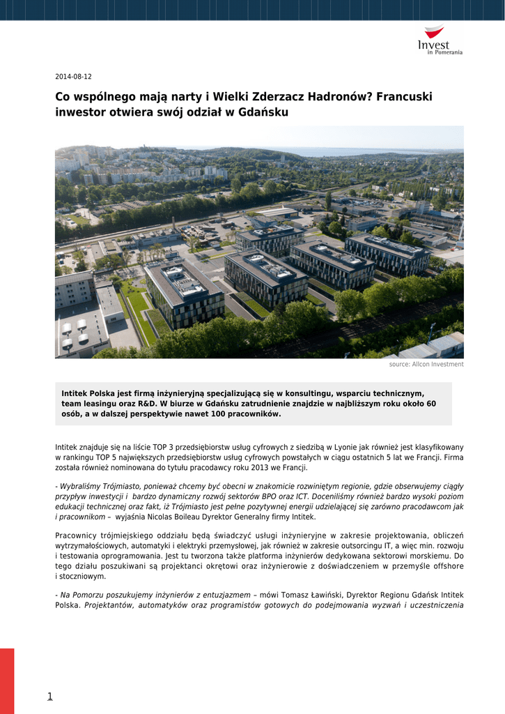 2014-08-12 Co wspólnego mają narty i Wielki Zderzacz Hadronów? Francuski inwestor otwiera swój odział w Gdańsku source: Allcon Investment Intitek Polska jest firmą inżynieryjną specjalizującą się w konsultingu, wsparciu technicznym, team leasingu oraz R&D. W biurze w Gdańsku zatrudnienie znajdzie w najbliższym roku około 60 osób, a w dalszej perspektywie nawet 100 pracowników. Intitek znajduje się na liście TOP 3 przedsiębiorstw usług cyfrowych z siedzibą w Lyonie jak również jest klasyfikowany w rankingu TOP 5 największych przedsiębiorstw usług cyfrowych powstałych w ciągu ostatnich 5 lat we Francji. Firma została również nominowana do tytułu pracodawcy roku 2013 we Francji. - Wybraliśmy Trójmiasto, ponieważ chcemy być obecni w znakomicie rozwiniętym regionie, gdzie obserwujemy ciągły przypływ inwestycji i bardzo dynamiczny rozwój sektorów BPO oraz ICT. Doceniliśmy również bardzo wysoki poziom edukacji technicznej oraz fakt, iż Trójmiasto jest pełne pozytywnej energii udzielającej się zarówno pracodawcom jak i pracownikom – wyjaśnia Nicolas Boileau Dyrektor Generalny firmy Intitek. Pracownicy trójmiejskiego oddziału będą świadczyć usługi inżynieryjne w zakresie projektowania, obliczeń wytrzymałościowych, automatyki i elektryki przemysłowej, jak również w zakresie outsorcingu IT, a więc min. rozwoju i testowania oprogramowania. Jest tu tworzona także platforma inżynierów dedykowana sektorowi morskiemu. Do tego działu poszukiwani są projektanci okrętowi oraz inżynierowie z doświadczeniem w przemyśle offshore i stoczniowym. - Na Pomorzu poszukujemy inżynierów z entuzjazmem – mówi Tomasz Ławiński, Dyrektor Regionu Gdańsk Intitek Polska. Projektantów, automatyków oraz programistów gotowych do podejmowania wyzwań i uczestniczenia 1 w różnorodnych projektach międzynarodowych korporacji jak i małych i średnich przedsiębiorstw. Jak podkreślają managerowie firmy, Intitek stawia na rozwój, dynamikę i budowanie wielozadaniowych zespołów specjalistów. - Doceniamy ludzi aktywnych i z pasją. Wszystkie wyjazdy integracyjne koncentrują się wokół sportu, najczęściej narciarstwa. Nasz dyrektor Generalny to były zawodnik narciarski – dodaje Tomasz Ławiński. Firma jest również sponsorem klubu narciarskiego. - Intitek to firma o ugruntowanej pozycji na rynku francuskim i bardzo szerokim zakresie świadczonych usług. Uważam, że jej wejście na pomorski rynek zaowocuje wieloma ciekawymi ofertami pracy dla naszych inżynierów. Szeroki zakres technologiczny i różnorodność projektów czyni z Intitek wartościowy element pomorskiej gospodarki. Partnerzy inicjatywy Invest in Pomerania będą aktywnie wspierać rozwój spółki w naszym regionie – zapewnia Michał Kacprowicz z Invest in Pomerania. Intitek ma bogate doświadczenie w projektach dla sektorów lotniczego, kolejowego, maszynowego, wojskowego oraz motoryzacyjnego. Wykonywał między innymi dla Airbusa szereg prac projektowych i obliczeniowych związanych z oprzyrządowaniem linii montażowych samolotów A320, A330, A340, A350 jak również stanowiska testów statycznych skrzydeł A380. Współpracował także z firmą Sagem przy rozwijaniu oprogramowania testowego kart GPS dla wojskowego samolotu transportowego Airbus A400M. Z kolei dla Alstom zaprojektował elementy mechaniczne superszybkich pociągów TGV. Firma miała także swój udział w pracach nad dokumentacją Pendolino dla PKP. W zakresie współpracy w sektorze kolejowym warto także wspomnieć współpracę z takimi firmami jak Siemens, Thales czy Ansaldo w zakresie oprogramowania lub sygnalizacji kolejowej przy projektowaniu linii Eurostar pod kanałem La Manche oraz linii metra w Paryżu, Szanghaju i Dubaju. Intitek ma także swój udział w takich spektakularnych przedsięwzięciach jak akcelerator LHC, czyli Wielki Zderzacz Hadronów, dla którego na zlecenie CERN zaprojektował elementy mechaniczne. Intitek posiada także certyfikat „Habilitation Confidentiel Défense” uprawniający do pracy przy poufnych projektach wojskowych i ma na swoim koncie m.in. projekty dla MBDA Missile System związane z wykonaniem szeregu stanowisk testowych oprogramowania pocisków rakietowych. Dla Sagem DS firma rozwijała oprogramowanie Battlefield Managment System dla lekkich pojazdów opancerzonych oraz żołnierzy. Intitek wykonywał także szereg projektów z zakresu rozwoju oprogramowania dla systemów nawigacyjnych okrętów marynarki wojennej jak również dla systemów wojskowej komunikacji satelitarnej oraz taktycznej. Dla podtrzymania lokalnego podejścia do klientów, Intitek Polska otwiera również biura w Poznaniu, Wrocławiu i Warszawie. To już czwarta nowa inwestycja w sektorze ICT w tym roku w Trójmieście. O rozpoczęciu swojej działalności zadecydowały wcześniej już firmy Powel, Schibsted oraz Epam. W tym roku ogłosiło także swoje reinwestycje wielu obecnych na rynku inwestorów, m.in. Sii, Jeppesen Boeing czy Intel. 2
