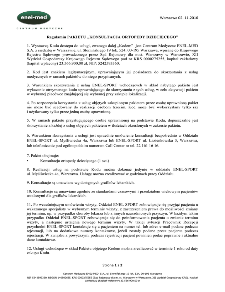 Warszawa 02. 11.2016 Regulamin PAKIETU „KONSULTACJA ORTOPEDY DZIECIĘCEGO” 1. Wystawcą Kodu dostępu do usługi, zwanego dalej „Kodem” jest Centrum Medyczne ENEL-MED S.A. z siedzibą w Warszawie, ul. Słomińskiego 19 lok. 524, 00-195 Warszawa, wpisane do Krajowego Rejestru Sądowego prowadzonego przez Sąd Rejonowy dla m.st. Warszawy w Warszawie, XII Wydział Gospodarczy Krajowego Rejestru Sądowego pod nr KRS 0000275255, kapitał zakładowy (kapitał wpłacony) 23.566.900,00 zł, NIP: 5242593360. 2. Kod jest znakiem legitymacyjnym, uprawniającym jej posiadacza do skorzystania z usług medycznych w ramach pakietów do niego przypisanych. 3. Warunkiem skorzystania z usług ENEL-SPORT wchodzących w skład nabytego pakietu jest wykazanie otrzymanego kodu uprawniającego do skorzystania z tych usług, w celu aktywacji pakietu w wybranej placówce znajdującej się wybranej przy zakupie lokalizacji. 4. Po rozpoczęciu korzystania z usług objętych zakupionym pakietem przez osobę uprawnioną pakiet nie może być scedowany do realizacji osobom trzecim. Kod może być wykorzystany tylko raz i użytkowany tylko przez jedną osobę uprawnioną. 5. W ramach pakietu przysługującego osobie uprawnionej na podstawie Kodu, dopuszczalne jest skorzystanie z każdej z usług objętych pakietem w ilościach określonych w zakresie pakietu. 6. Warunkiem skorzystania z usługi jest uprzednie umówienie konsultacji bezpośrednio w Oddziale ENEL-SPORT ul. Myśliwiecka 4a, Warszawa lub ENEL-SPORT ul. Łazienkowska 3, Warszawa, lub telefonicznie pod ogólnopolskim numerem Call Center nr tel. 22 161 16 16. 7. Pakiet obejmuje: • Konsultacja ortopedy dziecięcego (1 szt.) 8. Realizacji usług na podstawie Kodu można dokonać jedynie w oddziale ENEL-SPORT ul. Myśliwiecka 4a, Warszawa. Usługę można zrealizować w godzinach pracy Oddziału. 9. Konsultacje są umawiane wg dostępnych grafików lekarskich. 10. Konsultacje są umawiane zgodnie ze standardami czasowymi i przedziałem wiekowym pacjentów ustalonymi dla grafików lekarskich. 11. Po wcześniejszym umówieniu wizyty, Oddział ENEL-SPORT zobowiązuje się przyjąć pacjenta u wskazanego specjalisty w wybranym terminie wizyty, z zastrzeżeniem prawa do możliwości zmiany jej terminu, np. w przypadku choroby lekarza lub z innych uzasadnionych przyczyn. W każdym takim przypadku Oddział ENEL-SPORT zobowiązuje się do poinformowania pacjenta o zmianie terminu wizyty, a następnie ustalenia nowego terminu wizyty. W takiej sytuacji Pracownik Recepcji przychodni ENEL-SPORT kontaktuje się z pacjentem na numer tel. lub adres e-mail podane podczas rejestracji, lub na dodatkowe numery kontaktowe, jeżeli zostały podane przez pacjenta podczas rejestracji. W związku z powyższym, podczas rejestracji pacjent powinien podać poprawne i aktualne dane kontaktowe. 12. Usługi wchodzące w skład Pakietu objętego Kodem można zrealizować w terminie 1 roku od daty zakupu Kodu. Strona 1 z 2 Centrum Medyczne ENEL-MED S.A., ul. Słomińskiego 19 lok. 524, 00-195 Warszawa NIP 5242593360, REGON 140802685, KRS 0000275255 (Sąd Rejonowy dla m. st. Warszawy w Warszawie, XII Wydział Gospodarczy KRS). Kapitał zakładowy (kapitał wpłacony) 23.566.900,00 zł Warszawa 02. 11.2016 13. Rabaty związane z Kodem nie łączą się z innymi rabatami i promocjami udzielanymi przez Centrum Medyczne ENEL-MED. S.A. 14. Postanowienia niniejszego Regulaminu określające uprawnienia lub obowiązki Kupującego sprzecznie z prawami Konsumentów wynikającymi z powszechnie obowiązujących przepisów prawa lub też naruszające interesy konsumentów nie dotyczą Konsumentów. Strona 2 z 2 Centrum Medyczne ENEL-MED S.A., ul. Słomińskiego 19 lok. 524, 00-195 Warszawa NIP 5242593360, REGON 140802685, KRS 0000275255 (Sąd Rejonowy dla m. st. Warszawy w Warszawie, XII Wydział Gospodarczy KRS). Kapitał zakładowy (kapitał wpłacony) 23.566.900,00 zł