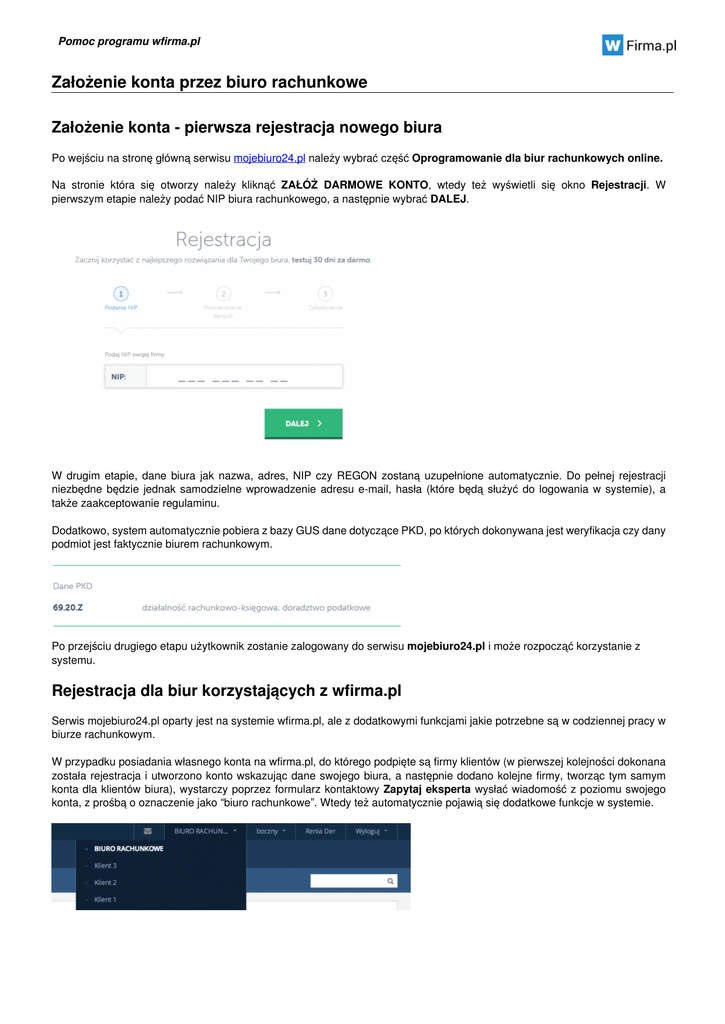 Pomoc programu wfirma.pl Założenie konta przez biuro rachunkowe Założenie konta - pierwsza rejestracja nowego biura Po wejściu na stronę główną serwisu mojebiuro24.pl należy wybrać część Oprogramowanie dla biur rachunkowych online. Na stronie która się otworzy należy kliknąć ZAŁÓŻ DARMOWE KONTO, wtedy też wyświetli się okno Rejestracji. W pierwszym etapie należy podać NIP biura rachunkowego, a następnie wybrać DALEJ. W drugim etapie, dane biura jak nazwa, adres, NIP czy REGON zostaną uzupełnione automatycznie. Do pełnej rejestracji niezbędne będzie jednak samodzielne wprowadzenie adresu e-mail, hasła (które będą służyć do logowania w systemie), a także zaakceptowanie regulaminu. Dodatkowo, system automatycznie pobiera z bazy GUS dane dotyczące PKD, po których dokonywana jest weryfikacja czy dany podmiot jest faktycznie biurem rachunkowym. Po przejściu drugiego etapu użytkownik zostanie zalogowany do serwisu mojebiuro24.pl i może rozpocząć korzystanie z systemu. Rejestracja dla biur korzystających z wfirma.pl Serwis mojebiuro24.pl oparty jest na systemie wfirma.pl, ale z dodatkowymi funkcjami jakie potrzebne są w codziennej pracy w biurze rachunkowym. W przypadku posiadania własnego konta na wfirma.pl, do którego podpięte są firmy klientów (w pierwszej kolejności dokonana została rejestracja i utworzono konto wskazując dane swojego biura, a następnie dodano kolejne firmy, tworząc tym samym konta dla klientów biura), wystarczy poprzez formularz kontaktowy Zapytaj eksperta wysłać wiadomość z poziomu swojego konta, z prośbą o oznaczenie jako “biuro rachunkowe”. Wtedy też automatycznie pojawią się dodatkowe funkcje w systemie. Pomoc programu wfirma.pl Jeśli natomiast założono konto, ale bezpośrednio dla klienta biura, na którym dokonywane są jego rozliczenia, to konieczne jest założenie kolejnego konta dla siebie poprzez załóż konto (więcej informacji w części pierwszej: Założenie konta - pierwsza rejestracja nowego biura). Po utworzeniu konta będzie ono automatycznie oznaczone jako biuro rachunkowe. Aby zintegrować wcześniej założone konto klienta ze swoim, należy zalogować się na konto danego klienta, przejść do zakładki USTAWIENIA » INNE » UŻYTKOWNICY oraz wybrać opcję Przypnij użytkownika. W otwartym oknie należy: w części uprawnień wybrać Administrator, w polu adresu mailowego wskazać ten, który służy jako login dla Szefa biura (adres mailowy, na którym założone zostało konto biura rachunkowego). Wtedy też przy logowaniu do swojego konta, pojawi się kokpit z podpiętymi firmami - klientami biura. Powered by TCPDF (www.tcpdf.org)