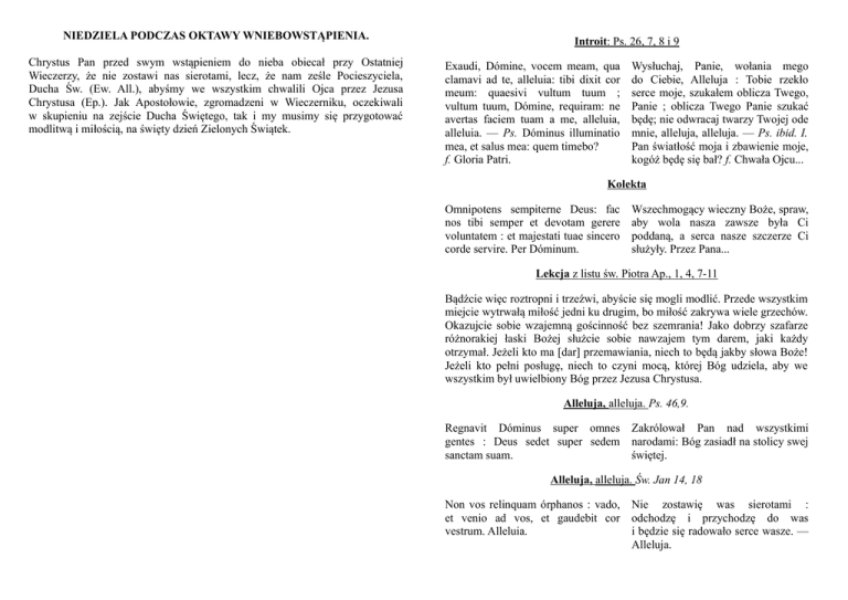 NIEDZIELA PODCZAS OKTAWY WNIEBOWSTĄPIENIA. Chrystus Pan przed swym wstąpieniem do nieba obiecał przy Ostatniej Wieczerzy, że nie zostawi nas sierotami, lecz, że nam ześle Pocieszyciela, Ducha Św. (Ew. All.), abyśmy we wszystkim chwalili Ojca przez Jezusa Chrystusa (Ep.). Jak Apostołowie, zgromadzeni w Wieczerniku, oczekiwali w skupieniu na zejście Ducha Świętego, tak i my musimy się przygotować modlitwą i miłością, na święty dzień Zielonych Świątek. Introit: Ps. 26, 7, 8 i 9 Exaudi, Dómine, vocem meam, qua clamavi ad te, alleluia: tibi dixit cor meum: quaesivi vultum tuum ; vultum tuum, Dómine, requiram: ne avertas faciem tuam a me, alleluia, alleluia. — Ps. Dóminus illuminatio mea, et salus mea: quem timebo? f. Gloria Patri. Wysłuchaj, Panie, wołania mego do Ciebie, Alleluja : Tobie rzekło serce moje, szukałem oblicza Twego, Panie ; oblicza Twego Panie szukać będę; nie odwracaj twarzy Twojej ode mnie, alleluja, alleluja. — Ps. ibid. I. Pan światłość moja i zbawienie moje, kogóż będę się bał? f. Chwała Ojcu... Kolekta Omnipotens sempiterne Deus: fac nos tibi semper et devotam gerere voluntatem : et majestati tuae sincero corde servire. Per Dóminum. Wszechmogący wieczny Boże, spraw, aby wola nasza zawsze była Ci poddaną, a serca nasze szczerze Ci służyły. Przez Pana... Lekcja z listu św. Piotra Ap., 1, 4, 7-11 Bądźcie więc roztropni i trzeźwi, abyście się mogli modlić. Przede wszystkim miejcie wytrwałą miłość jedni ku drugim, bo miłość zakrywa wiele grzechów. Okazujcie sobie wzajemną gościnność bez szemrania! Jako dobrzy szafarze różnorakiej łaski Bożej służcie sobie nawzajem tym darem, jaki każdy otrzymał. Jeżeli kto ma [dar] przemawiania, niech to będą jakby słowa Boże! Jeżeli kto pełni posługę, niech to czyni mocą, której Bóg udziela, aby we wszystkim był uwielbiony Bóg przez Jezusa Chrystusa. Alleluja, alleluja. Ps. 46,9. Regnavit Dóminus super omnes Zakrólował Pan nad wszystkimi gentes : Deus sedet super sedem narodami: Bóg zasiadł na stolicy swej sanctam suam. świętej. Alleluja, alleluja. Św. Jan 14, 18 Non vos relinquam órphanos : vado, Nie zostawię was sierotami : et venio ad vos, et gaudebit cor odchodzę i przychodzę do was vestrum. Alleluia. i będzie się radowało serce wasze. — Alleluja. Dalszy ciąg Ewangelii według św. Jana, 15. 26-27 i 16, 1-4. Gdy jednak przyjdzie Pocieszyciel, którego Ja wam poślę od Ojca, Duch Prawdy, który od Ojca pochodzi, On będzie świadczył o Mnie. Ale wy też świadczycie, bo jesteście ze Mną od początku. To wam powiedziałem, abyście się nie załamali w wierze. Wyłączą was z synagogi. Owszem, nadchodzi godzina, w której każdy, kto was zabije, będzie sądził, że oddaje cześć Bogu. Będą tak czynić, bo nie poznali ani Ojca, ani Mnie. Ale powiedziałem wam o tych rzeczach, abyście, gdy nadejdzie ich godzina, pamiętali o nich, że Ja wam to powiedziałem. Ofertorium Ps. 46, 6 Ascendit Deus in jubilatióne; Wstąpił Bóg przy okrzykach et Dóminus in voce tubae, alleluia. radosnych : i Pan przy odgłosie trąb, alleluja. Sekreta Sacrificia nos, Dómine, immaculata purificent: et mentibus nostris supernae gratiss dent vigorem. Per Dóminum. Niech te niepokalane ofiary oczyszczą dusze nasze, Panie, i wzmocnią je łaską niebieską. Przez Pana... Komunia Św. Jan 17, 12-13, 15 Pater, cum essem cum eis, ego servabam eos, quos dedisti mihi, alleluia : nunc autem ad te venio: non rogo, ut tollas eos de mundo, sed ut serves eos a .malo, alleluia alleluia. Ojcze, gdym z nimi był, jam ich zachował, których mi dałeś, alleluja : a teraz idę do Ciebie : nie proszę, abyś ich wziął ze świata, ale żebyś ich zachował od złego, alleluja, alleluja. Po Komunii Repleti, Dómine, muneribus sacris: da, quaesumus: ut in gratiarum semper actióne maneamus. Per Dóminum. Świętymi darami zasileni, spraw, prosimy Cię, Panie, abyśmy w dziękczynieniu Ci nie ustawali. Przez Pana...