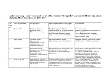 Zestawienie uwag i opinii wniesionych do projektu dokumentu Strategii Rozwiązywania Problemów Społecznych dla Gminy Miasto Szczecin na lata 2015- 2020 Autor uwagi opinii Uwaga, opinia Sposób wykorzystania uwagi opinii Uzasadnienie Marcin Szneider Postulat zwiększenia dostępności terapii behawioralno-poznawczej Uwzględniono poprzez dodanie w rekomendacjach na str. 80 zapisu o potrzebie zwiększania dostępu do terapii psychologicznej dla osób w sytuacjach kryzysu psychicznego i po takich kryzysach Zwiększenie dostępu do pomocy psychologicznej i psychoterapii nie budzi wątpliwości . Nie jest natomiast możliwe i zasadne by dokument Strategii rekomendował określone szkoły czy metody terapii 2. Marcin Szneider Oferowanie pomocy psychologicznej zainteresowanym nie tylko uzależnionym jako forma działań profilaktycznych Uwzględniono poprzez dodanie odpowiedniego zapisu w rekomendacjach Pomoc taka winna być oferowana rzeczywiście nie tylko osobom z problemem uzależnienia 3. Marta Faryniarz Postulat utworzenia w Szczecinie formy całodobowego pobytu dla osób z niepełnosprawnością intelektualną i towarzyszącymi sprzężeniami. Uwzględniono poprzez zmianę zapisów dot. mieszkań chronionych w części wykonawczej dot. osób z zaburzeniami psychicznymi 4. Dorota Korczyńska Brak odniesienia do innych kategorii niż bezrobotni w części diagnostycznej poświęconej rynkowi pracy . Uwagę uwzględniono poprzez dodanie w tej części uwagi o pożądanym zwiększeniu wskaźnika osób aktywnych zawodowo we wszystkich kategoriach wiekowych osób w wieku produkcyjnym Praktykowaną już formą wspierania takich osób jest mieszkalnictwo chronione A w kontekście zawartej uwagi o prawie do życia pośród społeczeństwa a nie poza nim, forma pobytu w mieszkaniu chronionym oferowana takim osobom wydaje się bardziej zasadna niż pobyt w domu pomocy społecznej Część wykonawcza Strategii we wszystkich obszarach wydzielonych ze względu na typ głównego adresata działań posiada zapisy dot. bądź to ułatwień w uzyskaniu zatrudnienia bądź tworzenia specjalnych programów aktywizujących zawodową tą kategorię Nr uwa gi 1 5. Dorota Korczyńska Enigmatyczna informacja dotycząca programów zdrowotnych finansowanych ze środków Gminy Szczecin bez wyjaśnienia przyczyn spadku liczby takich programów. Uwaga pominięta 6. Dorota Korczyńska Informacja o spadku liczby stołówek szkolnych pozbawiona wyjaśnienia Uwaga pominięta. 7. Dorota Korczyńska Brak odniesienia w diagnozie do sytuacji edukacyjnej Uwaga pominięta 8 Dorota Korczyńska Brak wyjaśnienia spadku zainteresowania ofertą niektórych instytucji kultury Uwaga pominięta adresatów Opis w tej części dokumentu oddaje stan faktyczny oraz potwierdza potrzebę wykorzystania potencjału Natomiast kierunki rozwoju takiej aktywności Miasta winny być poprzedzone na nowo opracowaną polityką zdrowotną Miasta co nie było możliwe w ramach prac nad tym dokumentem. Udokumentowana informacja o spadku liczby takich programów jest wartościowym i inspirującym oddaniem stanu faktycznego nawet jeśli nie zawiera przyczyny tego stanu. Natomiast tam gdzie taka potrzeba jest dostrzeżona i pozadyskusyjna n.p. w zakresie wspierania seniorów została ujęta w zestawie planowanych działań. Spadek ten jest bardzo nieznaczny i związany z przekształceniami struktury placówek oświatowych . A możliwości oferowania pomocy poprzez finansowanie posiłków w szkołach, przedszkolach raczej rosną , podobnie jak liczba korzystających w uproszczonej procedurze na wniosek samej szkoły. Nie kwestionując zasadności tezy o strategicznym wymiarze jakości i rodzaju edukacji ustalenia w tej kwestii ujęte są takich dokumentach jak polityka edukacyjna Miasta Szczecina i Strategia Rozwoju Szczecina Natomiast potrzeba współdziałania w bardzo wielu zadaniach między sektorem oświaty a pomocy społecznej i lepszego przepływu informacji jest ujęta w bardzo wielu działaniach i zadaniach dot. poszczególnych obszarów i adresatów Ocena trafności oferty kulturalnej poszczególnych instytucji kultury przekracza ramy opracowania Strategii 9. Dorota Korczyńska Enigmatyczna informacja o braku świetlic na str. 52 Uwaga pominięta W tekście wyraźnie wskazano na ograniczony dostęp w korzystaniu ze świetlic szkolnych przez dzieci jedynie formalnie zatrudnionych rodziców a w rekomendacjach ujęta jest potrzeba rozszerzania oferty nieodpłatnych zajęć sportowych, .artystycznych i innych oferowanych na terenie szkół Doprecyzowanie informacji na ten temat wydaje się zasadne tym bardziej że w części wykonawczej dot. obszaru „Rodzina „o rozbudowie infrastruktury placówek wsparcia dziennego jest mowa. 10. Dorota Korczyńska Brak odniesienia do problemu powrotu na rynek pracy kobiet po urodzeniu dziecka W opisie działań dotyczących bezrobocia i ograniczenia ubóstwa dodano zapis dotyczący poprawy warunków i możliwości podjęcia pracy przez osoby po urodzeniu dziecka 11. Dorota Korczyńska Brak odniesienia do zadłużenia lokatorów mieszkań komunalnych Uwaga uwzględniona poprzez dodanie w rekomendacjach zapisu dotyczącego zadłużonych lokatorów mieszkań komunalnych. 12. Dorota Korczyńska Brak odniesienia do kwestii aktywizacji społecznej, zawodowej, edukacyjnej osób niepełnosprawnych Uwaga pominięta 13. Dorota Korczyńska Brak bardziej szczegółowych Uwzględniono poprzez dodanie w części Inne rozwiązania sprzyjające godzeniu pracy zawodowej z wychowaniem dzieci ( dostępność do opieki żłobkowej , szczeciński bon opiekuńczy ) ale i planowane w zakresie rozwiązań ustawowych, realizowane są niezależnie od podjętych ustaleń w tej kwestii przez Strategię Zadłużenie takie na pewno w części przypadków jest przejawem ubóstwa ale nie jego przyczyną a podstawową strategią ograniczania tego zjawiska winno być aktywizowanie lokatorów i oferowanie im możliwości wzrostu dochodów. W do