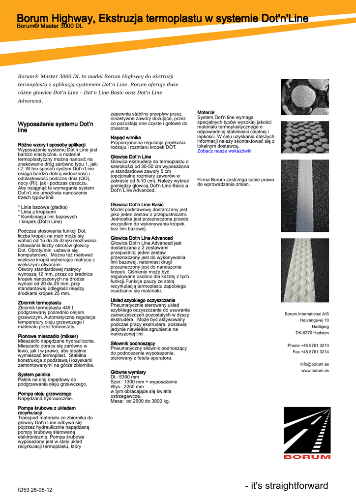 Borum Highway, Ekstruzja termoplastu w systemie Dot'n'Line Borum® Master 3000 DL Borum® Master 3000 DL to model Borum Highway do ekstruzji termoplastu z aplikacją systemem Dot’n Line. Borum oferuje dwie różne głowice Dot'n Line – Dot'n Line Basic oraz Dot'n Line Advanced. Wyposażenie systemu Dot’n line Różne wzory i sposoby aplikacji Wyposażenie systemu Dot'n Line jest bardzo elastyczne, a materiał termoplastyczny można nanosić na znakowanie dróg zarówno typu 1, jaki i 2. W ten sposób system Dot’n’Line osiąga bardzo dobrą widoczność i odblaskowość podczas dnia (QD), nocy (RI), jak i podczas deszczu. Aby osiągnąć te wymagania system Dot’n’Line umożliwia nanoszenie trzech typów linii: * Linia bazowa (gładka) * Linia z kropkami * Kombinacja linii bazowych i kropek (Dot'n Line) Podczas stosowania funkcji Dot, liczba kropek na metr może się wahać od 15 do 35 dzięki możliwości ustawiania liczby obrotów głowicy Dot. Obroty/min. ustawia się komputerowo. Można też malować większe kropki wybierając matrycę z większymi otworami. Otwory standardowej matrycy wynoszą 12 mm, przez co średnica kropek nanoszonych na drodze wynosi od 20 do 25 mm, przy standardowej odległość między środkami kropek 25 mm. Zbiornik termoplastu Zbiornik termoplastu 445 l podgrzewany pośrednio olejem grzewczym. Automatyczna regulacja temperatury oleju grzewczego i materiału przez termostaty. Pionowe mieszadło (mikser) Mieszadło napędzane hydraulicznie. Mieszadło obraca się zarówno w lewo, jak i w prawo, aby idealnie wymieszać termoplast. Stabilna konstrukcja z podstawą i łożyskami zamontowanymi na górze zbiornika. System palnika Palnik na olej napędowy do podgrzewania oleju grzewczego. Pompa oleju grzewczego Napędzana hydraulicznie. zapewnia stabilny przepływ przez nieaktywne zawory dozujące, przez co pozostają one czyste i gotowe do otwarcia. Napęd wirnika Proporcjonalna regulacja prędkości rodzaju i rozmiaru kropek DOT. Głowice Dot`n Line Głowica ekstrudera do termoplastu o szerokości od 30-50 cm wyposażona w standardowe zawory 5 cm (opcjonalne rozmiary zaworów w zakresie od 5-10 cm). Należy wybrać pomiędzy głowicą Dot'n Line Basic a Dot'n Line Advanced. Materiał System Dot'n line wymaga specjalnych typów wysokiej jakości materiału termoplastycznego o odpowiedniej stabilności cieplnej i lepkości. W celu uzyskania dalszych informacji należy skontaktować się z lokalnym dostawcą. Zobacz nasze wskazówki Firma Borum zastrzega sobie prawo do wprowadzania zmian. Głowica Dot'n Line Basic Model podstawowy dostarczany jest jako jeden zestaw z przepustnicami. Jednostka jest przeznaczona przede wszystkim do wykonywania kropek bez linii bazowej. Głowica Dot'n Line Advanced Głowica Dot'n Line Advanced jest dostarczana z 2 zestawami przepustnic; jeden zestaw przeznaczony jest do wykonywania linii bazowej, natomiast drugi przeznaczony jest do nanoszenia kropek. Ciśnienie może być regulowane osobno dla każdej z tych funkcji.Funkcja pauzy ze stałą recyrkulacją termoplastu zapobiega osadzaniu się materiału. Układ szybkiego oczyszczania Pneumatycznie sterowany układ szybkiego oczyszczania do usuwania zanieczyszczeń pozostałych w dyszy ekstrudera. Może być aktywowany podczas pracy ekstrudera, zostawia jedynie niewielkie zgrubienie na nanoszonej linii. Siłownik podnoszący Pneumatyczny siłownik podnoszący do podnoszenia wyposażenia, sterowany z fotela operatora. Główne wymiary Dł.: 5350 mm Szer.: 1300 mm + wyposażenie Wys.: 2250 mm w tym obracające się światła ostrzegawcze. Masa: od 2600 do 3800 kg. Borum International A/S Højvangsvej 10 Hadbjerg DK-8370 Hadsten Phone +45 8761 3213 Fax +45 8761 3214 [email protected] www.borum.as Pompa śrubowa z układem recyrkulacji Transport materiału ze zbiornika do głowicy Dot'n Line odbywa się poprzez hydraulicznie napędzaną pompy śrubową sterowaną elektronicznie. Pompa śrubowa wyposażona jest w stały układ recyrkulacji termoplastu, który ID53 28-06-12 - it's straightforward