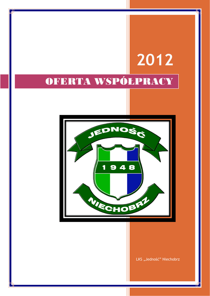 2012 OFERTA WSPÓŁPRACY LKS „Jedność” Niechobrz Szanowni Państwo! Pragniemy złożyć ofertę wystąpienia Państwa Firmy lub produktu w charakterze sponsora Naszego klubu sportowego w roku 2012. Piłka nożna to jedna z najpopularniejszych dyscyplin sportowych zarówno w Polsce, jak i na świecie. Naszą ideą jest głównie szkolenie dzieci i młodzieży, a także dorosłych zachowując indywidualne podejście do każdego piłkarza. Nasz Klub działa od ponad 60 lat. Każdego roku stawiamy sobie coraz wyższe cele i z mniejszym lub większym powodzeniem je realizujemy. Nieustannie staramy się podnosić sobie poprzeczkę, zbierając bagaż doświadczeń i podnosząc kwalifikacje zawodników po przez udział nie tylko w rozgrywkach piłkarskich organizowanych przez Okręgowy Związek Piłki Nożnej, ale także w okolicznościowych turniejach oraz rozgrywkach piłki halowej. Staramy się na bieżąco dokształcać nasza kadrę szkoleniową, aby jak najefektywniej wpływać na poziom naszych zawodników. Piłkarze „Jedności” niemal rokrocznie zdobywają tytuł najlepszej drużyny Gminy Boguchwała w turnieju o Puchar Burmistrza. W chwili obecnej nasz klub zrzesza ok. 60 członków od najmłodszych juniorów (rocznik 1995) po najstarszych weteranów boiska. Państwa obecność w naszym projekcie, jako Sponsora Strategicznego, Sponsora lub Firmy Wspierającej będzie doskonałą promocją jak i utrwali Państwa wizerunek, jako aktywnej marki na rynku a Nam pozwoli na świadczenie usług na jeszcze wyższym poziomie i będzie dla Nas jednocześnie poparciem z Państwa strony i wyróżnieniem dla podejmowanych przez Nas inicjatyw. Zapraszamy do zapoznania się z Naszą ofertą. Z przyjemnością spotkamy się z Państwem, by móc przybliżyć naszą działalność oraz określić możliwe wspólne obszary działań a także by odpowiedzieć na Państwa pytania. Mamy nadzieję, że Nasza współpraca przyniesie obu stronom satysfakcję. Z piłkarskim pozdrowieniem Zarząd Ludowego Klubu Sportowego „JEDNOŚĆ” Niechobrz 2 >> NASZE PLANY NA PRZYSZŁOŚĆ << W 2012 roku w pełni zostanie oddany do użytku świeżo wyremontowany i rozbudowany Obiekt Sportowy. Już dziś w budynku Klubu mamy do dyspozycji siłownie oraz profesjonalne szatnie, a na zewnątrz boisko treningowe. Od wiosny do dyspozycji będziemy mied pełno wymiarowe boisko piłkarskie, kort tenisowy oraz boisko do piłki siatkowej, a dla kibiców trybuna dla 400 widzów oraz 2 parkingi. W związku z powyższym w nadchodzącym roku 2012 planujemy: Wyposażyd pomieszczenia znajdujące się w budynku poprawiając ich funkcjonalnośd m.in. utworzyd pralnie oraz stworzyd coś w rodzaju klubo-kawiarni dla zawodników oraz członków Klubu. Doposażyd zaplecze sportowe po przez zakup nowego sprzętu sportowego tj. piłek do „nogi” i „siatki”, sprzętu do tenisa ziemnego, nowych stroi dla zawodników. Chcielibyśmy poszerzyd nasz wachlarz usług o utworzenie sekcji tenisa ziemnego dla najmłodszych mieszkaoców, gdyż dostrzegamy duże możliwości w tej dziedzinie sportu, która staje się coraz popularniejsza w naszym kraju. Planujemy zorganizowanie oficjalnego meczu otwarcia obiektu, w którym to nasza drużyna, zmierzyłaby się z jedną z wiodących drużyn z Podkarpacia. Chcemy także udostępnid darmowy bezprzewodowy dostęp do Internetu dla wszystkich przebywających w obrębie obiektu. W związku z szansami, jakie daje Internet chcemy prowadzid relacje na żywo z organizowanych na obiekcie wydarzeo, na początku w formie tekstowej, ale docelowo także transmisje internetowe VIDEO. Dzięki temu stalibyśmy się prekursorem takiego rozwiązania nie tylko na Podkarpaciu, ale i Polsce, Jednocześnie stając się atrakcyjniejsi dla potencjalnego sponsora. 3 Żaden z naszych dotychczasowych sukcesów nie miałby miejsca, gdyby nie zaangażowanie sponsorów, którzy wspierając nas promowali równocześnie własne firmy, produkty czy usługi. Przedstawioną ofertą chcielibyśmy zachęcid również Paostwa do wykorzystania naszej pasji, pracy i zaangażowania, do tej niekonwencjonalnej formy promocji Waszej Firmy. >> PROPOZYCJA I WARUNKI WSPÓŁPRACY << Proponowane formy: Wkład finansowy- Środki pieniężne, w tym także darowizny, pokrycie kosztów promocji (drukowanie plakatów, ulotek, wykonanie standów, banerów itp.), na podstawie przedstawionych faktur lub jako usługa wykonana przez sponsora, wartość przeprowadzonych szkoleń. Wkład rzeczowy- nagrody rzeczowe, produkty firmy, sprzętu, gadżety sponsorskie. Przykładowa oferta współpracy: KORZYŚCI WKŁAD SPONSOR STRATEGICZNY SPONSOR FIRMA WSPIERAJĄCA Ponad 30000 PLN (rocznie) Od 2000 PLN (rocznie) Do 2000 PLN (jednorazowo) Strona 5 Strona 6 Strona 7 Wyłącznośd tytularna OFERTA Logo na strojach i sprzęcie Banery reklamowe (obiekt) Logo oraz link na stronie klubu Logo – ulotki, plakaty Reklama podczas transmisji Live SZCZEGÓŁOWA OFERTA 4 PAKIET I Sponsor Strategiczny Cena: min. 35.000 zł rocznie (możliwość płatności w transzach) Sponsor Strategiczny to: firma, instytucja, osoba fizyczna, która chciałaby nawiązać długoterminową współpracę z LKS „Jedność” Niechobrz Oferta dla Sponsora Strategicznego: Wyłączność na tytuł oficjalnego strategicznego sponsora LKS „Jedność” Niechobrz prawo do wykorzystywania nazwy „sponsor strategiczny”; Zamieszczenie nazwy sponsora w nazwie drużyny; Ekspozycja logotypu sponsora na strojach meczowych zespołu seniorów (koszulka meczowa: przód lub plecy lub rękawki; spodenki: przód lub tył) stroje i odzież używana po za meczami (dresy, koszulki wyjściowe); Banery reklamowe przy liniach bocznych boiska- na ogrodzeniach wokół boiska; Stojaki informacyjne na terenie obiektu sportowego; Logo i link sponsora głównego w eksponowanym miejscu na oficjalnej witrynie internetowej klubu www.jednosc.futbolowo.pl oraz stronie www.niechobrz.pl; Logo firmy na materiałach reklamowych