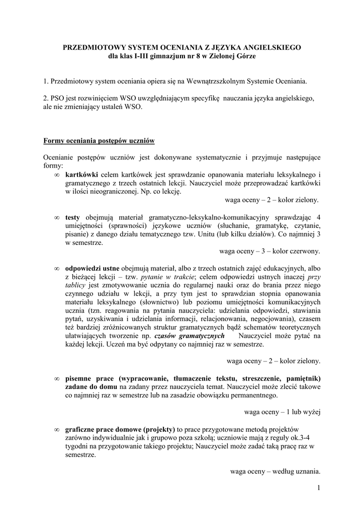 PRZEDMIOTOWY SYSTEM OCENIANIA Z JĘZYKA ANGIELSKIEGO dla klas I-III gimnazjum nr 8 w Zielonej Górze 1. Przedmiotowy system oceniania opiera się na Wewnątrzszkolnym Systemie Oceniania. 2. PSO jest rozwinięciem WSO uwzględniającym specyfikę nauczania języka angielskiego, ale nie zmieniający ustaleń WSO. Formy oceniania postępów uczniów Ocenianie postępów uczniów jest dokonywane systematycznie i przyjmuje następujące formy: • kartkówki celem kartkówek jest sprawdzanie opanowania materiału leksykalnego i gramatycznego z trzech ostatnich lekcji. Nauczyciel może przeprowadzać kartkówki w ilości nieograniczonej. Np. co lekcję. waga oceny – 2 – kolor zielony. • testy obejmują materiał gramatyczno-leksykalno-komunikacyjny sprawdzając 4 umiejętności (sprawności) językowe uczniów (słuchanie, gramatykę, czytanie, pisanie) z danego działu tematycznego tzw. Unitu (lub kilku działów). Co najmniej 3 w semestrze. waga oceny – 3 – kolor czerwony. • odpowiedzi ustne obejmują materiał, albo z trzech ostatnich zajęć edukacyjnych, albo z bieżącej lekcji – tzw. pytanie w trakcie; celem odpowiedzi ustnych inaczej przy tablicy jest zmotywowanie ucznia do regularnej nauki oraz do brania przez niego czynnego udziału w lekcji, a przy tym jest to sprawdzian stopnia opanowania materiału leksykalnego (słownictwo) lub poziomu umiejętności komunikacyjnych ucznia (tzn. reagowania na pytania nauczyciela: udzielania odpowiedzi, stawiania pytań, uzyskiwania i udzielania informacji, relacjonowania, negocjowania), czasem też bardziej zróżnicowanych struktur gramatycznych bądź schematów teoretycznych ułatwiających tworzenie np. czasów gramatycznych Nauczyciel może pytać na każdej lekcji. Uczeń ma być odpytany co najmniej raz w semestrze. waga oceny – 2 – kolor zielony. • pisemne prace (wypracowanie, tłumaczenie tekstu, streszczenie, pamiętnik) zadane do domu na zadany przez nauczyciela temat. Nauczyciel może zlecić takowe co najmniej raz w semestrze lub na zasadzie obowiązku permanentnego. waga oceny – 1 lub wyżej • graficzne prace domowe (projekty) to prace przygotowane metodą projektów zarówno indywidualnie jak i grupowo poza szkołą; uczniowie mają z reguły ok.3-4 tygodni na przygotowanie takiego projektu; Nauczyciel może zadać taką pracę raz w semestrze. waga oceny – według uznania. 1 • prace domowe, zadania domowe, aktywność. Nauczyciel sprawdza zadania tego typu na każdej lekcji. Oceny mogą być co lekcje lub w razie potrzeby. waga oceny – 1- kolor niebieski • plusy za aktywność, prace na lekcji, wiedze bieżącą, inne. Uczeń może zostać nagrodzony plusem małym lub dużym. Mały plus x 5 = piątka. Duży plus x 3 = szóstka. Regularnie. waga oceny 1 – kolor czarny Kryteria oceniania obejmujące zakres umiejętności ucznia na poszczególne oceny: W każdym semestrze uczeń uzyskuje oceny cząstkowe za poszczególne umiejętności. Ocenianie ucznia przyjmuje powyżej wymienione formy. Na podstawie ocen cząstkowych nauczyciel wystawia oceny śródroczne i roczne. Nauczyciel stosuje następujące kryteria: GRAMATYKA I SŁOWNICTWO Ocenę celującą otrzymuje uczeń, który: • • • bezbłędnie operuje wszystkimi strukturami gramatycznymi; z testów językowych otrzymuje oceny bardzo dobre i celujące stosuje różnorodność struktur oraz posiada dużą swobodę w doborze słownictwa; używa bogatego słownictwa o charakterze złożonym Ocenę bardzo dobrą otrzymuje uczeń, który: • potrafi poprawnie operować wszystkimi strukturami gramatycznymi; • bez trudu buduje spójne zdania; Ocenę dobrą otrzymuje uczeń, który: • • potrafi operować wszystkimi strukturami gramatycznymi (dopuszczalne są drobne i nieliczne błędy); potrafi budować logiczne zdania; Ocenę dostateczną otrzymuje uczeń, który: • • potrafi operować podstawowymi strukturami gramatycznymi; umie budować proste zdania, popełniając błędy nie zakłócające rozumienia, używa prostego słownictwa. 2 Ocenę dopuszczającą otrzymuje uczeń, który: • • • potrafi poprawnie operować niewielką ilością struktur gramatycznych; potrafi budować zdania, ale przeważnie niespójne; dysponuje ubogim zakresem słownictwa. MÓWIENIE Ocenę celującą otrzymuje uczeń, który: • • • • potrafi płynnie i swobodnie wypowiadać się, stosując i różnorodność struktur bezbłędnie i naturalnie reaguje w sytuacjach dnia codziennego; prawidłowo wymawia; prezentuje pełną poprawność językową. bogatą leksykę Ocenę bardzo dobrą otrzymuje uczeń, który: • • • • potrafi płynnie i swobodnie wypowiadać się; prezentuje całkowitą poprawność językową (wymowa, gramatyczne i leksykalne); umie w naturalny sposób zabierać głos w rozmowie; dysponuje dużym zakresem słownictwa. intonacja, struktury Ocenę dobrą otrzymuje uczeń, który: • • potrafi mówić spójnie z lekkim wahaniem; posługuje się w miarę poprawnym językiem, popełniając nieliczne błędy, nie zakłócające możliwości porozumienia się; Ocenę dostateczną otrzymuje uczeń, który: • • posługuje się prostym słownictwem, mało urozmaiconym, popełnia błędy w wymowie mogące zakłócać zrozumienie wypowiedzi; Ocenę dopuszczającą otrzymuje uczeń, który: • • posługuje się ubogim słownictwem, popełnia wiele zauważalnych błędów potrafi porozumieć się w ograniczonym zakresie. Ocenę niedostateczną otrzymuje uczeń, który: • • wypowiada się w sposób niezrozumiały lub całkowicie nie na temat; udziela błędnych odpowiedzi na pytania rozmówcy lub w ogóle nie odpowiada; PISANIE Ocenę celującą otrzymuje uczeń, który: • pisze spójnie, logicznie stosując różnorodność myśli i argumentów; 3 • • • potrafi stosować różnorodne wypowiedzi pisemne np.: list, charakterystyka. jest gotowy prowadzić prace na rzecz klasy (gazetki tematyczne itp.) prowadzi portfolio