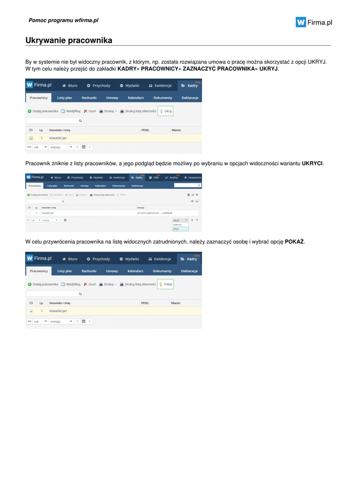 Pomoc programu wfirma.pl Ukrywanie pracownika By w systemie nie był widoczny pracownik, z którym, np. została rozwiązana umowa o pracę można skorzystać z opcji UKRYJ. W tym celu należy przejść do zakładki KADRY» PRACOWNICY» ZAZNACZYĆ PRACOWNIKA» UKRYJ. Pracownik zniknie z listy pracowników, a jego podgląd będzie możliwy po wybraniu w opcjach widoczności wariantu UKRYCI. W celu przywrócenia pracownika na listę widocznych zatrudnionych, należy zaznaczyć osobę i wybrać opcję POKAŻ. Powered by TCPDF (www.tcpdf.org)
