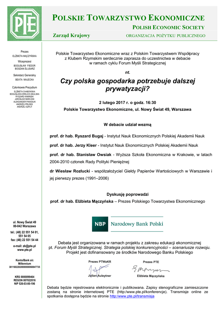 POLSKIE TOWARZYSTWO EKONOMICZNE POLISH ECONOMIC SOCIETY Zarząd Krajowy Prezes ELŻBIETA MĄCZYŃSKA Wiceprezesi BOGUSŁAW FIEDOR BOGDAN ŚLUSARZ ORGANIZACJA POŻYTKU PUBLICZNEGO Polskie Towarzystwo Ekonomiczne wraz z Polskim Towarzystwem Współpracy z Klubem Rzymskim serdecznie zaprasza do uczestnictwa w debacie w ramach cyklu Forum Myśli Strategicznej nt. Sekretarz Generalny BEATA MAJECKA Członkowie Prezydium ELŻBIETA CHABOWSKA BOGUSŁAWA DRELICH-SKULSKA RYSZARD KAMIŃSKI JAROSŁAW MARCZAK ALEKSANDER PANASIUK ANDRZEJ PRUSEK ANDRZEJ SZPLIT Czy polska gospodarka potrzebuje dalszej prywatyzacji? 2 lutego 2017 r. o godz. 16:30 Polskie Towarzystwo Ekonomiczne, ul. Nowy Świat 49, Warszawa W debacie udział wezmą prof. dr hab. Ryszard Bugaj - Instytut Nauk Ekonomicznych Polskiej Akademii Nauk prof. dr hab. Jerzy Kleer - Instytut Nauk Ekonomicznych Polskiej Akademii Nauk prof. dr hab. Stanisław Owsiak - Wyższa Szkoła Ekonomiczna w Krakowie, w latach 2004-2010 członek Rady Polityki Pieniężnej dr Wiesław Rozłucki - współzałożyciel Giełdy Papierów Wartościowych w Warszawie i jej pierwszy prezes (1991–2006) Dyskusję poprowadzi prof. dr hab. Elżbieta Mączyńska – Prezes Polskiego Towarzystwa Ekonomicznego ul. Nowy Świat 49 00-042 Warszawa tel.: (48) 22 551 54 01, 551 54 05 fax: (48) 22 551 54 44 e-mail: [email protected] www.pte.pl Debata jest organizowana w ramach projektu z zakresu edukacji ekonomicznej pt. Forum Myśli Strategicznej. Strategia polskiej konkurencyjności – scenariusze rozwoju. Projekt jest dofinansowany ze środków Narodowego Banku Polskiego Konto/Bank a/c Millennium 38116022020000000060847735 KRS 0000099464 REGON 007022016 NIP 526-03-00-196 Debata będzie rejestrowana elektronicznie i publikowana. Zapisy stenograficzne zamieszczone zostaną na stronie internetowej PTE (http:/www.pte.pl/konferencje). Transmisje online ze spotkania dostępna będzie na stronie http:/www.pte.pl/transmisja
