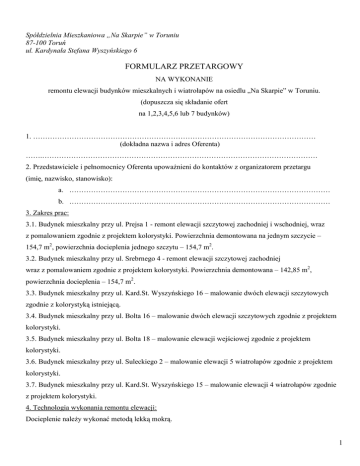 Spółdzielnia Mieszkaniowa „Na Skarpie” w Toruniu 87-100 Toruń ul. Kardynała Stefana Wyszyńskiego 6 FORMULARZ PRZETARGOWY NA WYKONANIE remontu elewacji budynków mieszkalnych i wiatrołapów na osiedlu „Na Skarpie” w Toruniu. (dopuszcza się składanie ofert na 1,2,3,4,5,6 lub 7 budynków) 1. ……………………………………………………………………………………………………… (dokładna nazwa i adres Oferenta) …….…………………………………………………………………………………………………… 2. Przedstawiciele i pełnomocnicy Oferenta upoważnieni do kontaktów z organizatorem przetargu (imię, nazwisko, stanowisko): a. ……………………………………………………………………………………………… b. ……………………………………………………………………………………………… 3. Zakres prac: 3.1. Budynek mieszkalny przy ul. Prejsa 1 - remont elewacji szczytowej zachodniej i wschodniej, wraz z pomalowaniem zgodnie z projektem kolorystyki. Powierzchnia demontowana na jednym szczycie – 154,7 m2, powierzchnia docieplenia jednego szczytu – 154,7 m2. 3.2. Budynek mieszkalny przy ul. Srebrnego 4 - remont elewacji szczytowej zachodniej wraz z pomalowaniem zgodnie z projektem kolorystyki. Powierzchnia demontowana – 142,85 m2, powierzchnia docieplenia – 154,7 m2. 3.3. Budynek mieszkalny przy ul. Kard.St. Wyszyńskiego 16 – malowanie dwóch elewacji szczytowych zgodnie z kolorystyką istniejącą. 3.4. Budynek mieszkalny przy ul. Bolta 16 – malowanie dwóch elewacji szczytowych zgodnie z projektem kolorystyki. 3.5. Budynek mieszkalny przy ul. Bolta 18 – malowanie elewacji wejściowej zgodnie z projektem kolorystyki. 3.6. Budynek mieszkalny przy ul. Suleckiego 2 – malowanie elewacji 5 wiatrołapów zgodnie z projektem kolorystyki. 3.7. Budynek mieszkalny przy ul. Kard.St. Wyszyńskiego 15 – malowanie elewacji 4 wiatrołapów zgodnie z projektem kolorystyki. 4. Technologia wykonania remontu elewacji: Docieplenie należy wykonać metodą lekką mokrą. 1 5. System wykonania remontu eleweacji: System w technologii lekkiej mokrej posiadający aktualną Aprobatę Techniczną oraz w ramach systemu farba elewacyjna mikrosylikonowa, samoczyszcząca, odporna na zabrudzenia i zagrzybienie. 6. Warunki wykonania robót: 6.1. Prejsa 1 (szczyt wschodni i zachodni): 1. Zdemontowanie docieplenia wykonanego w systemie SIDING do powierzchni warstwy fakturowej elementu prefabrykowanego szczytów budynku, wraz z wywiezieniem elementów zdemontowanego docieplenia na wysypisko. 2. Wykonanie nowej warstwy docieplenia z dostosowaniem się dolną warstwą do wykonanego docieplenia ścian podłużnych pasmowych. 3. Grubość warstwy izolacyjnej 12 cm, styropian EPS 70-040 FASADA. 4. Należy zastosować tynk mineralny o uziarnieniu 2 mm. 5. Prace wykonać wraz z wszelkimi obróbkami blacharskimi i pracami przynależnymi. 6. Naprawa cokołu pod szczytami, ułożenie tynku mineralnego o uziarnieniu 2 mm wraz z pomalowaniem farbą mikrosylikonową w kolorze istniejącego cokołu. 6.2. Srebrnego 4 (szczyt zachodni): 1. Zdemontowanie docieplenia wykonanego w systemie THERMO-BRICK do powierzchni warstwy fakturowej elementu prefabrykowanego szczytów budynku, wraz z wywiezieniem elementów zdemontowanego docieplenia na wysypisko. 2. Wykonanie nowej warstwy docieplenia z dostosowaniem się dolną warstwą do wykonanego docieplenia ścian podłużnych pasmowych. 3. Grubość warstwy izolacyjnej 12 cm, styropian EPS 70-040 FASADA. 4. Należy zastosować tynk mineralny o uziarnieniu 2 mm. 5. Prace wykonać wraz z wszelkimi obróbkami blacharskimi i pracami przynależnymi. 6. Naprawa cokołu pod szczytem, ułożenie tynku mineralnego o uziarnieniu 2-3 mm wraz z pomalowaniem farbą mikrosylikonową w kolorze istniejącego cokołu. 6.3. Kard.St. Wyszyńskiego 16: 1. Zmycie ścian szczytowych wodą pod ciśnieniem. 2. Wykonanie drobnych napraw tynku mineralnego. 3. Dwukrotne malowanie ścian szczytowych zgodnie z projektem kolorystyki. 4. Wykonanie napisów adresowych budynku. 5. Naprawa cokołu pod szczytami, ułożenie tynku drobnoziarnistego o granulacji 2-3mm oraz pomalowanie farbą mikrosylikonową w kolorze istniejącego cokołu. 2 6.4. Bolta 16: 1. Zmycie wodą pod ciśnieniem ścian szczytowych i cokołu obłożonego Gemalitem. 2. Usunięcie z elewacji i cokołu mikroorganizmów środkiem do zwalczania alg. pleśni i grzybów. 3. Wykonanie drobnych napraw i uzupełnień tynku na elewacji. 4. Dwukrotne malowanie ścian szczytowych oraz cokołów pod ścianami zgodnie z projektem kolorystyki. 5. Malowanie części spodniej stropów balkonów, części bocznych, czołowych oraz słupów balkonów. 6. Oczyszczenie wszystkich balustrad stalowych balkonów. 7. Malowanie dwukrotne balustrad stalowych farbami do metalu zgodnie z projektem kolorystyki. Przed rozpoczęciem robót wykonać wszelkie zabezpieczenia na elewacji w celu uniknięcia ewentualnych szkód na niekorzyść mieszkańców budynku. Zabezpieczyć podłoże gruntowe oraz podesty wejść przed penetracją brudu i glonów ze zmywanej elewacji. 6.5. Bolta 18: 1. Zmycie wodą pod ciśnieniem elewacji i cokołu obłożonego Gemalitem. 2. Usunięcie z elewacji i cokołu mikroorganizmów środkiem do zwalczania alg. pleśni i grzybów. 3. Wykonanie drobnych napraw i uzupełnień tynku na elewacji. 4. Dwukrotne malowanie elewacji oraz cokołu budynku zgodnie z projektem kolorystyki. 5. Wymiana rur spustowych na rury z blachy powlekanej w kolorze białym. 6. Oczyszczenie zadaszenia wejścia do budynku wykonanego z poliwęglanu oraz części metalowych zadaszenia. 7. Malowanie dwukrotne elementów metalowych zadaszeń farbami do metalu zgodnie z projektem kolorystyki. Przed rozpoczęciem robót wykonać wszelkie zabezpieczenia na elewacji w celu uniknięcia ewentualnych szkód na niekorzyść mieszkańców budynku. Zabezpiec