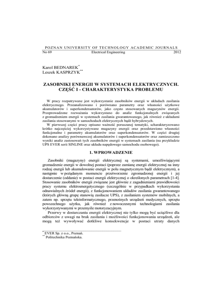 P O Z N A N UN I VE RS I T Y O F T E C HN O L O G Y ACA D E MI C J O URN A L S No 69 Electrical Engineering 2012 Karol BEDNAREK* Leszek KASPRZYK** ZASOBNIKI ENERGII W SYSTEMACH ELEKTRYCZNYCH. CZĘŚĆ I - CHARAKTERYSTYKA PROBLEMU W pracy rozpatrywane jest wykorzystanie zasobników energii w układach zasilania elektrycznego. Przeanalizowano i porównano parametry oraz własności użytkowe akumulatorów i superkondensatorów, jako często stosowanych magazynów energii. Przeprowadzone rozważania wykorzystano do analiz funkcjonalnych związanych z gromadzeniem energii w systemach zasilania gwarantowanego, jak również z układami zasilania stosowanymi w samochodach elektrycznych bądź hybrydowych. W pierwszej części pracy opisano ważność poruszanej tematyki, scharakteryzowano krótko najczęściej wykorzystywane magazyny energii oraz przedstawiono własności funkcjonalne i parametry akumulatorów oraz superkondensatorów. W części drugiej dokonano analizy porównawczej akumulatorów i superkondensatorów oraz zamieszczono wyniki analiz zastosowań tych zasobników energii w systemach zasilania (na przykładzie UPS EVER serii SINLINE oraz układu napędowego samochodu osobowego). 1. WPROWADZENIE Zasobniki (magazyny) energii elektrycznej są systemami, umożliwiającymi gromadzenie energii w dowolnej postaci (poprzez zamianę energii elektrycznej na inny rodzaj energii lub akumulowanie energii w polu magnetycznym bądź elektrycznym), a następnie w pożądanym momencie przetworzenie zgromadzonej energii i jej dostarczenie (oddanie) w postaci energii elektrycznej o określonych parametrach [1-4]. Stosowanie zasobników energii związane jest głównie z zagadnieniami prawidłowości pracy systemu elektroenergetycznego (szczególnie w przypadkach wykorzystania odnawialnych źródeł energii), z funkcjonowaniem układów zasilania gwarantowanego (których główną grupę stanowią zasilacze UPS), z zasilaniem systemów mobilnych, a zatem np. sprzętu teleinformatycznego, przenośnych urządzeń medycznych, sprzętu powszechnego użytku, jak również z nowoczesnymi technologiami zasilania wykorzystywanymi w przemyśle motoryzacyjnym. Przerwy w dostarczaniu energii elektrycznej nie tylko mogą być uciążliwe dla odbiorców z uwagi na brak zasilania i możliwości funkcjonowania urządzeń, ale mogą też wywoływać dotkliwe konsekwencje w postaci utraty danych __________________________________________ * EVER Sp. z o.o., Poznań. ** Politechnika Poznańska. 200 Karol Bednarek, Leszek Kasprzyk w systemach informatycznych, uszkodzeń osprzętu elektrycznego, jak również być przyczyną dyskomfortu związanego z brakiem możliwości zapewnienia właściwego ogrzewania pomieszczeń użytkowych (głównie w warunkach zimowych). Trafnym rozwiązaniem tego typu problemów jest zastosowanie systemów zasilania gwarantowanego, jakimi są zasilacze awaryjne UPS. W trybie pracy rezerwowej (załączanym w przypadku braku zasilania sieciowego lub nieprawidłowych parametrów napięcia zasilającego) wykorzystuje się w nich zgromadzoną w zasobnikach energię elektryczną w celu zasilania zabezpieczanych odbiorników (najczęściej o znaczeniu krytycznym). Od własności funkcjonalnych zastosowanych magazynów energii zależą jakość i efekty pracy systemów zasilania gwarantowanego, a w konsekwencji bezpieczeństwo i warunki funkcjonowania odbiorników. Koszty strat energii w światowej gospodarce, wynikające z nieefektywnego zarządzania energią oraz niewłaściwej jakości energii elektrycznej, liczone są w setkach miliardów dolarów rocznie [1, 4]. Znaczną eliminację tych strat uzyskuje się przez wprowadzenie racjonalnego gospodarowania energią, wykorzystanie źródeł ekologicznych czy stosowanie rozproszonych systemów zasilania, co dodatkowo często ma korzystny wpływ na środowisko naturalne. Stosowanie magazynów energii w energetyce umożliwia gromadzenie energii w okresach, gdy występuje jej nadmiar w systemie wytwórczo-dystrybucyjnym, a następnie jej efektywne użytkowanie w okresach niedoborów energii bądź występujących przeciążeń odbiorczych, jak również wykorzystanie ich jako źródeł interwencyjnych podczas awarii albo chwilowych intensywnych wahań poboru mocy. Stosuje się je również do współpracy z ekologicznymi źródłami (fotowoltaicznymi, wiatrowymi itp.) jako bufory energii w stochastycznych warunkach pracy i obciążeń tych źródeł. Wynika stąd, że zasobniki energii pełnią w energetyce rolę stabilizatorów systemu zasilania. Z magazynowaniem energii związane są także układy zasilania stosowane w pojazdach elektrycznych bądź hybrydowych. W rozważaniach dotyczących tych systemów należy uwzględnić jednoczesne potrzeby zapewnienia przez zastosowane w nich zasobniki energii dużych gęstości mocy (czyli dużej dynamiki przyjmowania i oddawania ładunku elektrycznego), jak również dużych gęstości energii (a zatem wysokiej wydajności lub inaczej zasobności źródła). W pracy rozpatrywano możliwości magazynowania energii, przy czym szczególną uwagę skupiono na własnościach użytkowych i porównaniu dwóch zasobników energii, jakimi są akumulatory i superkondensatory. Analizy prowadzono pod kątem wykorzystania tych urządzeń w systemach zasilania gwarantowanego (UPS) oraz w przemyśle motoryzacyjnym. Jako przykłady fizyczne rozpatrywano własności funkcjonalne UPS EVER serii SINLINE w wersjach: z modułem akumulatorowym i Evolution (z superkondensatorami) oraz systemu napędowego samochodu elektrycznego. Zasobniki energii w systemach elektrycznych – Część 1 … 201 2. UKŁADY ZASOBNIKÓW ENERGII Gromadzenie energii powiązane jest z wykorzystaniem zjawisk fizycznych i chemicznych. W zasobnikach energii następuje: zamiana energii elektrycznej na energię chemiczną lub mechaniczną i odwrotnie albo też gromadzenie energii elektrycznej w polu magnetycznym bądź elektrycznym. Jako zasobniki energii 
