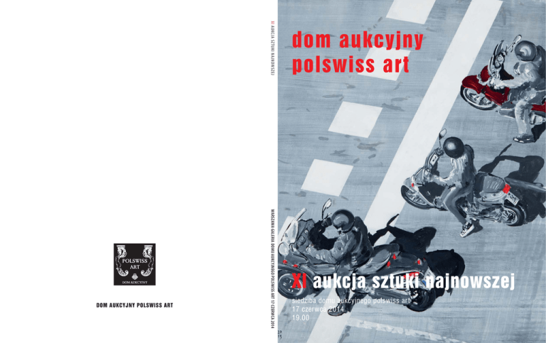 XI AUKC JA SZTUKI NA JNOWSZE J WARSZAWA GALERIA DOMU AUKCYJNEGO POLSWISS ART 17 CZERWCA 2014 DOM AUKCYJNY POLSWISS ART dom aukcyjny polswiss art XI aukcja sztuki najnowszej siedziba domu aukcyjnego polswiss ar t 17 czerwca 2014 19.00 XI aukcja sztuki najnowszej siedziba domu aukcyjnego polswiss art 17 czerwca 2014 19.00 wystawa pr zedaukcyjna 11.06 – 16.06 w godz. 11.00 – 19.00 galeria polswiss ar t, warszawa ul. wiejska 20 oraz w dniu aukcji w godz. 11.00 – 18.00 w siedzibie domu aukcyjnego polswiss ar t Cena wywoławcza każdej pracy 1000 zł partner: dom aukcyjny polswiss ar t, ul. wiejska 20, 00-490 warszawa 22 628 13 67, 22 629 46 87, www. polswissar t. pl, galeria@polswissar t. pl 1 BARTEK JARMOLIŃSKI 2 ur. 1975 FRAGILE, 2014 akryl, płótno, 80x80 cm sygn. p.d.: B.JARMOLIŃSKI, opisany na odwrocie: B.JARMOLIŃSKI 2014 Bartek Jarmoliński (ur. 1975 r.) dyplom zrealizował w 2001 r. w pracownia intermediów prof. W. Karolaka oraz pracowni rysunku i malarstwa prof. R. Hałat na ASP im. Wł. Strzemińskiego w Łodzi. Laureat 5 nagrody na I Piotrkowskim Biennale Sztuki, Oda Art (2011); nominacji do nagrody na Triennale Młodego Malarstwa im. M. Michalika, Miejska Galeria Sztuki, Częstochowa (2010); wyróżnienie EXITu na 39. Bielskiej Jesieni, Bielsko-Biała (2009); 2 nagrody konkursu Artysta i jego dzieło kwartalnika Malarstwo Polskie, Łódź (2007). Autor wystaw indywidualnych: Saint M, Galeria Zero, Berlin (z Iwona Demko) (2011); COOLTOWI, Otwarta Pracownia, Kraków (2011); Saint M, Galeria Od Nova, Toruń (z Iwoną Demko) (2011); Santo Subito, Labolatorium, Centrum Sztuki Galeria El, Elbląg (2011); Konflikt jako źródło wartości, Rynek Sztuki, Łódź (2011); Cooltowi, Galeria Studio, Warszawa (2010); MAN-RW, CK Ryba, Łódź (2010); MAN-RW, Galeria Wozownia, Toruń (2010); Santo Subito, Sztukpol, Stróżówka, Łódź (2010); Dobre wszystko co dobre, Galeria przy automacie, Warszawa (2010); mOsobowość złożona, Domoteka, Warszawa (2009); POProgram, Galeria Stara, Łódź (2009); Dobre wszystko co dobre, Akademicki Ośrodek Inicjatyw Artystycznych, Łódź (2009); POProgram, Galeria Ateneum Młodych, Warszawa (2009); POProgram, Galeria Szewska 36, Wrocław (2009); Osobowość złożona, Rynek Sztuki, Łódź (2009); Relacje 2, Galeria Ateneum Młodych, Warszawa (2008); POProgram, Galeria Zero, Berlin, Germany (2008); Relacje, Galeria Raz dwa trzy Festiwalu Dialogu Czterech Kultur, Łódź (2007); Zatrzymane w czasie, Muzeum Regionalne, Brzeziny (2005); W lustrze, Galeria Stara, ŁDK, Łódź (2005); Młodzieniec w czerwonej czapce, Galeria J, Łódź (2005); Dedykacja, Galeria Dolorystów, Józefów (2004); Obrazy i rysunki, Galeria Bałucka, Łódź (2004); Rysunek, Galeria Aula, Łódź (2003); Chwile i miejsca, Galeria Aula, Łódź (2002); La sensabilita, Studio Działań Twórczych, Muzeum Sztuki, Łódź (2001); Noclegownia, Poleski Ośrodek Sztuki, Łódź (2001); Niebezpieczne związki, Muzeum Regionalne, Brzeziny (1997). Jego prace znajdują się m.in. w zbiorach: Regionalnej Zachęty Śląska, Katowice; BWA Galerii Bielskiej, Bielsko-Biała; Centralnego Muzeum Włókiennictwa, Łódź; Fundacji Ateneum, Warszawa. 3 2 ILONA HERC ur. 1973 W WIELKIM MIEŚCIE, 2014 olej, płótno; 50x100 cm sygn. p.d. monogramem; opisana na odwrocie: ILONA HERC “W WIELKIM MIEŚCIE” KRAKÓW 2014 Ilona Herc (ur. 1972 r.) w latach 1993-1998 studiowała w Instytucie Sztuki Uniwersytetu Śląskiego w Katowicach, filia w Cieszynie. W 1998 r. zrealizowała dyplom z malarstwa w pracowni prof. Z. Lisa. Od 2000 r. członek Stowarzyszenia Pastelistów Polskich. Finalistka konkursu „Obraz Roku” w 2003 i 2004 r. Autorka kilkunastu wystaw indywidualnych. Brała udział w ważnych przeglądach zbiorowych: III Ogólnopolskie Biennale Pasteli, Nowy Sącz (2000); Allergy to Grey, The Bloxham Gallery, London, Wielka Brytania (2002); I Międzynarodowe Biennale Pasteli, BWA, Nowy Sącz (2002); II Międzynarodowe Biennale Pasteli, BWA, Nowy Sącz (2004); III Międzynarodowe Biennale Pasteli, BWA, Nowy Sącz (2006); Triennale z Martwą Naturą, BWA, Sieradz (2006). 4 3 KATARZYNA ZAWIERUCHA ur. 1970 TATTOO, 2013 olej, płótno, 100x90 cm sygn. p.d.: monogramem, opisany na odwrocie: Katarzyna Zawierucha “Tattoo” 2013 /100/90 olej na płótnie Katarzyna Zawierucha (ur. 1970 r.) jest absolwentką Wydziału Malarstwa ASP w Krakowie. Dyplom zrealizowała w pracowni prof. L. Misiaka w 2006 r. Autorka wystaw indywidualnych: Gdzie ja jestem, kiedy śpię?, CSW Solvay, Kraków (2007); Migrena z aurą, Alchemia, Kraków (2008); Źródło, Galeria Autorska B. Chromego, Kraków (2009). Uczestniczka kilkudziesięciu zbiorowych m.in: Festiwalu Polskiego Malarstwa Współczesnego, Zamek Książąt Pomorskich, Szczecin; Międzynarodowego Jesiennego Salonu Sztuki, BWA, Ostrowiec Świętokrzyski; Salonu 100-lecia ZPAP, Bunkier Sztuki, Kraków. 5 4 VIOLA TYCZ ur. 1973 MGI, 2014 akryl, płyta HDF, 150x56,5 cm na odwrocie autorski certyfikat autentyczności Viola Tycz (ur. 1973 r.) jest absolwentką Wydziału Grafiki ASP we Wrocławiu. Stypendystka Pilar Juncosa&Joan Miro Foundation. Stypendystka m.in. MKiDN programu Młoda Polska. Artysta Roku 2006 w plebiscycie magazynu ARTEON. Autorka licznych wystaw indywidualnych. Uczestniczyła w prestiżowych ekspozycjach zbiorowych grafiki. Prace w kolekcjach m.in. Muzeum Narodowego w Warszawie, Muzeum Narodowego w Krakowie, Dolnośląskim Towarzystwie Zachęty Sztuk Pięknych, Ministerstwie Spraw Zagranicznych, Kolekcji Międzynarodowego Triennale Grafiki w Krakowie i innych. 5 TADEUSZ ŚWINIARSKI ur. 1961 BEZ TYTUŁU, 2009 olej, płótno, 155x130 cm sygn. p.d.: T. Świniarski 2009, opisany na odwrocie: TADEUSZ ŚWINIARSKI 2009 6 Tadeusz Świniarski (ur. 1961 r.) w latach 1983-89 studiował malarstwo w ASP we Wrocławiu. W 1989 r. uzyskał dyplom w pracownia malarstwa prof. K. Jarodzkiego. W latach 1989-95 studia malarstwa na w Monachium, gdzie uzyskał dyplom w pra