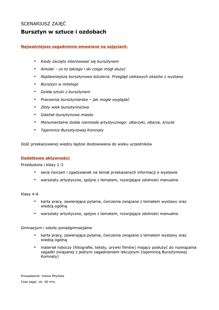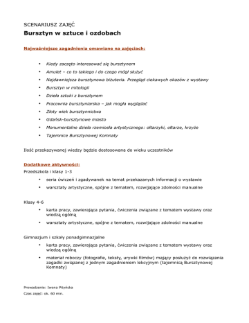 SCENARIUSZ ZAJĘĆ Bursztyn w sztuce i ozdobach Najważniejsze zagadnienia omawiane na zajęciach: • Kiedy zaczęto interesować się bursztynem • Amulet – co to takiego i do czego mógł służyć • Najdawniejsza bursztynowa biżuteria. Przegląd ciekawych okazów z wystawy • Bursztyn w mitologii • Dzieła sztuki z bursztynem • Pracownia bursztyniarska – jak mogła wyglądać • Złoty wiek bursztynnictwa • Gdańsk-bursztynowe miasto • Monumentalne dzieła rzemiosła artystycznego: ołtarzyki, ołtarze, krzyże • Tajemnice Bursztynowej Komnaty Ilość przekazywanej wiedzy będzie dostosowana do wieku uczestników Dodatkowe aktywności: Przedszkola i klasy 1-3 • seria ćwiczeń i zgadywanek na temat przekazanych informacji o wystawie • warsztaty artystyczne, spójne z tematem, rozwijające zdolności manualne Klasy 4-6 • karta pracy, zawierająca pytania, ćwiczenia związane z tematem wystawy oraz wiedzą ogólną • warsztaty artystyczne, spójne z tematem, rozwijające zdolności manualne Gimnazjum i szkoły ponadgimnazjalne • karta pracy, zawierająca pytania, ćwiczenia związane z tematem wystawy oraz wiedzą ogólną • materiał roboczy (fotografie, teksty, urywki filmów) mający posłużyć do rozwiązania zagadki związanej z jednym zagadnieniem lekcyjnym (tajemnicą Bursztynowej Komnaty) Prowadzenie: Iwona Pityńska Czas zajęć: ok. 60 min.