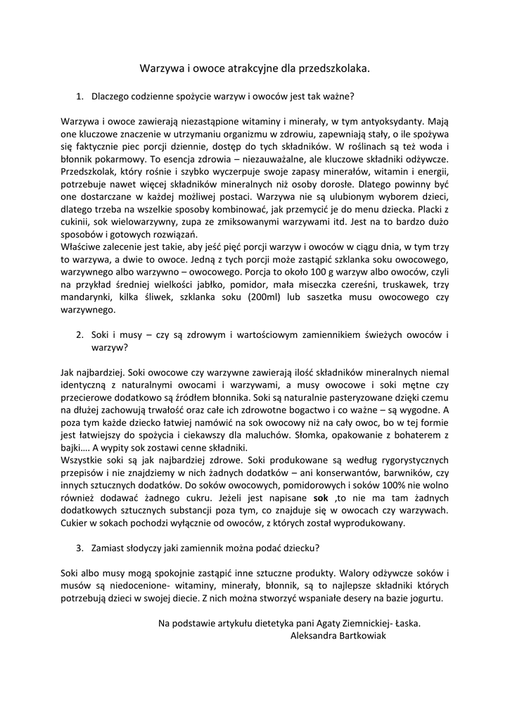 Warzywa i owoce atrakcyjne dla przedszkolaka. 1. Dlaczego codzienne spożycie warzyw i owoców jest tak ważne? Warzywa i owoce zawierają niezastąpione witaminy i minerały, w tym antyoksydanty. Mają one kluczowe znaczenie w utrzymaniu organizmu w zdrowiu, zapewniają stały, o ile spożywa się faktycznie piec porcji dziennie, dostęp do tych składników. W roślinach są też woda i błonnik pokarmowy. To esencja zdrowia – niezauważalne, ale kluczowe składniki odżywcze. Przedszkolak, który rośnie i szybko wyczerpuje swoje zapasy minerałów, witamin i energii, potrzebuje nawet więcej składników mineralnych niż osoby dorosłe. Dlatego powinny byd one dostarczane w każdej możliwej postaci. Warzywa nie są ulubionym wyborem dzieci, dlatego trzeba na wszelkie sposoby kombinowad, jak przemycid je do menu dziecka. Placki z cukinii, sok wielowarzywny, zupa ze zmiksowanymi warzywami itd. Jest na to bardzo dużo sposobów i gotowych rozwiązao. Właściwe zalecenie jest takie, aby jeśd pięd porcji warzyw i owoców w ciągu dnia, w tym trzy to warzywa, a dwie to owoce. Jedną z tych porcji może zastąpid szklanka soku owocowego, warzywnego albo warzywno – owocowego. Porcja to około 100 g warzyw albo owoców, czyli na przykład średniej wielkości jabłko, pomidor, mała miseczka czereśni, truskawek, trzy mandarynki, kilka śliwek, szklanka soku (200ml) lub saszetka musu owocowego czy warzywnego. 2. Soki i musy – czy są zdrowym i wartościowym zamiennikiem świeżych owoców i warzyw? Jak najbardziej. Soki owocowe czy warzywne zawierają ilośd składników mineralnych niemal identyczną z naturalnymi owocami i warzywami, a musy owocowe i soki mętne czy przecierowe dodatkowo są źródłem błonnika. Soki są naturalnie pasteryzowane dzięki czemu na dłużej zachowują trwałośd oraz całe ich zdrowotne bogactwo i co ważne – są wygodne. A poza tym każde dziecko łatwiej namówid na sok owocowy niż na cały owoc, bo w tej formie jest łatwiejszy do spożycia i ciekawszy dla maluchów. Słomka, opakowanie z bohaterem z bajki…. A wypity sok zostawi cenne składniki. Wszystkie soki są jak najbardziej zdrowe. Soki produkowane są według rygorystycznych przepisów i nie znajdziemy w nich żadnych dodatków – ani konserwantów, barwników, czy innych sztucznych dodatków. Do soków owocowych, pomidorowych i soków 100% nie wolno również dodawad żadnego cukru. Jeżeli jest napisane sok ,to nie ma tam żadnych dodatkowych sztucznych substancji poza tym, co znajduje się w owocach czy warzywach. Cukier w sokach pochodzi wyłącznie od owoców, z których został wyprodukowany. 3. Zamiast słodyczy jaki zamiennik można podad dziecku? Soki albo musy mogą spokojnie zastąpid inne sztuczne produkty. Walory odżywcze soków i musów są niedocenione- witaminy, minerały, błonnik, są to najlepsze składniki których potrzebują dzieci w swojej diecie. Z nich można stworzyd wspaniałe desery na bazie jogurtu. Na podstawie artykułu dietetyka pani Agaty Ziemnickiej- Łaska. Aleksandra Bartkowiak