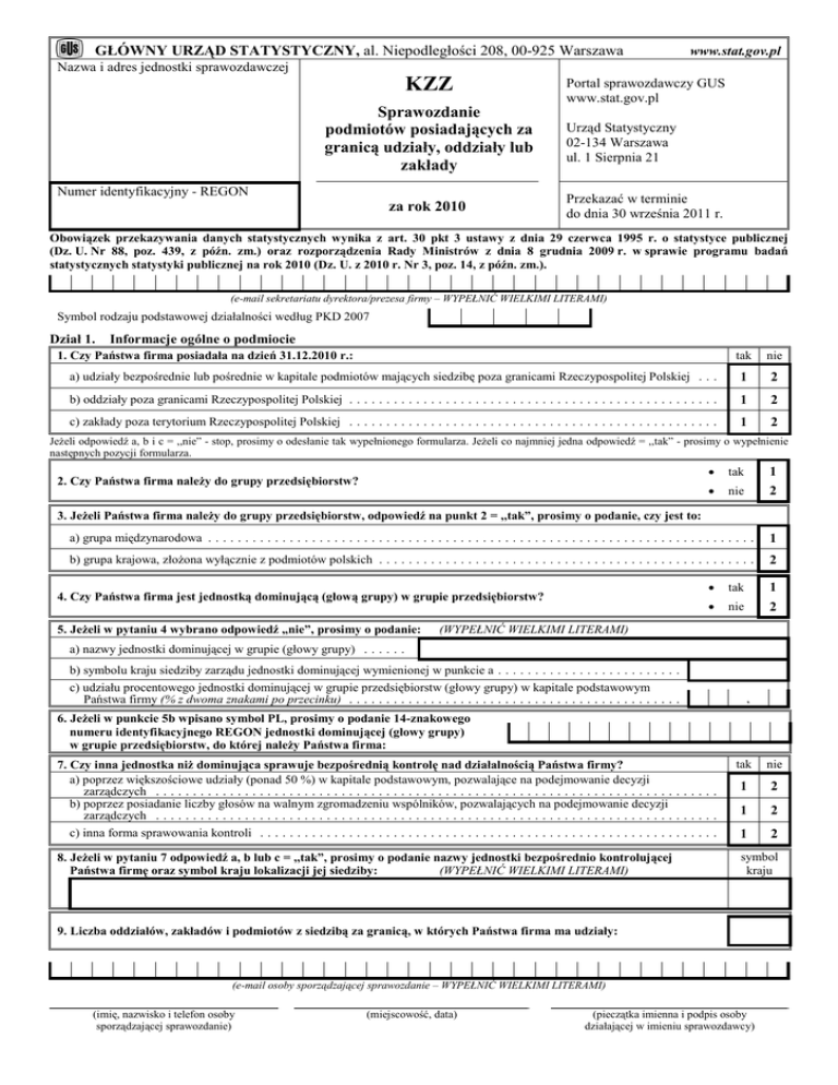 GŁÓWNY URZĄD STATYSTYCZNY, al. Niepodległości 208, 00-925 Warszawa www.stat.gov.pl Nazwa i adres jednostki sprawozdawczej KZZ Sprawozdanie podmiotów posiadających za granicą udziały, oddziały lub zakłady Numer identyfikacyjny - REGON za rok 2010 Portal sprawozdawczy GUS www.stat.gov.pl Urząd Statystyczny 02-134 Warszawa ul. 1 Sierpnia 21 Przekazać w terminie do dnia 30 września 2011 r. Obowiązek przekazywania danych statystycznych wynika z art. 30 pkt 3 ustawy z dnia 29 czerwca 1995 r. o statystyce publicznej (Dz. U. Nr 88, poz. 439, z późn. zm.) oraz rozporządzenia Rady Ministrów z dnia 8 grudnia 2009 r. w sprawie programu badań statystycznych statystyki publicznej na rok 2010 (Dz. U. z 2010 r. Nr 3, poz. 14, z późn. zm.). (e-mail sekretariatu dyrektora/prezesa firmy – WYPEŁNIĆ WIELKIMI LITERAMI) Symbol rodzaju podstawowej działalności według PKD 2007 Dział 1. Informacje ogólne o podmiocie tak nie a) udziały bezpośrednie lub pośrednie w kapitale podmiotów mających siedzibę poza granicami Rzeczypospolitej Polskiej . . . 1 2 b) oddziały poza granicami Rzeczypospolitej Polskiej . . . . . . . . . . . . . . . . . . . . . . . . . . . . . . . . . . . . . . . . . . . . . . . . . . 1 2 c) zakłady poza terytorium Rzeczypospolitej Polskiej . . . . . . . . . . . . . . . . . . . . . . . . . . . . . . . . . . . . . . . . . . . . . . . . . . 1 2 1. Czy Państwa firma posiadała na dzień 31.12.2010 r.: JeŜeli odpowiedź a, b i c = ,,nie” - stop, prosimy o odesłanie tak wypełnionego formularza. JeŜeli co najmniej jedna odpowiedź = ,,tak” - prosimy o wypełnienie następnych pozycji formularza. 2. Czy Państwa firma naleŜy do grupy przedsiębiorstw? • tak 1 • nie 2 3. JeŜeli Państwa firma naleŜy do grupy przedsiębiorstw, odpowiedź na punkt 2 = ,,tak”, prosimy o podanie, czy jest to: a) grupa międzynarodowa . . . . . . . . . . . . . . . . . . . . . . . . . . . . . . . . . . . . . . . . . . . . . . . . . . . . . . . . . . . . . . . . . . . . . . . . . . 1 b) grupa krajowa, złoŜona wyłącznie z podmiotów polskich . . . . . . . . . . . . . . . . . . . . . . . . . . . . . . . . . . . . . . . . . . . . . . . . . . . 2 4. Czy Państwa firma jest jednostką dominującą (głową grupy) w grupie przedsiębiorstw? 5. JeŜeli w pytaniu 4 wybrano odpowiedź „nie”, prosimy o podanie: • tak 1 • nie 2 (WYPEŁNIĆ WIELKIMI LITERAMI) a) nazwy jednostki dominującej w grupie (głowy grupy) . . . . . . b) symbolu kraju siedziby zarządu jednostki dominującej wymienionej w punkcie a . . . . . . . . . . . . . . . . . . . . . . . . . c) udziału procentowego jednostki dominującej w grupie przedsiębiorstw (głowy grupy) w kapitale podstawowym Państwa firmy (% z dwoma znakami po przecinku) . . . . . . . . . . . . . . . . . . . . . . . . . . . . . . . . . . . . . . . . . . . . . , 6. JeŜeli w punkcie 5b wpisano symbol PL, prosimy o podanie 14-znakowego numeru identyfikacyjnego REGON jednostki dominującej (głowy grupy) w grupie przedsiębiorstw, do której naleŜy Państwa firma: 7. Czy inna jednostka niŜ dominująca sprawuje bezpośrednią kontrolę nad działalnością Państwa firmy? a) poprzez większościowe udziały (ponad 50 %) w kapitale podstawowym, pozwalające na podejmowanie decyzji zarządczych . . . . . . . . . . . . . . . . . . . . . . . . . . . . . . . . . . . . . . . . . . . . . . . . . . . . . . . . . . . . . . . . . . . . . . . . . . . . b) poprzez posiadanie liczby głosów na walnym zgromadzeniu wspólników, pozwalających na podejmowanie decyzji zarządczych . . . . . . . . . . . . . . . . . . . . . . . . . . . . . . . . . . . . . . . . . . . . . . . . . . . . . . . . . . . . . . . . . . . . . . . . . . . . c) inna forma sprawowania kontroli . . . . . . . . . . . . . . . . . . . . . . . . . . . . . . . . . . . . . . . . . . . . . . . . . . . . . . . . . . . . . . 8. JeŜeli w pytaniu 7 odpowiedź a, b lub c = ,,tak”, prosimy o podanie nazwy jednostki bezpośrednio kontrolującej Państwa firmę oraz symbol kraju lokalizacji jej siedziby: (WYPEŁNIĆ WIELKIMI LITERAMI) tak nie 1 2 1 2 1 2 symbol kraju 9. Liczba oddziałów, zakładów i podmiotów z siedzibą za granicą, w których Państwa firma ma udziały: (e-mail osoby sporządzającej sprawozdanie – WYPEŁNIĆ WIELKIMI LITERAMI) (imię, nazwisko i telefon osoby sporządzającej sprawozdanie) (miejscowość, data) (pieczątka imienna i podpis osoby działającej w imieniu sprawozdawcy) Numer identyfikacyjny - REGON Dział 2. Informacje o jednostce zagranicznej - oddziale, zakładzie lub podmiocie mającym siedzibę za granicą, w którym Państwa firma ma udziały Arkusz numer Dla kaŜdego podmiotu z siedzibą poza granicami Rzeczypospolitej Polskiej naleŜy wypełnić oddzielny arkusz działu 2. Liczba arkuszy powinna być zgodna z liczbą wpisaną w dziale 1 punkt 9. 1. Nazwa jednostki zagranicznej (WYPEŁNIĆ WIELKIMI LITERAMI) 2. Kraj siedziby jednostki zagranicznej wymienionej w punkcie 1: symbol kraju (WYPEŁNIĆ WIELKIMI LITERAMI) 3. Rodzaj jednostki zagranicznej (naleŜy zakreślić tylko jedną odpowiedź) a) spółka . . . . . . . . . . . . . . . . . . . . . . . . . . . . . . . . . . . . . . . . . . . . . . . . . . . . . . . . . . . . . . . . . . . . . . . . . . . . . . . . . . . . . 1 b) oddział . . . . . . . . . . . . . . . . . . . . . . . . . . . . . . . . . . . . . . . . . . . . . . . . . . . . . . . . . . . . . . . . . . . . . . . . . . . . . . . . . . . . . 2 c) zakład . . . . . . . . . . . . . . . . . . . . . . . . . . . . . . . . . . . . . . . . . . . . . . . . . . . . . . . . . . . . . . . . . . . . . . . . . . . . . . . . . . . . . . 3 d) inna forma . . . . . . . . . . . . . . . . . . . . . . . . . . . . . . . . . . . . . . . . . . . . . . . . . . . . . . . . . . . . . . . . . . . . . . . . . . . . . . . . . . 4 4. Rok utworzenia oddziału, zakładu lub nabycia udziałów: 5. Czy wskazany w punkcie 1 podmiot naleŜy do grupy przedsiębiorstw? • 
