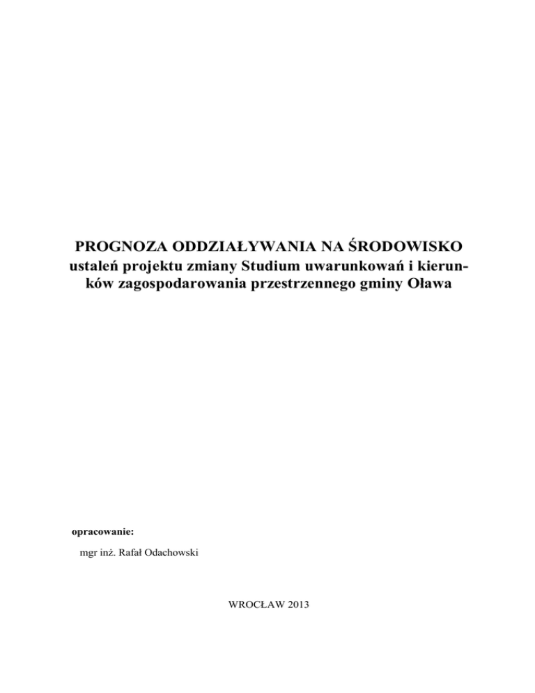 PROGNOZA ODDZIAŁYWANIA NA ŚRODOWISKO ustaleń projektu zmiany Studium uwarunkowań i kierunków zagospodarowania przestrzennego gminy Oława opracowanie: mgr inż. Rafał Odachowski WROCŁAW 2013 Spis treści 1. Podstawa prawna, cel, zakres i metoda opracowania.......................................................... 3 2. Ocena stanu i funkcjonowania środowiska oraz tendencje zmian przy braku realizacji zmiany Studium ......................................................................................................... 4 2.2. Stan środowiska i występujące zagrożenia ................................................................... 7 2.3. Tendencje przeobrażeń przy braku realizacji zmiany „Studium uwarunkowań i kierunków zagospodarowania przestrzennego gminy Oława” ................................... 11 3. Analiza ustaleń projektu zmiany „Studium uwarunkowań i kierunków zagospodarowania przestrzennego gminy Oława” ................................................................. 11 3.1. Ustalenia projektu zmiany „Studium uwarunkowań i kierunków zagospodarowania przestrzennego gminy Oława” .................................................................................... 11 3.2. Analiza rozwiązań funkcjonalno-przestrzennych ....................................................... 13 4. Przewidywany wpływ realizacji ustaleń projektu zmiany Studium na środowisko ......... 15 4.1. Przyjęte założenia ........................................................................................................ 15 4.2. Analiza wpływu ustaleń zmiany studium na środowisko ........................................... 16 4.3. Oddziaływanie Studium poza obszarem opracowania ................................................ 18 4.4. Informacje o możliwym transgranicznym oddziaływaniu na środowisko .................. 18 5. Oddziaływanie na formy ochrony przyrody...................................................................... 19 5.1. Wyniki oceny ornitologicznej i chiropterologicznej na potrzeby weryfikacji możliwości lokalizacji turbin wiatrowych .................................................................. 19 5.2 Oddziaływanie na obszary Natura 2000...................................................................... 25 5.3. Ocena oddziaływania skumulowanego ......................................................................... 31 5.4. Oddziaływanie na pozostałe formy ochrony przyrody ............................................... 32 6. Kompleksowa ocena skutków wpływu ustaleń zmiany Studium na środowisko przyrodnicze ............................................................................................................................ 33 7. Propozycje metod analizy realizacji postanowień „Studium uwarunkowań i kierunków zagospodarowania przestrzennego gminy Oława” ............................................... 33 8. Przedstawienie rozwiązań mających na celu zapobieganie, ograniczenie lub kompensację przyrodniczą negatywnych oddziaływań na środowisko .................................. 34 9. Informacje o celach ochrony środowiska i powiązania z innymi dokumentami .............. 35 10. Streszczenie ....................................................................................................................... 35 2 1. Podstawa prawna, cel, zakres i metoda opracowania Obowiązek sporządzenia prognozy oddziaływania na środowisko ustaleń projektu zmian „Studium uwarunkowań i kierunków zagospodarowania przestrzennego gminy Oława” wynika z art. 46 ustawy z dnia 3 października 2008 r. o udostępnianiu informacji o środowisku i jego ochronie, udziale społeczeństwa w ochronie środowiska oraz o ocenach oddziaływania na środowisko (Dz. U. z 2008 r. Nr 199 poz. 1227), która jednocześnie ustala zakres merytoryczny opracowania. Organ opracowujący projekt Studium jest zobowiązany do sporządzenia prognozy oddziaływania na środowisko (art. 51, ust. 1) oraz przeprowadzenia postępowania w sprawie oceny oddziaływania na środowisko skutków realizacji Studium i zapewnić w nim udział społeczeństwa (art. 54, ust 1 i 2). Art. 50 zobowiązuje do przeprowadzenia strategicznej oceny oddziaływania na środowisko także w przypadku wprowadzania zmian do już przyjętego dokumentu. Zmiana studium została zainicjowana uchwałą Nr XVII/93/2011 Rady Gminy Oława z dnia 28 września 2011 r w sprawie przystąpienia do sporządzenia zmiany studium uwarunkowań i kierunków zagospodarowania przestrzennego gminy Oława, obejmującego teren w obrębie wsi Psary – zmiana dla budowy elektrowni wiatrowej. W prognozie przedstawiono wnioski pochodzące z opracowania pt. „Wstępna weryfikacja lokalizacji farmy wiatrowej, screening ornitologiczny i chiropterologiczny. Budowa farmy wiatrowej Oława, Skarbimierz. 15 elektrowni wiatrowych o wysokości do 175 metrów” (P. Grochowski, A. Czapla, ansee consulting, Wrocław 2011). Celem sporządzenia prognozy jest ocena skutków (zarówno negatywnych, jak i pozytywnych), jakie mogą wynikać z projektowanego przeznaczenia terenu oraz realizacji ustaleń projektu Studium na środowisko, a w szczególności na różnorodność biologiczną, ludzi, zwierzęta, rośliny, wodę, powietrze, powierzchnię ziemi, krajobraz, klimat, zasoby naturalne oraz zabytki, z uwzględnieniem wzajemnych powiązań między tymi elementami. W opracowaniu przedstawiono analizę stanu i funkcjonowania środowiska, jego zasobów, odporności na degradację i zdolności do regeneracji wynikających z uwarunkowań przyrodniczych. Ponadto prognoza ocenia rozwiązania funkcjonalno-przestrzenne i inne ustalenia zawarte w projekcie zmiany Studium pod kątem zgodności z uwarunkowaniami ekofizjograficznymi, zgodności z przepisami prawa dotyczącymi ochrony środowiska (w szczególności dotyczące obszarów podlegających ochronie na podstawie ustawy z dnia 16 kwietnia 2004 r. o ochronie przyrody