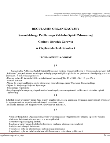 Tekst jednolity Regulaminu Organizacyjnego SPZOZ Gminny Ośrodek Zdrowia Ciepłowody opracowany na podstawie zarządzenia Kierownika nr 4 /2012 z dnia 15 marca 2012r. zatwierdzony uchw Rady Społecznej nr2 /2012 z dnia15 marca 201 REGULAMIN ORGANIZACYJNY Samodzielnego Publicznego Zakładu Opieki Zdrowotnej Gminny Ośrodek Zdrowia w Ciepłowodach ul. Szkolna 4 I.POSTANOWIENIA OGÓLNE §1 Samodzielny Publiczny Zakład Opieki Zdrowotnej Gminny Ośrodek Zdrowia w Ciepłowodach zwany dale „Zakładem” jest podmiotem leczniczym niebędącym przedsiębiorcą i działa na podstawie obowiązujących aktów prawnych , w tym w szczególności: - Ustawy z dnia 15 kwietnia 2011 r. o działalności leczniczej( Dz. U. z 2011 r. Nr 112, poz.654 ) - Statutu Zakładu - Wpisu do rejestru zakładów opieki zdrowotnej prowadzonego przez Wojewodę Dolnośląskiego - Wpisu do Krajowego Rejestru Sądowego - Niniejszego regulaminu - Innych przepisów dotyczących podmiotów leczniczych, a w szczególności publicznych zakładów opieki zdrowotnej §2 1.Zakład został utworzony przez Radę Gminy Ciepłowody, w celu udzielania świadczeń zdrowotnych przez osob do tego uprawnione na podstawie odrębnych przepisów prawa. 2.Siedzibą Zakładu jest miejscowość Ciepłowody ul. Szkolna 4. §3 Niniejszy Regulamin Organizacyjny, zwany w dalszej części ”Regulaminem” określa sposób i warunki udzielania świadczeń zdrowotnych, a w szczególności: 1.struktury organizacyjnej Zakładu 2.rodzaju wykonywanej działalności leczniczej i zakresu udzielanych świadczeń 3.miejsca udzielanych świadczeń 5.wysokości opłat za udostępnianie dokumentacji medycznej 6.wysokości opłat za świadczenia inne niż finansowane ze środków publicznych Regulamin organizacyjny Strona 7.organizację procesu udzielania świadczeń 8.sposób kierowania Zakładem i komórkami organizacyjnymi §4 Ilekroć w niniejszym Regulaminie jest mowa o: 1.Statucie- należy przez to rozumieć Statut Samodzielnego Publicznego Zakładu Opieki Zdrowotnej Gminnego Ośrodka Zdrowia w Ciepłowodach. 2.Kierownika Zakładu- należy przez to rozumieć kierownika zakładu w Samodzielnym Publicznym Zakładzie Opieki Zdrowotnej Gminny Ośrodek Zdrowia w Ciepłowodach w świetle przepisów art.46 ust.1 ustawy o działalności leczniczej 3.Komórce organizacyjnej-należy przez to rozumieć wyodrębnioną w strukturze organizacyjnej Samodzielnego Publicznego Zakładu Opieki Zdrowotnej Gminnego Ośrodka Zdrowia w Ciepłowodach część jednostki organizacyjnej. 4.Świadczeniu zdrowotnym –należy przez to rozumieć działania służące zachowaniu, ratowaniu, przywracaniu i poprawie zdrowia oraz inne działania medyczne wynikające z procesu leczenia lub przepisów odrębnych regulujących zasady ich wykonywania, w szczególności związane z badaniem i poradą lekarską, rehabilitacją leczniczą, opieką nad kobietą ciężarną i jej płodem i połogiem oraz nad noworodkiem , opieką nad zdrowym dzieckiem, badaniem diagnostycznym, pielęgnacją chorych , pielęgnacją niepełnosprawnych i opieką nad nimi orzekaniem i opiniowaniem o stanie zdrowia, zapobieganie powstaniu urazów i chorób poprzez działania profilaktyczne oraz szczepienia ochronne, czynnościami z zakresu zaopatrzenia w przedmioty ortopedyczne i środki pomocnicze. §5 1.Podstawowym rodzajem działalności leczniczej Zakładu jest udzielenie ambulatoryjnych świadczeń zdrowotnych ogółowi ludności gminy Ciepłowody oraz mieszkańców innych ościennych miejscowości zadeklarowanych do Ośrodka Zdrowia w Ciepłowodach. 2.Zakład nie może odmówić udzielenia świadczeń zdrowotnych osobie, która potrzebuje natychmiastowego udzielenia takiego świadczenia ze względu na zagrożenie zdrowia lub życia. §6 Postanowienia Regulaminu obowiązują wszystkich pracowników Zakładu, a także osoby wykonujące świadczenia zdrowotne na rzecz Zakładu na podstawie umów cywilnoprawnych oraz pacjentów. II.PRZEBIEG PROCESU UDZIELANIA ŚWIADCZEŃ OPIEKI ZDROWOTNEJ §7 1.Ambulatoryjne świadczenia zdrowotne obejmują świadczenia podstawowej i specjalistycznej opieki zdrowotne oraz świadczenia z zakresu rehabilitacji leczniczej w sposób zapewniający pacjentom najdogodniejszą formę korzystania. 2.Działalność lecznicza obejmuje też swoim zakresem profilaktykę i promocję zdrowia oraz prowadzenie programów zdrowotnych. §8 1.Świadczenia medyczne wykonywane są osobiście przez osoby wykonujące zawód medyczny spełniające wymagania zdrowotne określone w odrębnych przepisach. 2.Zakład posiada aktualną umowę ubezpieczenia odpowiedzialności cywilnej Regulamin organizacyjny Strona §9 1.Ambulatoryjne świadczenia zdrowotne są udzielane w siedzibie ośrodka zdrowia a przypadku gabinetu medycyny szkolnej w gabinecie profilaktyki i pomocy przedlekarskiej w Zespole Szkół Samorządowych Ciepłowody ul .Szkolna 2. 2.Szczegółowy zakres wykonywanych świadczeń zdrowotnych określają umowy z dysponentami publicznych środków finansowych oraz innymi podmiotami. 3.Świadczenia są udzielane od poniedziałku do piątku w godzinach od 8,00 do 18,00.Szczegółowy harmonogram przyjęć dostępny na tablicy informacyjnej . 4.Pomieszczenia oraz urządzenia Zakładu są zgodnie z rodzajem wykonywanej działalności leczniczej oraz zakresem udzielanych świadczeń zdrowotnych spełniają warunki ogólnoprzestrzenne, sanitarne oraz instalacyjne 5. Wyroby stosowane do udzielania świadczeń zdrowotnych są odpowiednie do rodzaju i zakresu udzielanych świadczeń zdrowotnych § 10 1.Zakład udziela świadczeń zdrowotnych bezpłatnie, za częściową odpłatnością lub odpłatnie, zgodnie z obowiązującymi przepisami , w tym w szczególności z ustawą z dnia 27 sierpnia 2004 r. o świadczeniach opieki zdrowotnej finansowanych ze środków publicznych (Dz. U. Nr 210,poz.2135 z późn.zm.) i zawartymi umowami w tym umowami zawartymi z dysponentami środków publicznych. 2.Wysokość opłat za 