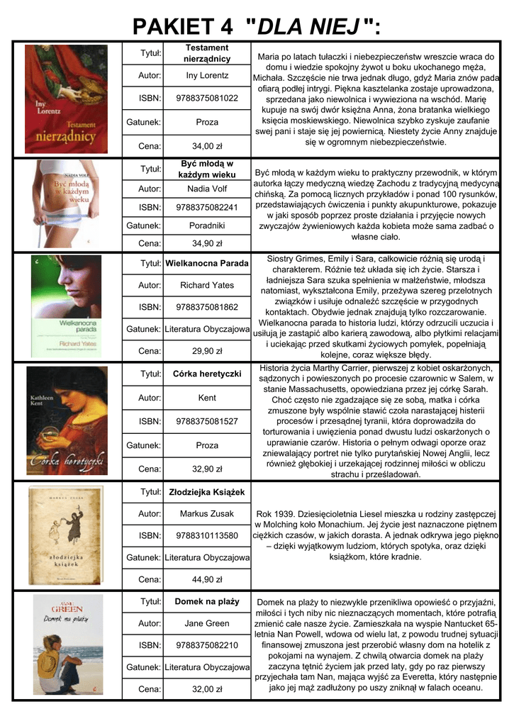 PAKIET 4 "DLA NIEJ ": Tytuł: Testament nierządnicy Autor: Iny Lorentz ISBN: 9788375081022 Gatunek: Proza Cena: 34,00 zł Tytuł: Być młodą w kaŜdym wieku Autor: Nadia Volf ISBN: 9788375082241 Gatunek: Cena: Poradniki 34,90 zł Maria po latach tułaczki i niebezpieczeństw wreszcie wraca do domu i wiedzie spokojny Ŝywot u boku ukochanego męŜa, Michała. Szczęście nie trwa jednak długo, gdyŜ Maria znów pada ofiarą podłej intrygi. Piękna kasztelanka zostaje uprowadzona, sprzedana jako niewolnica i wywieziona na wschód. Marię kupuje na swój dwór księŜna Anna, Ŝona bratanka wielkiego księcia moskiewskiego. Niewolnica szybko zyskuje zaufanie swej pani i staje się jej powiernicą. Niestety Ŝycie Anny znajduje się w ogromnym niebezpieczeństwie. Być młodą w kaŜdym wieku to praktyczny przewodnik, w którym autorka łączy medyczną wiedzę Zachodu z tradycyjną medycyną chińską. Za pomocą licznych przykładów i ponad 100 rysunków, przedstawiających ćwiczenia i punkty akupunkturowe, pokazuje w jaki sposób poprzez proste działania i przyjęcie nowych zwyczajów Ŝywieniowych kaŜda kobieta moŜe sama zadbać o własne ciało. Siostry Grimes, Emily i Sara, całkowicie róŜnią się urodą i charakterem. RóŜnie teŜ układa się ich Ŝycie. Starsza i ładniejsza Sara szuka spełnienia w małŜeństwie, młodsza Richard Yates natomiast, wykształcona Emily, przeŜywa szereg przelotnych związków i usiłuje odnaleźć szczęście w przygodnych 9788375081862 kontaktach. Obydwie jednak znajdują tylko rozczarowanie. Wielkanocna parada to historia ludzi, którzy odrzucili uczucia i Literatura Obyczajowa usiłują je zastąpić albo karierą zawodową, albo płytkimi relacjami i uciekając przed skutkami Ŝyciowych pomyłek, popełniają 29,90 zł kolejne, coraz większe błędy. Tytuł: Wielkanocna Parada Autor: ISBN: Gatunek: Cena: Tytuł: Córka heretyczki Autor: Kent ISBN: 9788375081527 Gatunek: Cena: Proza 32,90 zł Historia Ŝycia Marthy Carrier, pierwszej z kobiet oskarŜonych, sądzonych i powieszonych po procesie czarownic w Salem, w stanie Massachusetts, opowiedziana przez jej córkę Sarah. Choć często nie zgadzające się ze sobą, matka i córka zmuszone były wspólnie stawić czoła narastającej histerii procesów i przesądnej tyranii, która doprowadziła do torturowania i uwięzienia ponad dwustu ludzi oskarŜonych o uprawianie czarów. Historia o pełnym odwagi oporze oraz zniewalający portret nie tylko purytańskiej Nowej Anglii, lecz równieŜ głębokiej i urzekającej rodzinnej miłości w obliczu strachu i prześladowań. Tytuł: Złodziejka KsiąŜek Autor: Markus Zusak Cena: 44,90 zł Tytuł: Domek na plaŜy Rok 1939. Dziesięcioletnia Liesel mieszka u rodziny zastępczej w Molching koło Monachium. Jej Ŝycie jest naznaczone piętnem cięŜkich czasów, w jakich dorasta. A jednak odkrywa jego piękno ISBN: 9788310113580 – dzięki wyjątkowym ludziom, których spotyka, oraz dzięki ksiąŜkom, które kradnie. Gatunek: Literatura Obyczajowa Autor: ISBN: Gatunek: Cena: Domek na plaŜy to niezwykle przenikliwa opowieść o przyjaźni, miłości i tych niby nic nieznaczących momentach, które potrafią Jane Green zmienić całe nasze Ŝycie. Zamieszkała na wyspie Nantucket 65letnia Nan Powell, wdowa od wielu lat, z powodu trudnej sytuacji finansowej zmuszona jest przerobić własny dom na hotelik z 9788375082210 pokojami na wynajem. Z chwilą otwarcia domek na plaŜy zaczyna tętnić Ŝyciem jak przed laty, gdy po raz pierwszy Literatura Obyczajowa przyjechała tam Nan, mająca wyjść za Everetta, który następnie jako jej mąŜ zadłuŜony po uszy zniknął w falach oceanu. 32,00 zł PAKIET 4 "DLA DZIECI I MŁODZIEśY ": Tytuł: Rekreacje Mikołajka Rene Goscinny, Jean Sempe Seria zdobywająca ciągle nowych czytelników w róŜnym wieku. Na pięć zabawnie zilustrowanych ksiąŜek składają się historyjki o ISBN: 9788310117625 szkolnych kolegach i rodzinie, śmiesznie opowiadane przez małego Mikołajka. Gatunek: Bajki i Baśnie Autor: Cena: 22,90 zł Tytuł: Rodzina Penderwicków na Gardam Street Autor: Jeanne Birdsall ISBN: 9788310115645 Gatunek: Bajki i Baśnie Cena: 21,90 zł Tytuł: Opowiadania z Doliny Muminków Autor: Tove Janson ISBN: 9788310112736 Gatunek: 22,10 zł Tytuł: Wampiraci Demony Oceanu Autor: Justin Somper ISBN: 9788310113818 Literatura MłodzieŜowa Cena: 24,90 zł Tytuł: Siedem PoŜarów Mademoiselle Autor: Vilar Esther ISBN: 9788310117915 Gatunek: Cena: Świat Muminków to dolina, w krórej róŜne tajemnicze postacie Paszczaki, Ryjek, Włóczykij, Mała Mi - wiodą Ŝycie dziwnie podobne do zwykłego, a jednak wypełnione baśnią. Bajki i Baśnie Cena: Gatunek: Urocze siostry Penderwick są, jak zwykle, gotowe przeŜyć wielką przygodę! Jednak wyzwanie, jakie stawia przed nimi los, nie jest tym, o czym marzyły. Ciotka Claire, siostra pana Penderwicka, uznaje, Ŝe najwyŜszy czas, Ŝeby zaczął umawiać się na randki i poszukał sobie Ŝony i matki dla swoich córek - a to według dziewczynek oznacza jedno: wielką katastrofę. Pomysłowe rodzeństwo musi więc opracować i czym prędzej wprowadzić w Ŝycie błyskotliwy Plan Uwolnienia Taty. Literatura MłodzieŜowa 34,90 zł Jest rok 2505. Podniósł się poziom oceanów. Nadchodzi nowa era piractwa.Straszliwy sztorm rozdziela bliźnięta Connora i Grace Tempestów, niszczy ich łódź, a ich samych rzuca w okrutne, zimne wody, by walczyli o Ŝycie. Uratowany przez jeden ze słynniejszych statków pirackich, Connor wkrótce zaczyna nosić rapier. Ale czy ma dość charakteru, by zostać piratem? Mademoiselle to zdumiewająco piękna i nieco ekscentryczna francuska guwernantka dwunastoletniej Carloty, córki argentyńskiego dyplomaty. Mimo Ŝe zabiegają o nią najatrakcyjniejsi kawalerowie w mieście, nie okazuje płci przeciwnej najmniejszego zainteresowania. Do czasu... W święta BoŜego Narodzenia choinka Carloty staje w ogniu i na scenę 