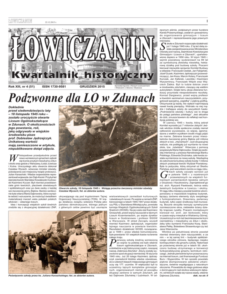 I 22.12.2015 r. ręcznym piśmie, podpisanym przez kuratora Karola Przesmyckiego, został on upoważniony do organizowania gimnazjum i liceum w Zdunach i reprezentowania jego prawnych interesów. zkoła w Zdunach rozpoczęła działalność już 1 lutego 1945 roku. Z tą też datą została zarejestrowana przez Ministerstwo Oświaty pod nazwą „Sejmikowe Koedukacyjne Gimnazjum i Liceum w Zdunach”, upaństwowione dopiero w 1950 roku. W lutym 1945 r. sejmik powiatowy wydzierżawił na 99 lat za symboliczną złotówkę niewielką, hektarową działkę pod budowę szkoły. Pracami kierował niezwykle sprawnie Komitet Budowy w składzie: Franciszek Cieślak, Jan Fabijański, Józef Guzek, Kazimierz Jędrzejczyk (przewodniczący), Jan Koza, Marcin Kolary, Franciszek Kurczak, Jan Kaferski, Leonilda i Kazimierz Wyszomirscy, Franciszek Wójcik oraz Wojciech Żabka. Byli to ludzie dobrze znani w środowisku zduńskim, cieszący się wielkim autorytetem. Dzięki temu akcja zbierania funduszy przyniosła niespodziewane rezultaty. Konrad Dargiewicz, przed wojną profesor w łowickim seminarium nauczycielskim, przygotował specjalną „cegiełkę” z piękną grafiką. Otrzymywał ją każdy, kto wpłacił najmniejszą nawet kwotę pieniędzy. Widniało na niej mądre i trafiające wtedy do wszystkich hasło: „Podniesienie oświaty i kultury wsi to droga do potęgi państwa polskiego”. Jest aktualne do dziś, zmusza bowiem do refleksji nad kondycją polskiej wsi. W czerwcu 1945 r. kwota, którą zebrał Komitet wynosiła już 7 milionów złotych! Jednak wkrótce źródła społeczne zostały niemal całkowicie wyczerpane, co więcej, zgromadzone z wielkim wysiłkiem środki mogły pójść na marne. Zebrane bowiem przez mieszkańców ówczesnej gminy Bąków pół miliona złotych w tzw. „młynarkach”, czyli okupacyjnej walucie, nie podlegały już wymianie na nowe złote, tzw. „lubelskie”. Wówczas z pomocą pospieszyła Maria Dąbrowska. Dzięki jej osobistej interwencji u prezesa Narodowego Banku Polskiego, Edwarda Drożniaka, cała kwota została wymieniona na nową walutę. Niezbędną do zakończenia budowy szkoły kwotę 1 miliona złotych przekazał łowicki Wydział Powiatowy. Była to pożyczka, którą otrzymał od Skarbu Państwa, pod warunkiem zwrotu w ciągu roku. mach szkoły zaczęto wznosić już w połowie 1945 r. z rozebranych i przewiezionych na wiejskich furmankach poniemieckich baraków celnych z Grzybowa i Kaczkowizny. Zaprojektował go inż. arch. Ryszard Pawłowski, twórca wielu świetnych budynków w Łowiczu i okolicy. W ciągu kilku miesięcy powstał świetnie wkomponowany w mazowiecki krajobraz budynek, łączący zarówno elementy stylu swojskiego z funkcjonalizmem. Drewniany, parterowy budynek, tylko część środkową miał murowaną. Boczne skrzydła tworzyły symetrycznie rozmieszczone okna, niebieskie ściany dzieliły brązowe ryzality. Pracami montażowymi kierował inż. arch. Jan Idzikowski, który w czasie wojny mieszkał w Wiskienicy Górnej. Uczestniczyli w nich też bezinteresownie liczni rzemieślnicy i mieszkańcy ze Zdun i okolic, żeby tylko wymienić Franciszka Kozę, Stanisława Pełkę, Bolesława Strasenburga czy też Jana Wierciocha. Wkrótce po południowej stronie powstał również drewniany dom nauczycielski, a za nim – w tej samej linii – budynek spółdzielczego ośrodka zdrowia, będącego niejako kontrapunktem dla gmachu szkoły. Natomiast po przeciwnej stronie już w latach 50. ukończono budowę utrzymanego w konwencji funkcjonalistycznej gmachu technikum rolniczego. Jednak pierwotnie był on przeznaczony na internat liceum, zaś finansował go Fundusz Burs i Stypendiów. W ten sposób powstało pięknie skomponowane założenie urbanistyczne, świetnie współgrające z naturalnym otoczenie. Prowadziła do niego grabowa aleja z dominującymi nad okolica wiekowymi dębami, od których wzięła się nazwa osady, właśnie Dąbrowa Zduńska. dok. na str. II S Rok XIII, nr 4 (51) ISSN 1730-9581 GRUDZIEŃ 2015 Sprzedaż łącznie z Nowym Łowiczaninem i Wieściami z Głowna i Strykowa Podzwonne dla LO w Zdunach Dokładnie przed siedemdziesięciu laty – 18 listopada 1945 roku – zostało uroczyście otwarte Liceum Ogólnokształcące w Zdunach. O okolicznościach jego powstania, roli, jaką odgrywało w wiejskim środowisku pisze prof. Dobiesław Jędrzejczyk. Unikatową wartość mają zamieszczone w artykule, niepublikowane dotąd zdjęcia. listopadowe przedpołudnie przed nowo wzniesionym gmachem zebrali się licznie przybyli mieszkańcy Zdun i okolic oraz goście z Warszawy, Łodzi, Łowicza i Kutna. Uroczystego aktu otwarcia dokonał Czesław Wycech, wówczas minister oświaty, poświęcenia zaś miejscowy ksiądz proboszcz, Julian Karasiński. Władze wojewódzkie reprezentował wojewoda Jan Dąb-Kocioł. Przybył też starosta łowicki Stanisław Kowalewski i kutnowski Kazimierz Kuczer. Byli również przedstawiciele gmin łowickich, placówek oświatowych i spółdzielczych oraz po dwie osoby z każdej wsi ówczesnej gminy Bąków. Bardzo serdecznie była witana Maria Dąbrowska, która wyraziła radość i wzruszenie, że może być świadkiem materializacji marzeń wielu pokoleń polskich włościan – własnego liceum. Idea i koncepcja wiejskich szkół średnich zrodziła się z okupacyjnej działalności ZNP, W G Otwarcie szkoły, 18 listopada 1945 r. Wstęgę przecina ówczesny minister oświaty Czesław Wycech; fot. ze zbiorów autora. ukrywającego się pod kryptonimem Tajnej Organizacji Nauczycielskiej (TON). W kręgu działaczy związku widziano Polskę jako państwo demokratyczne, którego jednym z głównych celów powinno być usunięcie wielowiekowych zaniedbań kulturowych i oświatowych na wsi. Po wojnie w ramach ZNP, kierowanego w latach 1945-1947 przez działaczy PSL-u Stanisława Mikołajczyka, powstała komisja Wiejskich Ogólnokształcących Szkół Średnich (WOSŚ). Na jej czele stal 