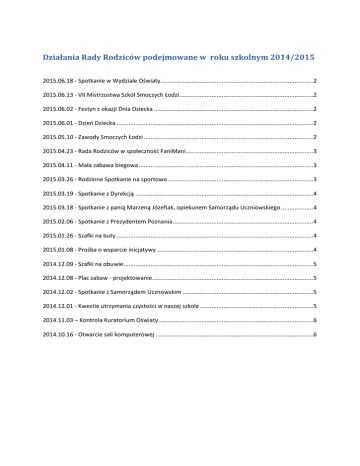 Działania Rady Rodziców podejmowane w roku szkolnym 2014/2015 2015.06.18 - Spotkanie w Wydziale Oświaty .......................................................................................... 2 2015.06.13 - VII Mistrzostwa Szkół Smoczych Łodzi ............................................................................... 2 2015.06.02 - Festyn z okazji Dnia Dziecka .............................................................................................. 2 2015.06.01 - Dzień Dziecka .................................................................................................................... 2 2015.05.10 - Zawody Smoczych Łodzi .................................................................................................... 2 2015.04.23 - Rada Rodziców w społeczność FaniMani ........................................................................... 3 2015.04.11 - Mała zabawa biegowa ....................................................................................................... 3 2015.03.26 - Rodzinne Spotkanie na sportowo ...................................................................................... 3 2015.03.19 - Spotkanie z Dyrekcją ......................................................................................................... 4 2015.03.18 - Spotkanie z panią Marzeną Józefiak, opiekunem Samorządu Uczniowskiego ................... 4 2015.02.06 - Spotkanie z Prezydentem Poznania ................................................................................... 4 2015.01.26 - Szafki na buty .................................................................................................................... 4 2015.01.08 - Prośba o wsparcie inicjatywy ............................................................................................ 4 2014.12.09 - Szafki na obuwie ................................................................................................................ 5 2014.12.08 - Plac zabaw - projektowanie ............................................................................................... 5 2014.12.02 - Spotkanie z Samorządem Ucznowskim ............................................................................. 5 2014.12.01 - Kwestie utrzymania czystości w naszej szkole ................................................................... 5 2014.11.03 – Kontrola Kuratorium Oświaty ........................................................................................... 6 2014.10.16 - Otwarcie sali komputerowej ............................................................................................. 6 2015.06.18 - Spotkanie w Wydziale Oświaty Spotkanie dotyczyło kwestii płatności za zajęcia pływackie dla uczniów klas II i III. Oczekujemy na odpowiedź z Wydziału. 2015.06.13 - VII Mistrzostwa Szkół Smoczych Łodzi W sobotę 13 czerwca na torze regatowym Malta w Poznaniu wśród 360 dzieci z 32 placówek oświatowych (16 szkół podstawowych) wystartowała nasza osada. Zawody odbyły się pod honorowym patronatem Prezydenta Miasta Poznania. Zawody po raz kolejny miały wymiar międzynarodowy. Na specjalne zaproszenie w sobotnich zmaganiach udział wzięły załogi z miast partnerskich Poznania Czech (Brno), Niemiec (Hanover), Słowacji (Bratysława) i Węgier (Gyor). Wszyscy uczestnicy otrzymali oprócz pamiątkowych koszulek, krakersy od firmy Lajkonik. Mieli również okazję wziąć udział w ćwiczeniach oraz posilić się pyszną grochówka oraz słodkościami. Dodatkowo uczniowie bardzo chętnie korzystali z kącika dla dzieci przygotowanego przez animatorów i Michała Maciołka, który zachęcał do uprawiania frisbee. Zapraszamy do oglądnięcia fotorelacji. 2015.06.02 - Festyn z okazji Dnia Dziecka Dziękujemy i gratulujemy wszystkim Uczniom startującym w zawodach biegowych. Osiągnęliście szczyty, pokonaliście siebie, słabość, przeciwności. Dzięki temu każdy w Was osiągnął sukces, który mamy nadzieję, stał się źródłem niezmiennej radości. :) Tak trzymać! Podziękowania także dla Uczniów wspierających i dopingujących swoje koleżanki i kolegów oraz Rodzicom za pomoc w przeprowadzeniu zawodów. 2015.06.01 - Dzień Dziecka Wszystkim uczniom składamy najlepsze życzenia z okazji Dnia Dziecka. Zapraszamy na lody! Rada Rodziców 2015.05.10 - Zawody Smoczych Łodzi 13 czerwca (sobota) na poznańskiej Malcie odbędą się Mistrzostwa Smoczych Łodzi. Nasza szkoła została zgłoszona do regat. Obecnie kompletujemy osadę (10 osób + bębniarz), która reprezentować będzie naszą szkołę. Chętnych uczniów prosimy zgłaszać poprzez e-dziennik (Krzysztof Dimmich, Rada Rodziców) lub e-mail: [email protected]. O przyjęciu do osady będzie decydowała kolejność zgłoszeń. Oczywiście Wszyscy będą bardzo miło widziani na trybunach – doping bardzo się przydaje. Dobra zabawa gwarantowana (mamy doświadczenie z poprzednich lat). Regulamin zawodów Zdjęcia z poprzednich edycji Uczestnicy – uczniowie będą pozostawali pod opieką swoich Rodziców/Opiekunów. Dodatkowo, w tym samym dniu, dla osób powyżej 18 roku życia organizowany jest I Poznań Canoe Challange. Zachęcamy do zgłaszania się na start. Więcej informacji: http://www.poznanskiedragony.pl/regulamin-zawodow/ Reprezentacja Szkoły w latach: 2011, 2012, 2013 i 2014: 2015.04.23 - Rada Rodziców w społeczność FaniMani Szanowni Rodzice, Informujemy, że Rada Rodziców naszej szkoły dołączyła do społeczności FaniMani. Teraz, przy okazji zakupów w Internecie będziecie Państwo mogli wesprzeć działalność na rzecz naszych dzieci. Nie wiąże się to z żadnymi dodatkowymi kosztami. Wystarczy, że wejdziecie na stronę https://fanimani.pl/zbieramy/rada-rodzicow-sp58-poznan/, zarejestrujecie się i zrobicie zakupy w jednym z wielu sklepów współpracujących z FaniMani. Od każdej zawartej przez Państwa transakcji na konto RR wpłynie prowizja, która przeznaczona będz