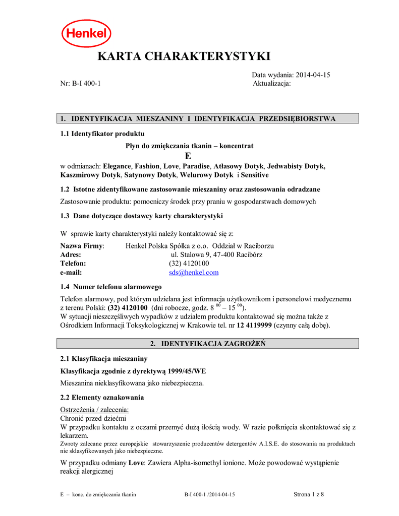 KARTA CHARAKTERYSTYKI Data wydania: 2014-04-15 Aktualizacja: Nr: B-I 400-1 1. IDENTYFIKACJA MIESZANINY I IDENTYFIKACJA PRZEDSI BIORSTWA 1.1 Identyfikator produktu yn do zmi kczania tkanin – koncentrat E w odmianach: Elegance, Fashion, Love, Paradise, At asowy Dotyk, Jedwabisty Dotyk, Kaszmirowy Dotyk, Satynowy Dotyk, Welurowy Dotyk i Sensitive 1.2 Istotne zidentyfikowane zastosowanie mieszaniny oraz zastosowania odradzane Zastosowanie produktu: pomocniczy rodek przy praniu w gospodarstwach domowych 1.3 Dane dotycz ce dostawcy karty charakterystyki W sprawie karty charakterystyki nale y kontaktowa si z: Nazwa Firmy: Adres: Telefon: e-mail: Henkel Polska Spó ka z o.o. Oddzia w Raciborzu ul. Stalowa 9, 47-400 Racibórz (32) 4120100 [email protected] 1.4 Numer telefonu alarmowego Telefon alarmowy, pod którym udzielana jest informacja u ytkownikom i personelowi medycznemu z terenu Polski: (32) 4120100 (dni robocze, godz. 8 00 – 15 00). W sytuacji nieszcz liwych wypadków z udzia em produktu kontaktowa si mo na tak e z rodkiem Informacji Toksykologicznej w Krakowie tel. nr 12 4119999 (czynny ca dob ). 2. IDENTYFIKACJA ZAGRO 2.1 Klasyfikacja mieszaniny Klasyfikacja zgodnie z dyrektyw 1999/45/WE Mieszanina nieklasyfikowana jako niebezpieczna. 2.2 Elementy oznakowania Ostrze enia / zalecenia: Chroni przed dzie mi W przypadku kontaktu z oczami przemy du lekarzem. ilo ci wody. W razie po kni cia skontaktowa si z Zwroty zalecane przez europejskie stowarzyszenie producentów detergentów A.I.S.E. do stosowania na produktach nie sklasyfikowanych jako niebezpieczne. W przypadku odmiany Love: Zawiera Alpha-isomethyl ionione. Mo e powodowa wyst pienie reakcji alergicznej E – konc. do zmi kczania tkanin B-I 400-1 /2014-04-15 Strona 1 z 8 Sk adniki deklarowane zgodnie z za cznikiem VII A do Rozporz dzenia (WE) Nr 648/2004 Parlamentu Europejskiego i Rady z dnia 31 marca 2004 w sprawie detergentów: 5-15 % kationowe rodki powierzchniowo czynne Zawiera kompozycj zapachow i rodki konserwuj ce (Methylchloroisothaiazolinone, Methylisothiazolinone, Octylisothiazolinone) 2.3 Inne zagro enia Brak przy stosowaniu zgodnie z przeznaczeniem i w sposób zgodny z zaleceniami 3. SK AD /INFORMACJA O SK ADNIKACH MIESZANINY Niebezpieczna substancja (klasyfikacja wg dyrektywy 67/548/EWG implementowanej do prawa polskiego w Rozporz dzeniu Ministra Zdrowia z dnia 10.09.2012 r. w sprawie kryteriów i sposobu klasyfikacji substancji chemicznych i ich mieszanin): Zawarto Substancja Symbol [%] Xi >= 5,0 - < 15,0 Produkt reakcji nienasyconych kwasów t uszczowych C10-C20 i C16-C18 z trójetanoloamin , kwaternizowany dimetylosiarczanem >= 1,0 - < 1,5 Izopropanol F, Xi 36/38 91995-81-2 295-344-3 Nr rej. REACH 01-2119463889-16 11, 36, 67 67-63-0 01-2119457558-25 Zwroty R CAS WE 200-661-7 Klasyfikacja niebezpiecznych substancji wg rozporz dzenia (WE) nr 1272/2008 (CLP): produkt reakcji nienasyconych kwasów t uszczowych C10-C20 i C16-C18 z trójetanoloamin , kwaternizowany dimetylosiarczanem: dzia anie dra ni ce na oczy kat. 2, H319; dzia anie dra ni ce na skór kat. 2, H315 izopropanol: ciecz palna kat. 2, H225; dzia anie dra ni ce na oczy kat. 2, H319; dzia anie toksyczne na narz dy docelowe w nast pstwie jednorazowego nara enia kat. 3, H336. Brzmienie zwrotów R i H - patrz sekcja 16 4. RODKI PIERWSZEJ POMOCY 4.1 Opis rodków pierwszej pomocy Ogólna informacja: przy wyst pieniu dolegliwo ci skonsultowa si z lekarzem. Po zanieczyszczeniu oczu: wyp uka oczy pod bie wod (przez 10 minut). Je li to konieczne zasi gn porady okulisty. Po kontakcie ze skór : zanieczyszczone powierzchnie skóry sp uka pod bie wod . Zdj zanieczyszczon odzie . Po wdychaniu: wyprowadzi na wie e powietrze. W przypadku pojawienia si trudno ci z oddychaniem natychmiast zasi gn porady lekarza. Po po kni ciu: nie wywo ywa wymiotów. Natychmiast zasi gn porady lekarza. Wyp uka usta wod (je li poszkodowana osoba jest przytomna). 4.2 Najwa niejsze ostre i opó nione objawy oraz skutki nara enia Po wdychaniu: podra nienie uk adu oddechowego, kaszel. Wdychanie wi kszej ilo ci mo e spowodowa skurcz krtani i skrócony oddech. Po kontakcie ze skór : chwilowe podra nienie skóry Po kontakcie z oczami: chwilowe podra nienie oczu Po po kni ciu: mo e wyst pi podra nienie ust, gard a i uk adu pokarmowego oraz biegunka i wymioty. Wymiociny mog spowodowa uszkodzenie p uc (aspiracja). E – konc. do zmi kczania tkanin B-I 400-1 / 2014-04-15 Strona 2 z 8 4.3 Wskazania dotycz ce wszelkiej natychmiastowej pomocy lekarskiej i szczególnego post powania z poszkodowanym. Po po kni ciu: nie wywo ywa wymiotów. Jednorazowo poda niegazowany napój (woda lub herbata). W przypadku po kni cia wi kszej lub nieznanej ilo ci poda lek przeciwpienny (dimeticon lub simeticon). 5. POST POWANIE W PRZYPADKU PO ARU 5.1 rodki ga nicze: wszystkie powszechnie stosowane. Unika pe nego strumienia wody. Przy gaszeniu po aru nale y wzi pod uwag dodatkowo zalecenia dotycz ce rodków ga niczych odpowiednich do materia ów sk adowanych w pobli u. 5.2 Szczególne zagro enia zwi zane z mieszanin : niebezpiecznymi produktami spalania mog by produkty pirolizy sk adników oraz tlenek w gla. 5.3 Informacje dla stra y po arnej: stosowa indywidualne rodki ochrony oraz izolacyjne aparaty oddechowe. 6. POST POWANIE W PRZYPADKU NIEZAMIERZONEGO UWOLNIENIA DO RODOWISKA 6.1 Indywidualne rodki ostro no ci, wyposa enie ochronne i procedury w sytuacjach awaryjnych Unika po li ni cia na rozlanym produkcie. Unika kontaktu z oczami. 6.2 rodki ostro no ci w zakresie ochrony rodowiska Uniemo liwi przedostanie si do wód powierzchniowych /wód gruntowych. 6.3 Metody i materia y zapobiegaj ce rozprzestrzenianiu si ska enia i s ska enia ce do usuwania Zwi za przy u yciu materia u sorpcyjnego (np. piasku ) i zebra mechanicznie. Pozosta du ilo ci wody. sp uka 6.4 Odniesienia do innych sekcji Patrz: sekcja 8 7. POST POWANIE Z MIESZANINAMI ORAZ ICH MAGAZYNOWANIE 7.1 rodki ostro no ci dotycz ce bezpiecznego post powania Przy prawid 