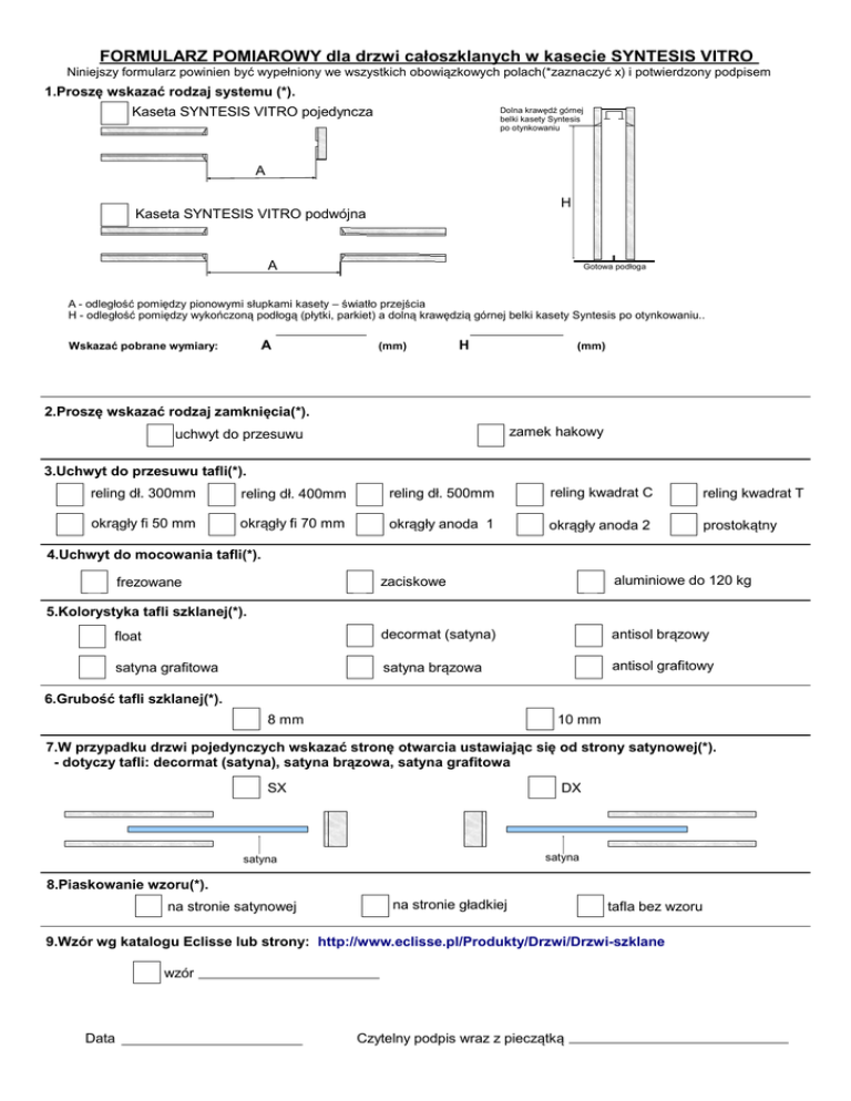 FORMULARZ POMIAROWY dla drzwi całoszklanych w kasecie SYNTESIS VITRO Niniejszy formularz powinien być wypełniony we wszystkich obowiązkowych polach(*zaznaczyć x) i potwierdzony podpisem 1.Proszę wskazać rodzaj systemu (*). Kaseta SYNTESIS VITRO pojedyncza Dolna krawędź górnej belki kasety Syntesis po otynkowaniu A H Kaseta SYNTESIS VITRO podwójna A Gotowa podłoga A - odległość pomiędzy pionowymi słupkami kasety – światło przejścia H - odległość pomiędzy wykończoną podłogą (płytki, parkiet) a dolną krawędzią górnej belki kasety Syntesis po otynkowaniu.. A Wskazać pobrane wymiary: (mm) H (mm) 2.Proszę wskazać rodzaj zamknięcia(*). zamek hakowy uchwyt do przesuwu 3.Uchwyt do przesuwu tafli(*). reling dł. 300mm reling dł. 400mm reling dł. 500mm reling kwadrat C reling kwadrat T okrągły fi 50 mm okrągły fi 70 mm okrągły anoda 1 okrągły anoda 2 prostokątny 4.Uchwyt do mocowania tafli(*). zaciskowe aluminiowe do 120 kg float decormat (satyna) antisol brązowy satyna grafitowa satyna brązowa antisol grafitowy frezowane 5.Kolorystyka tafli szklanej(*). 6.Grubość tafli szklanej(*). 8 mm 10 mm 7.W przypadku drzwi pojedynczych wskazać stronę otwarcia ustawiając się od strony satynowej(*). - dotyczy tafli: decormat (satyna), satyna brązowa, satyna grafitowa SX DX satyna satyna 8.Piaskowanie wzoru(*). na stronie satynowej na stronie gładkiej tafla bez wzoru 9.Wzór wg katalogu Eclisse lub strony: http://www.eclisse.pl/Produkty/Drzwi/Drzwi-szklane wzór Data Czytelny podpis wraz z pieczątką