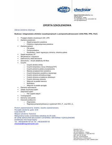 OFERTA SZKOLENIOWA Zakres szkolenia obejmuje: Budowa i diagnostyka silników wysokoprężnych z pompowtryskiwaczami (UIS/PDE, PPD, PLD) • • • • • • • • • • • • • • Przegląd układów wtryskowych UIS i UPS Zasilanie powietrzem. o Zespół przepustnic powietrza o Chłodnice międzystopniowe powietrza Zasilanie paliwem o Filtr paliwa o Pompa podwójna o Rozdzielacz, zawór regulacyjny ciśnienia, chłodnica paliwa Zespół wtryskowy UP Wtryskiwacze i rozpylacze Elektroniczny układ sterowania Denoxtronic – wtrysk dodatkowy AD Blue Czujniki o Czujnik obrotów silnika o Czujnik temperatury cieczy chłodzącej NTC o Czujnik położenia pedału przyśpieszenia o Masowy przepływomierz powietrza o Czujnik temperatury powietrza zasysanego o Czujnik ciśnienia atmosferycznego o Czujnik ciśnienia w kolektorze dolotowym o Czujnik różnicowy ciśnienia o Włącznik na pedale hamulca o Modulatory o Włącznik na pedale sprzęgła Elementy wykonawcze Układy recyrkulacji spalin Zadymienie spalin o Filtr cząstek stałych Turbosprężarki Elementy rzeczywiste Ćwiczenia praktyczne o Diagnostyka o Regulacja pompowtryskiwaczy w systemach EDC_P_ oraz EDC_U_ Poziom zaawansowania- średnio, wysoko zaawansowany Początek szkolenia: godz. 9.00 Czas:około 8h Miejsce szkolenia: Katowice Maksymalna liczba uczestników szkolenia do 20 osób W CENĘ SZKOLENIA WLICZONY CATERING I MATERIAŁY SZKOLENIOWE Dodatkowe informacje/Zapisy: Tel. +48(32)6036142 lub Tel. +48(32)6036143 [email protected] Siedziba firmy: Plac Pod Lipami 5 40-476 Katowice – Polska Kapitał zakładowy: 2.000.000 PLN NIP: 644-30-35-609 NIP UE: PL6443035609 Sąd Rejonowy w Katowicach, Wydział Gospodarczy KRS: 0000012304