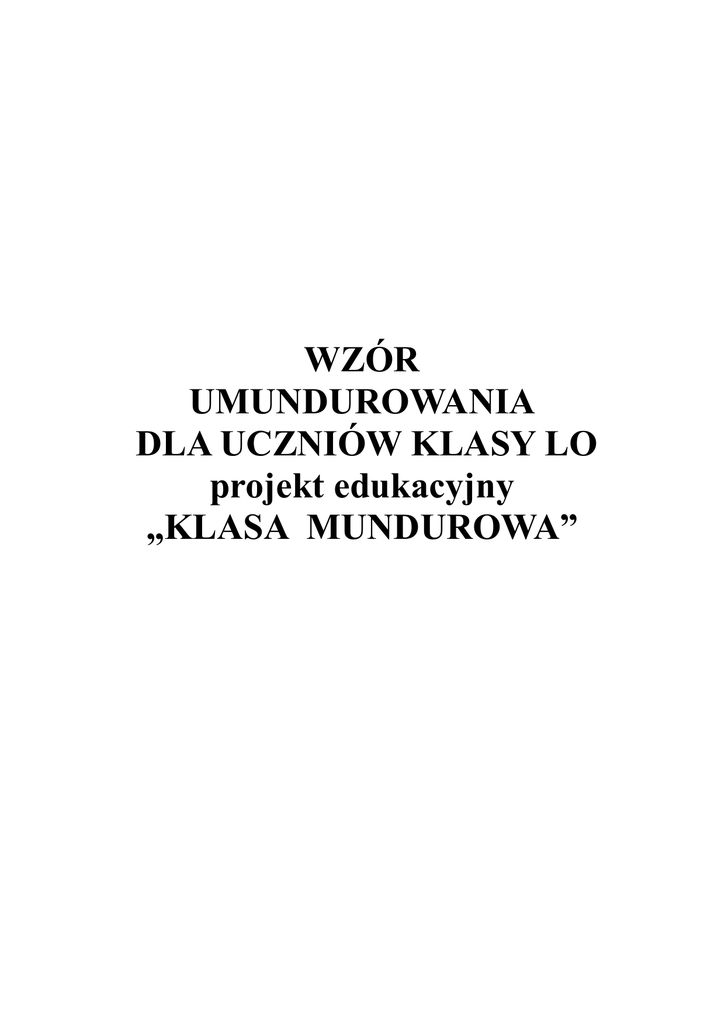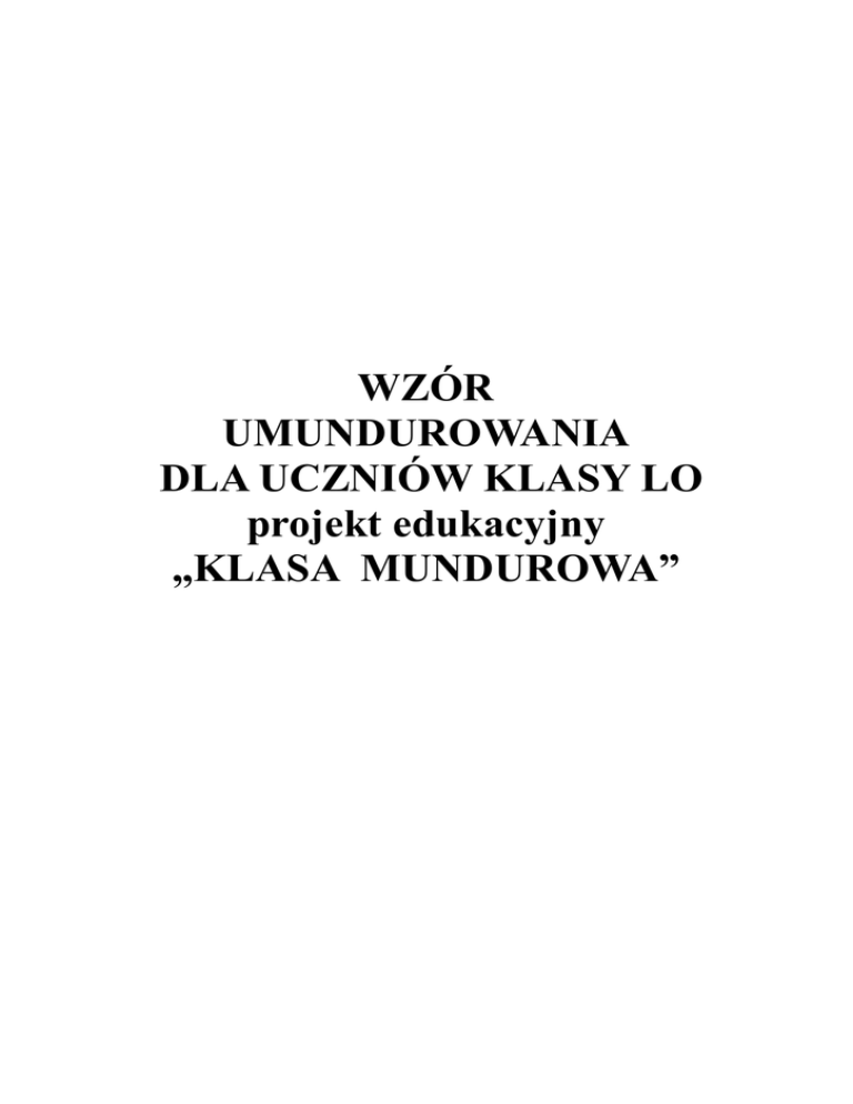 WZÓR UMUNDUROWANIA DLA UCZNIÓW KLASY LO projekt edukacyjny „KLASA MUNDUROWA” Beret Wojska Polskiego - bordowy Bluza moro wzór 2010 spodnie moro wzór 2010 Pas parciany WP - khaki Bluza polarowa Wojska Polskiego Buty taktyczne czarne Flagi Polskie x 2 sztuki Emblemat "Flaga" wz.814/A/MON Koszula letnia moro z flagami UWAGA !!! do kompletnego umundurowania brakują następujące sorty mundurowe: 2 szt koszulki t-shirt kolor zielony z napisem KLASA MUNDUROWA Naszywka szkoły naszywka z nazwiskiem ucznia w/w rzeczy zostaną zorganizowane przez szkołę.