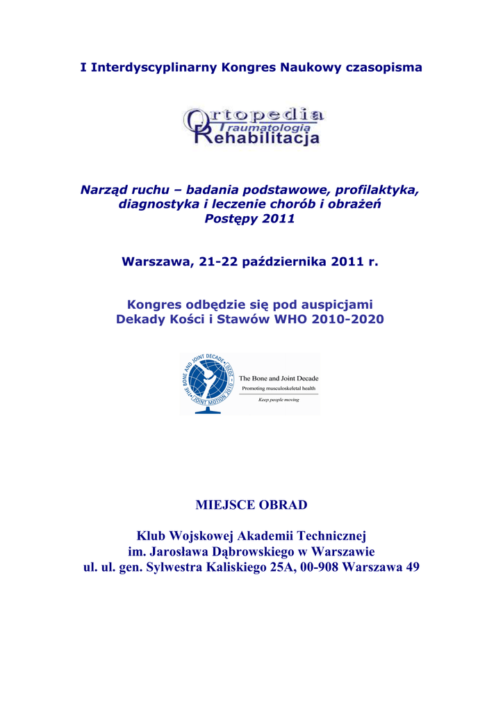 I Interdyscyplinarny Kongres Naukowy czasopisma Narząd ruchu – badania podstawowe, profilaktyka, diagnostyka i leczenie chorób i obrażeń Postępy 2011 Warszawa, 21-22 października 2011 r. Kongres odbędzie się pod auspicjami Dekady Kości i Stawów WHO 2010-2020 MIEJSCE OBRAD Klub Wojskowej Akademii Technicznej im. Jarosława Dąbrowskiego w Warszawie ul. ul. gen. Sylwestra Kaliskiego 25A, 00-908 Warszawa 49 SZCZEGÓŁOWY PROGRAM KONGRESU Piątek, 21 X 2011 r. 9.30-10.15 Część oficjalna 9.30-9.45 Powitanie Gości 9.45-10.15 Wykład Inauguracyjny - Maria Joanna Turos, Warszawa „Historyczne korzenie nowego pojęcia – Evidence-based Medicine w tradycji europejskiej” 10.15-10.30 Wręczenie Nagrody Redaktora Naczelnego OTR Laureatom Konkursu „Praca Roku OTR - Edycja 2010” i prezentacja nagrodzonej pracy SESJE NAUKOWE SESJA I 10.30-12.00 - Postępy w badaniach podstawowych i diagnostyce narządu ruchu Moderatorzy Sesji Przewodniczący: Andrzej Górecki Jolanta Kujawa, Marek Kiljański, Paweł Małdyk, Zygmunt Mierczyk, Zbigniew Śliwiński 10.30-10.50 Komputerowy System Wspomagania Decyzji Medycznych w obszarze diagnostyki i leczenia schorzeń i obrażeń narządu ruchu - Wiesław Tomaszewski, Warszawa, Grzegorz Bliźniuk, Warszawa, Andrzej Czamara, Wrocław, Andrzej Ameljańczyk, Warszawa 10.50-11.10 Komputerowo interpretowalne ścieżki kliniczne w diagnostyce i rehabilitacji narządu ruchu - Grzegorz Bliźniuk, Warszawa, Wiesław Tomaszewski, Warszawa, Andrzej Czamara, Wrocław 11.10-11.25 Algorytm postępowania diagnostyczno terapeutycznego w skoliozach idiopatycznych w Centrum Fizjoterapii w Zgorzelcu - Zbigniew Śliwiński, Zgorzelec 11.25-11.40 Wstępna ocena wyników leczenia skolioz według metody FED na podstawie materiału własnego - Zbigniew Śliwiński, Wojciech Kufel, Bartłomiej Halat, Beata Michalak, Zgorzelec 11.40-12.00 Ocena chodu u chorych po operacji berneńskiej - Szymon Pietrzak, Jarosław Czubak, Małgorzata Syczewska, Otwock 12.00-12.30 Dyskusja 12.30-13.00 - Przerwa kawowa SESJA II 13.00-15.30 Postępy w leczeniu operacyjnym chorób i obrażeń narządu ruchu Moderatorzy Sesji Przewodniczący: Jarosław Czubak Marek Krasuski, Leszek Romanowski, Wojciech Woźniak 13.00-13.30 Algorytm kompleksowego postępowania leczniczego w zespołach inkongruencji stawu biodrowego ze szczególnym uwzględnieniem leczenia usprawniającego - Jarosław Czubak, Agnieszka Stępień, Piotr Marciński, Otwock 13.30-14.00 Nowe spojrzenie na złamanie dalszego końca kości promieniowej – Leszek Romanowski, Poznań 14.00-14.30 Współczesne leczenie lejkowatej klatki piersiowej. Propozycja algorytmu postępowania opartego o wyniki własne – Hanna Kocoń, Andrzej Górecki - Warszawa 14.30-15.00 Postępy w onkologicznej chirurgii rekonstrukcyjnej u dzieci -Wojciech Woźniak, Warszawa 15.00-15.30 Dyskusja 15.30-16.30 Przerwa obiadowa 16.30-17.45 Sesja Kwalifikacyjna Tematów Wolnych Moderatorzy Sesji Przewodnicząca: Krystyna Księżopolska-Orłowska Piotr Majcher, Wiesław Tomaszewski 16.30- 17.30 Dyskusja przy plakatach 17.45- 18.00 Ogłoszenie listy 10 prac, które zostały zakwalifikowane przez Komisję Konkursową do prezentacji w Sesji Multimedialnej Tematów Wolnych 20.00 - Wieczór Towarzyski Sobota, 22 X 2011 r. SESJA III godz. 9.00-11.00 Sesja Multimedialna Tematów Wolnych Moderatorzy Sesji Przewodnicząca: Krystyna Księżopolska-Orłowska Piotr Majcher, Wiesław Tomaszewski 11.00-11.30 - Przerwa kawowa SESJA IV godz. 11.30-14.30 Postępy w leczeniu zachowawczym chorób i obrażeń narządu ruchu Moderatorzy Sesji Przewodnicząca: Jolanta Kujawa Dariusz Białoszewski, Marek Krasuski 11.30-12.00 Wczesne wyniki kompleksowego leczenia operacyjnego i usprawniającego chorych z objawami dyskopatii w odcinku lędźwiowym z wykorzystaniem metody McKenziego w okresie pooperacyjnym. Doniesienie wstępne. - Marek Krasuski, Izabella Nyka, Piotr Tederko, Warszawa 12.00-12.30 Postępy rehabilitacji w zesztywniającym zapaleniu stawów kręgosłupa Krystyna Księżopolska-Orłowska, Warszawa 13.00-13.30 Nowe spojrzenie na rehabilitację medyczną pacjenta ze schorzeniami i obrażeniami narządu ruchu przy współistniejącym wywiadzie onkologicznym Piotr Majcher, Karol Sitarz, Katarzyna Pikto-Pietkiewicz, Lublin 13.30-14.00 Fizykoterapia w rehabilitacji chorych po urazach rządu ruchu - sukcesy i porażki – Jolanta Kujawa, Łódź 14.00-14.30 Dyskusja 14.30-14.45 - Ogłoszenie wyników Sesji Tematów Wolnych 14.45-15.45 - Podsumowanie Kongresu – Dyskusja Okrągłego Stołu „Postęp wiedzy wyznacznikiem nowych kierunków badań naukowych – czyli czego jeszcze nie wiemy, a wiedzieć powinniśmy” Moderator: dr n. med. Dariusz Białoszewski – Redaktor Naczelny czasopisma „Ortopedia Traumatologia Rehabilitacja” Uczestnicy: członkowie Rady Naukowej Kongresu i zaproszeni Goście 15.45 - Zakończenie Kongresu