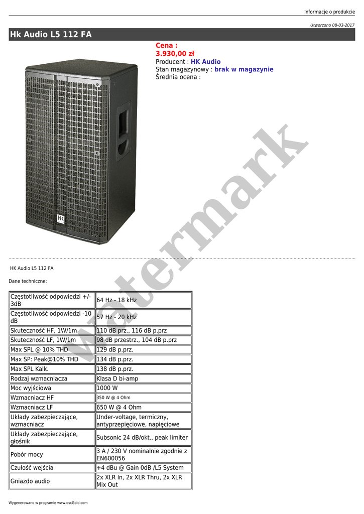Informacje o produkcie Utworzono 08-03-2017 Hk Audio L5 112 FA Cena : 3.930,00 zł er m ar k Producent : HK Audio Stan magazynowy : brak w magazynie Średnia ocena : HK Audio L5 112 FA Dane techniczne: at Częstotliwość odpowiedzi +/64 Hz - 18 kHz 3dB Częstotliwość odpowiedzi -10 57 Hz - 20 kHz dB 110 dB prz., 116 dB p.prz Skuteczność LF, 1W/1m 98 dB przestrz., 104 dB p.prz Max SPL @ 10% THD 129 dB p.prz. Max SP: Peak@10% THD 134 dB p.prz. Max SPL Kalk. 138 dB p.prz. Rodzaj wzmacniacza Klasa D bi-amp Moc wyjściowa 1000 W Wzmacniacz HF 350 W @ 4 Ohm Wzmacniacz LF 650 W @ 4 Ohm Układy zabezpieczające, wzmacniacz Under-voltage, termiczny, antyprzepięciowe, napięciowe Układy zabezpieczające, głośnik Subsonic 24 dB/okt., peak limiter Pobór mocy 3 A / 230 V nominalnie zgodnie z EN600056 Czułość wejścia +4 dBu @ Gain 0dB /L5 System Gniazdo audio 2x XLR In, 2x XLR Thru, 2x XLR Mix Out w Skuteczność HF, 1W/1m Wygenerowano w programie www.oscGold.com Gniazdo zasilania 1x gniazdo IEC z blokadą V-Lock Głośnik LF 1x 12" z cewką 2.5" (4Ohm) Głośnik HF 1" z cewką 1.75" (16Ohm) Częstotliwość crossovera 1,65 kHz, 24 dB/okt, aktywne Gniazdo statywowe DuoTilt Opcje podwieszania 3x M8 Uchwyty 2, zintegrowane Obudowa Hybrydowa (sklejka/mdf) Przedni grill Stalowy grill 2mm Wykończenie Emalia akrylowa, czarna Wymiary (Sz x W x G) 37 x 66,8 x 36,5 cm Waga 23,9 kg w at er m ar k ™ 3/7