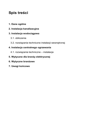 Spis treści 1. Dane ogólne 2. Instalacja kanalizacyjna 3. Instalacja wodociągowa 3.1. obliczenia 3.2. rozwiązania techniczne instalacji wewnętrznej 4. Instalacja centralnego ogrzewania 4.1. rozwiązania techniczne – instalacja 5. Wytyczne dla branŜy elektrycznej 6. Wytyczne branŜowe 7. Uwagi końcowe CZĘŚĆ SANITARNA 1. DANE OGÓLNE Projektowany budynek jest budynkiem kontenerowym, wolnostojącym. Budynek zaprojektowano, jako niepodpiwniczony. Budynek posiada przyłącza wodno – kanalizacyjne z bezodpływowym zbiornikiem na nieczystości płynne o poj. 10 m3 oraz wewnętrzne instalacje sanitarne i c.o. Część instalacyjną zaprojektowano przy załoŜeniu, Ŝe teren pod budowę jest uzbrojony. Inwestor zaleŜnie od warunków terenowych musi wybrać i zlecić zaprojektowanie przyłączy zgodnie z moŜliwościami wynikającymi z usytuowania budynku i uzyskania warunków technicznych od właściwych dla miejsca budowy dysponentów sieci sanitarnych: przedsiębiorstwa wodno- kanalizacyjnego. W budynku w zakresie instalacji zaprojektowano: 1. Instalację kanalizacji sanitarnej; 2. Instalację wody zimnej i ciepłej; 3. Instalację centralnego ogrzewania z zastosowaniem grzejników elektrycznych; Zapotrzebowanie na ciepło c.o.: 5,71 kW 2. INSTALACJA KANALIZACYJNA Pion i odpływ z przyborów projektuje się z rur kształtek kanalizacyjnych PCV łączonych na kielichy z uszczelkami typu wargowego. Podejścia do przyborów sanitarnych montować w bruzdach ścian lub na ścianach wewnętrznych. Średnice podejść i spadki według rysunków i obowiązujących norm. Pion kanalizacji sanitarnej zakończono zaworem napowietrzającym. Zawór naleŜy montować pionowo. Minimalna wysokość od zaworu do najwyŜej połoŜonego przelewu powinna wynosić nie miej niŜ 10 cm. Pod pionami kanalizacyjnymi zamontować rewizje (czyszczaki). Przejścia przez ławy fundamentowe naleŜy wykonać w rurze ochronnej uszczelnionej elastycznym szczeliwem. Poziome przewody układa się ze spadkiem pokazanym na rysunkach nie mniej niŜ 1%. Ścieki z budynku odprowadzone będą przez studzienkę PVC DN 425 rewizyjną do bez odpływowego zbiornika na nieczystości płynne o pojemności 10 m3 (oddzielne opracowanie) w ilości równej dostawie wody. -1- Po wykonaniu całości instalacji kanalizacyjnej i przed zasypaniem przyłącza dokonać prób na szczelność i odbioru przyłącza przez przedstawiciela PWiK. Odprowadzenie wód deszczowych z dachu budynku rozprowadzić po terenie lub zagospodarować na potrzeby własne. 3. INSTALACJA WODOCIĄGOWA Zasilanie w wodę przewiduje się z sieci wodociągowej DN 90 biegnący w ulicy i rurą polietylenową PEHD Ø 32 wg oddzielnego opracowania.. Minimalne przykrycie wodociągu powinno wynosić 1,5. Spadek w kierunku połączenia min 3‰. Dno wykopu naleŜy oczyścić. Pod przewód wodociągowy wykonać posypkę z piasku o grubości 0,20 m, a nad wodociąg – nasypka z piasku o grubości 0,20 m. WzdłuŜ linii przyłącza naleŜy pozostawić wolny tzn. niezagospodarowany, niezadrzewiony pas terenu. 3.1. Obliczenia Zapotrzebowanie na wodę (Rozporządzenie Ministra Infrastruktury z dn. 14.01.2002r. Dz.U. Nr 8) Ilość pracowników 15 osób Norma zuŜycia wody na pracownika: 30 dm3/ (Pracownik x d) Mycie powierzchni 88m2 x 1,5 dm3 Średnie dobowe zapotrzebowanie wody: Qśr = (15 x 30)+(88 x 1,5) = 582dm3/d Średni dobowy zrzut ścieków bytowych: 582 dm3/d = 0,6 m3 Maksymalne dobowe zapotrzebowanie na wodę 582 dm3/d x 1,5 = 873 dm3/ d = 0,9 m3/ d Normatywny wypływ z punktów czerpalnych: ∑ qn = 0,69dm3/s q = 0,43712 dm3/s 1,57363 m3/h Dobrano wodomierz jednostrumieniowy Js DN 20 o przepływie nominalnym Qn=1,5 3 m /h z zaworami odcinającymi oraz zaworem zwrotnym antyskaŜeniowym EA dn 20. 3.2. Rozwiązania techniczne instalacji wewnętrznej Projektuje się wykonanie instalacji z rur warstwowych w systemie firmy Aquatherm. Przewody naleŜy prowadzić pod posadzką oraz na ścianach budynku, -2- w warstwie podposadzkowej ocieplenia lub w otulinie z pianki poliuretanowej. Zasady montaŜu rur – zgodnie z instrukcją montaŜu producenta systemu. Podejścia do przyborów naleŜy wykonać za pomocą kształtek. Zamontować wodomierz skrzydełkowy. Przed i za wodomierzem naleŜy zamontować zawory odcinające w tym jeden upustowy oraz zawór zwrotny antyskaŜeniowy typu EA (np. firmy Honeywell) wg wymagań normy PN- EN 1717: 2003. Urządzenie musi być łatwo dostępne i zabezpieczone przed wpływem niskiej lub wysokiej temperatury. Woda ciepła przygotowywana będzie w elektrycznym podgrzewaczu pojemnościowym o poj. 0,1m3 wyposaŜonym w grzałkę elektryczną o mocy 4,5 k układ zabezpieczyć naczyniem wzbiorczym przeponowym o poj 5 dcm3 oraz grupą bezpieczeństwa z zaworem bezpieczeństwa o nastawie 4,0 bara. Zamontować filtr z odstojnikiem przed grupą bezpieczeństwa. Po montaŜu instalacji wody wykonać próby na szczelność i ciśnienie zgodnie z wytycznymi producenta i obowiązującymi Polskimi Normami. 4. INSTALACJA CENTRALNEGO OGRZEWANIA Instalację zaprojektowano, jako instalację centralnego ogrzewania opartą na zastosowaniu grzejników elektrycznych. Przyjęto do obliczeń parametry: - Współczynniki przenikania ciepła U [W/(m2*K)] poszczególnych przegród (wg proj. architektury): ściany zewnętrzne: 1,67 stropodach: 0,88 okna (szyby zespolone): 1,5 okna połaciowe (szyby zespolone): 1,5 podłoga na gruncie 0,31 - III strefa klimatyczna - Lokalizacja: wejście główne- wiatrołap- od strony S Obliczeniowe zapotrzebowanie ciepła budynku Φ = 5,71 kW 4.1. Rozwiązania techniczne- instalacja Grzejniki zasilane będą zgodnie z dokumentacją elektryczną dostarczoną przez producenta. Sterowanie za pomocą centralnego panela sterowniczego termostatów pomieszczeniowych z zastosowaniem kontrolera obciąŜenia sieci. -3- oraz Zastosować grzejniki np. ONE DOMO o mocach podanych w części rysunkowej opracowania. 5. WYTYCZNE DLA BRANśY ELEKTRYCZNEJ Prz