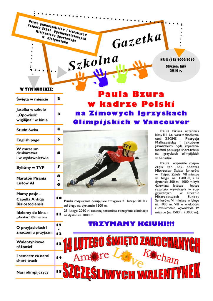 Pism o gim Zesp nazj ołu Szkó al istów i l ł Mist rzos Ogólnok icealistó twa szta łcąc w Sp w B ych iałym ortoweg o stok u Sz W TYM NUMERZE: Święta w mieście 2 Jasełka w szkole ,,Opowieść wigilijna” w kinie 3 Studniówka 4 English page 5 W muzeum drukarstwa i w wydawnictwie 6 Byliśmy w TVP 7 Maraton Pisania Listów AI 8 9 Mamy pasje Capella Antiqa Bialostociensis Idziemy do kina ,,Avatar” Camerona 10 a k t e Ga z a n l o k NR 3 (18) 2009/2010 Pa u la Bzura w kad rze Po ls ki na Zimowych I grzy skach Olimpijskich w Vanco uver Paula rozpocznie olimpijskie zmagania 21 lutego 2010 r. od biegu na dystansie 1500 m. 25 lutego 2010 r. zostaną natomiast rozegrane eliminacje 11 na dystansie 1000 m. 12 O przyjaciołach i znaczeniu przyjaźni 13 Walentynkowe róŜności 13 I semestr za nami short-track 14 Nasi olimpijczycy 15 Styczeń, luty 2010 r. Paula Bzura uczennica klasy III La wraz z absolwentami ZSOMS - Patrycją Maliszewską i Jakubem Jaworskim będą reprezentantami polskiego short-tracku na igrzyskach olimpijskich w Kanadzie. Paula wspaniale rozpoczęła ten rok podczas Mistrzostw Świata Juniorów w Taipei. Zajęła VII miejsce w biegu na 1500 m, a na dystansie 500 m i 1000 m była dziewiąta. Jeszcze lepsze rezultaty wywalczyła w rozgrywanych w Dreźnie Mistrzostwach Europy Seniorów: VI miejsce w biegu na 1000 m, VIII w wieloboju i dwukrotnie wywalczyła IV miejsce (na 1500 m i 3000 m). TRZYMAMY KCIUKI!!! K ch am PISMO GIMNAZJALISTÓW I LICEALISTÓW ZSOMS W BIAŁYMSTOKU Zdarzyło się... 14 stycznia 1942 r. Pierwszy lot śmigłowcem 9 stycznia 1992 r. Odkrycie planet poza Układem Słonecznym Współczesny, ostatecznie przyjęty model śmigłowca stworzył Igor Sikorsky. Jego główną innowacją było umieszczenie na ogonie małego śmigła, zapobiegającego rotacji maszyny. Pierwszy lot tego śmigłowca, nazwanego R-4, datowany jest na 14 stycznia 1942 r. Od 1943 r. były one uŜywane przez amerykańską armię i flotę. O istnieniu planet poza układem Słonecznym świat po raz pierwszy usłyszał 9.01.1992 r., kiedy brytyjskie pismo naukowe „Nature” umieściło informację, Ŝe polski astronom Aleksander Wolszczan odkrył dwie planety krąŜące wokół odległego o 1300 lat świetlnych od nas pulsara PSR B1257+2. 2010 r. Rok Fryderyka Chopina Fryderyk Chopin urodził się 1 marca lub (według niektórych historyków) 22 lutego 1810 r. we wsi śelazowa Wola na Mazowszu. Sejm RP ogłosił rok 2010 Rokiem Chopinowskim. 7 stycznia 2010 r. Minister Kultury i Dziedzictwa Narodowego, Bogdan Zdrojewski uroczyście zainaugurował jego obchody w Filharmonii Narodowej w Warszawie. Oprac. Kamila Golc I Gb Święta w mieście... 17 grudnia 2009 r. uczniowie PG 8 wybrali się do kina Forum. Tym razem nie oglądaliśmy filmu, ale przedstawienia prezentowane w Wojewódzkim Przeglądzie Jasełek i uczestniczyliśmy w rozstrzygnięciu konkursu plastycznego pt. „Tradycje świąt BoŜego Narodzenia na Podlasiu”. Uroczystość organizowali: Akcja Katolicka Archidiecezji Białostockiej, Wydział Katechetyczny Archidiecezji Białostockiej, Białostocki Ośrodek Kultury, MłodzieŜowy Dom Kultury w Białymstoku oraz Zespół Szkół Ogólnokształcących Mistrzostwa Sportowego w Białymstoku. Na początku spotkania ogłoszono wyniki konkursu plastycznego. Niestety, jury konkursowe nie wyróŜniło twórczości plastycznej uczniów PG 8, ale nam podobały się prace naszych kolegów pokazane na wystawie. W przeglądzie jasełek brały udział zespoły ze szkół podstawowych, gimnazjów oraz szkół ponadgimnazjalnych. Pierwszy był spektakl, zagrany przez dzieci ze szkoły podstawowej w Juchnowcu Górnym. Drugi, z PG 14 pokazywał ludzi tak zapracowanych, Ŝe zapomnieli nawet o… świętach BoŜego Narodzenia. Jednak, jak to w teatrze, wszystko skończyło się szczęśliwie. Nam najbardziej podobał się trzeci spektakl. Zagrała go młodzieŜ oraz nauczyciele z Zespołu Szkół nr 16 w Białymstoku. Widownia śmiała się z zabawnych bohaterów, a aktorzy nawet brzmieniem głosu potrafili rozbawić nas do łez. Po zakończeniu przeglądu jasełek obejrzeliśmy piękną wystawę prac plastycznych przesłanych na konkurs. Gabrysia Kostecka, Natalka Wojno IGb Str. 2 GAZETKA SZKOLNA NR 3(18) 2009/2010 (STYCZEŃ, LUTY) Str. 3 ...i w szkole Zgodnie z tradycją, ostatniego dnia przed przerwą świąteczną mieliśmy okazję obejrzeć szkolne jasełka. Nasi koledzy, rezygnując z typowej konwencji jasełkowej, zaprezentowali bardzo współczesną wersję tego, co zdarzyło się w Betlejem ponad 2 tysiące lat temu. Jak co roku zobaczyliśmy na scenie, Ŝe Herodowi (mimo współpracy z szatanem i diablątkami) nie udało się zapobiec cudowi narodzin Jezusa. Nowonarodzone dzieciątko przyniosło światu wiarę, nadzieję i miłość. Jednak w wersji naszych gimnazjalistów towarzyszyły temu radosnemu wydarzeniu dość niezwykłe okoliczności – Trzej Królowie sprzeczali się z pastuszkami, którzy w kolejnych scenach ,,szpanowali” krótkofalówkami! Twórcom jasełek nie brakowało poczucia humoru. Świąteczne przedstawienie było wynikiem współpracy osiemnastoosobowego zespołu uczniów PG 8 z reŜyserem - panią ElŜbietą Rogowską. Narratorka - Paula Milewska z klasy II Ld – oprócz umiejętności aktorskich zaprezentowała teŜ zdolności wokalne, pięknie śpiewając kolędy. Aktorom udała się trudna sztuka - widzowie nie nudzili się podczas przedstawienia, a po wyjściu z sali z uznaniem komentowali to, co obejrzeli. Na pochwałę zasłuŜyły: aktorska gra naszych kolegów, kostiumy i błękitno-złota scenografia. Jednym słowem - tegoroczne jasełka bardzo mi się podobały! Edyta Puchalska III Le Wykonawcy: Narrator - Paula Milewska (II Ld); Aniołowie – Marta Popławska i Ada Zielik (II Gb); Pasterze – Piotrek Dobrowolski, Łukasz Szczerbiński, Jakub Juźba (IIgB); Trzej Królowie – Dawid Grzybowski (III Gc), Martyna Leszczyńska, Maciej Grycel (II 