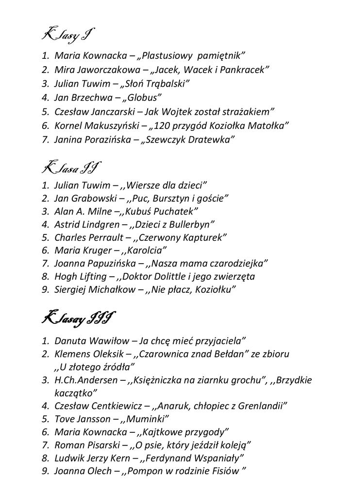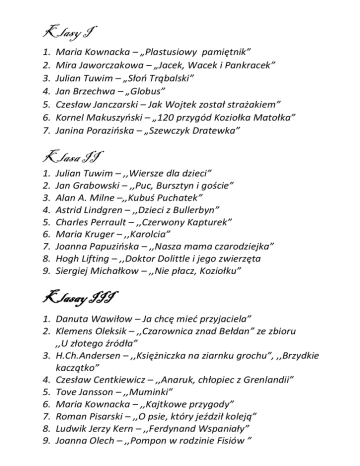 Klasy I 1. 2. 3. 4. 5. 6. 7. Maria Kownacka – „Plastusiowy pamiętnik” Mira Jaworczakowa – „Jacek, Wacek i Pankracek” Julian Tuwim – „Słoń Trąbalski” Jan Brzechwa – „Globus” Czesław Janczarski – Jak Wojtek został strażakiem” Kornel Makuszyński – „120 przygód Koziołka Matołka” Janina Porazińska – „Szewczyk Dratewka” Klasa II 1. 2. 3. 4. 5. 6. 7. 8. 9. Julian Tuwim – ,,Wiersze dla dzieci” Jan Grabowski – ,,Puc, Bursztyn i goście” Alan A. Milne –,,Kubuś Puchatek” Astrid Lindgren – ,,Dzieci z Bullerbyn” Charles Perrault – ,,Czerwony Kapturek” Maria Kruger – ,,Karolcia” Joanna Papuzińska – ,,Nasza mama czarodziejka” Hogh Lifting – ,,Doktor Dolittle i jego zwierzęta Siergiej Michałkow – ,,Nie płacz, Koziołku” Klasay III 1. Danuta Wawiłow – Ja chcę mieć przyjaciela” 2. Klemens Oleksik – ,,Czarownica znad Bełdan” ze zbioru ,,U złotego źródła” 3. H.Ch.Andersen – ,,Księżniczka na ziarnku grochu”, ,,Brzydkie kaczątko” 4. Czesław Centkiewicz – ,,Anaruk, chłopiec z Grenlandii” 5. Tove Jansson – ,,Muminki” 6. Maria Kownacka – ,,Kajtkowe przygody” 7. Roman Pisarski – ,,O psie, który jeździł koleją” 8. Ludwik Jerzy Kern – ,,Ferdynand Wspaniały” 9. Joanna Olech – ,,Pompon w rodzinie Fisiów ” 10. Wanda Markowska – ,,Baśnie z dalekich wysp i lądów, baśń ,,Kto jest najpotężniejszy na świecie” 11. ks. Jan Twardowski – ,,Patyki i patyczki” 12. Mira Jaworczakowa – ,,Oto jest Kasia” Klasa 4a 1. 2. 3. 4. 5. 6. „Akademia pana Kleksa” – J. Brzechwa(X) „Pinokio” – C. Collodi „Przygody Tomka Sawyera” – M. Twain ,,Mikołajek”(wybór) – Sempe Jean-Jacques „Opowiesci z Narnii ”cz. I – C. S. Lewis ,,Bracia Lwie Serce” – A. Lindgren Klasa 4b 1. 2. 3. 4. 5. „Akademia pana Kleksa” – J. Brzechwa „Pinokio” – C. Collodi (X) ,,Opowieści z Narnii” cz. I – C. S. Lewis ,,Bracia Lwie Serce” – A. Lindgren ,,Mikołajek” – Sempe Jean-Jacques Klasa 5a 1. 2. 3. 4. 5. „W pustyni i w puszczy” – H. Sienkiewicz ,,Chłopcy z Placu Broni” – Ferenc Molnár (14 X) „Tomek w krainie kangurów” – A. Szklarski ,,Bracia Lwie Serce” – A. Lindgren ,,Szatan z siódmej klasy” – K. Makuszyński Klasa 5b 1. 2. 3. 4. 5. ,,Chłopcy z Placu Broni” – Ferenc Molnár (X) „Tajemniczy ogród” – A. Burnet „Przygody Tomka Sawyera” – M. Twain „W pustyni i w puszczy” – H. Sienkiewicz „Mitologia”(wybór mitów) – J. Parandowski Klasa 6a 1. 2. 3. 4. 5. 6. „Ania z Zielonego Wzgórza” – L. M. Montgomery (X) „Ten obcy” – I. Jurgielewiczowa ,,Szatan z siódmej klasy” – K. Makuszyński ,,Bajki robotów” – S. Lem „Sposób na Alcybiadesa” – E. Niziurski Lektura do wyboru Klasa 6b 1. 2. 3. 4. „Ten obcy” – I. Jurgielewiczowa (X) ,,Robinson Cruzoe” – D. Defoe „Ania z Zielonego Wzgórza” – L. M. Montgomery „Sposób na Alcybiadesa” – E. Niziurski 5. „Tajemniczy ogród” – A. Burnet 6. ,,Hobbit czyli tam i z powrotem” – R. R. Tolkien